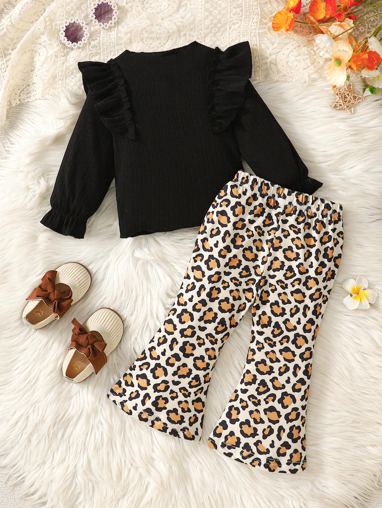 Cute and Trendy Clothes: This two piece outfits for girls includes a ruffle shirt with sweet ruffle details along the chest,neckline,and back that add just the right amount of charm without being too fussy,and bell bottom pants with elastic waist. Your little princess will love such a cute outfit!