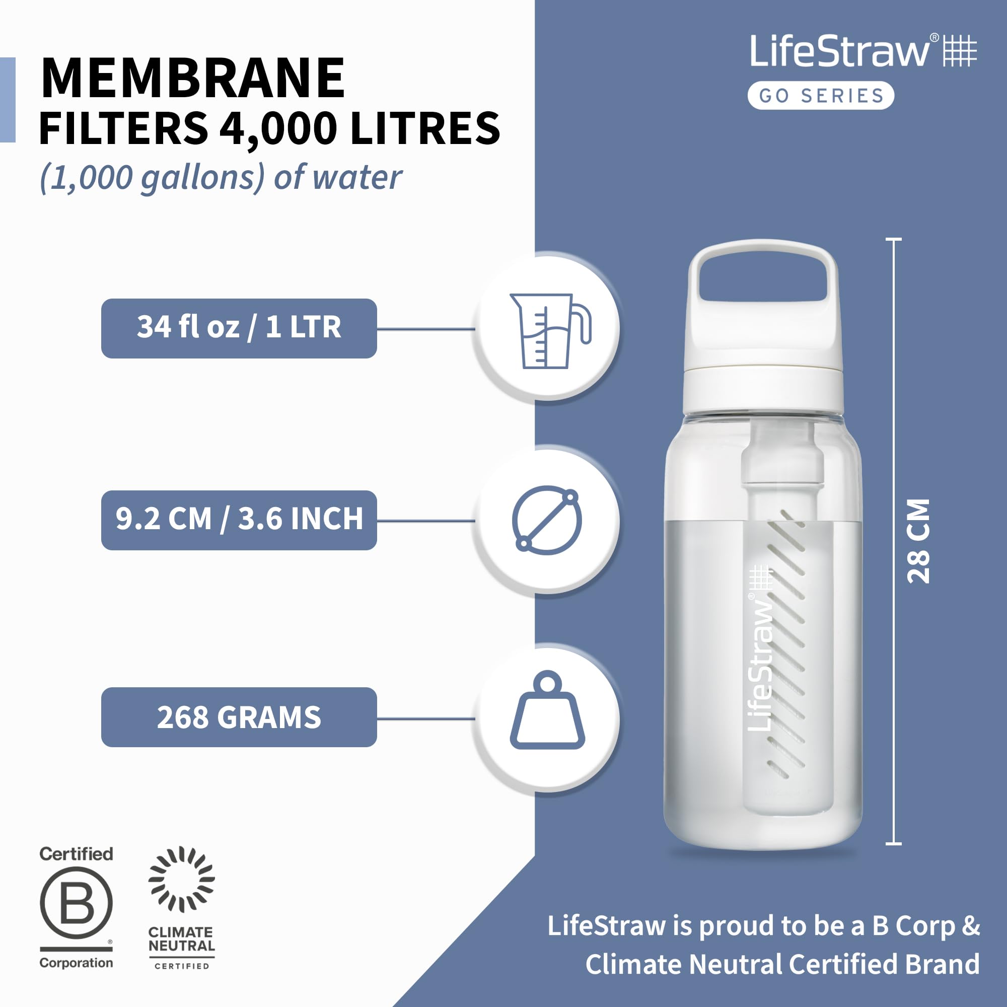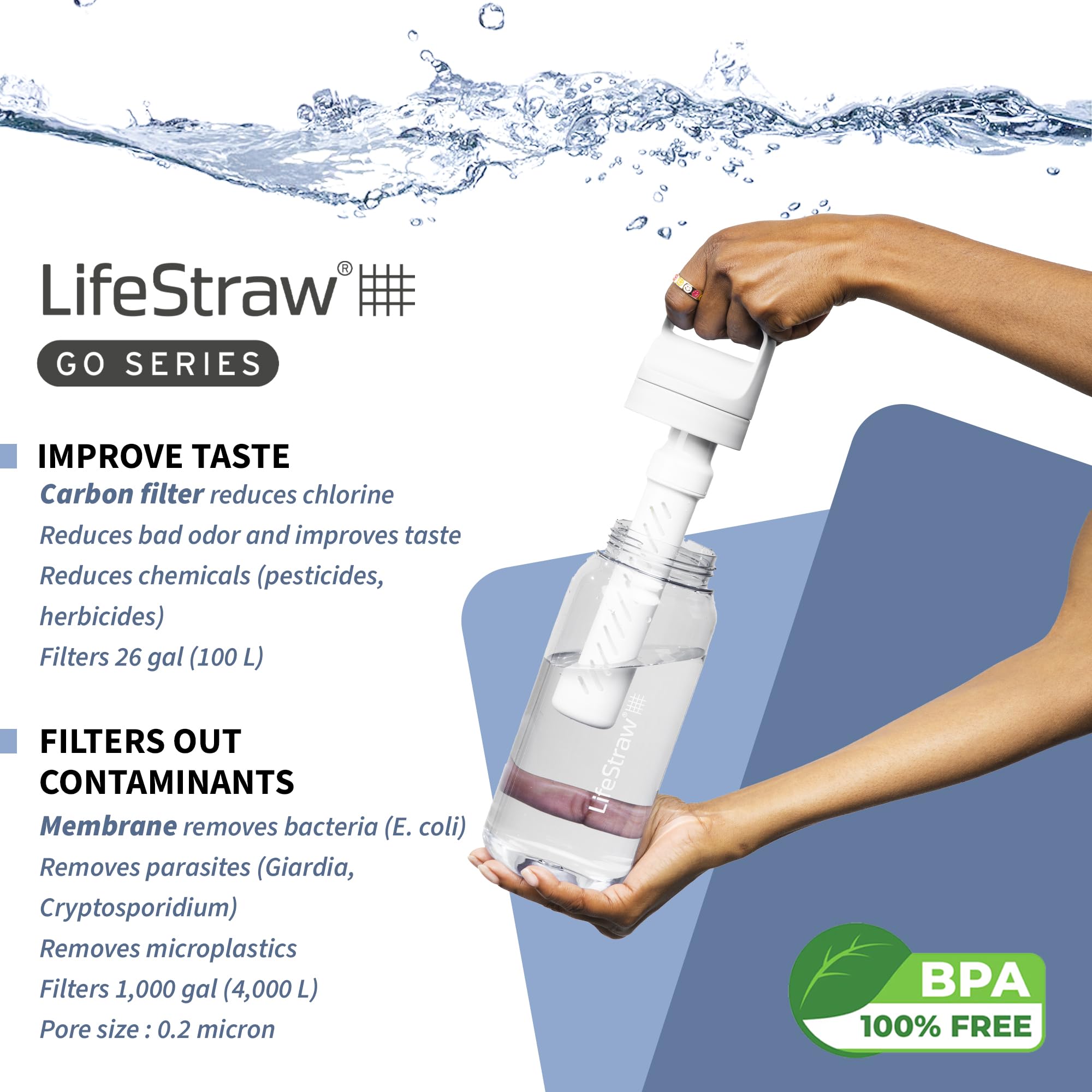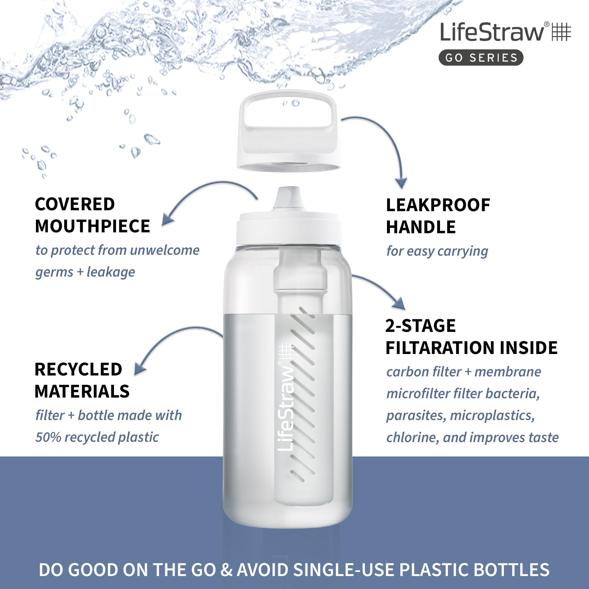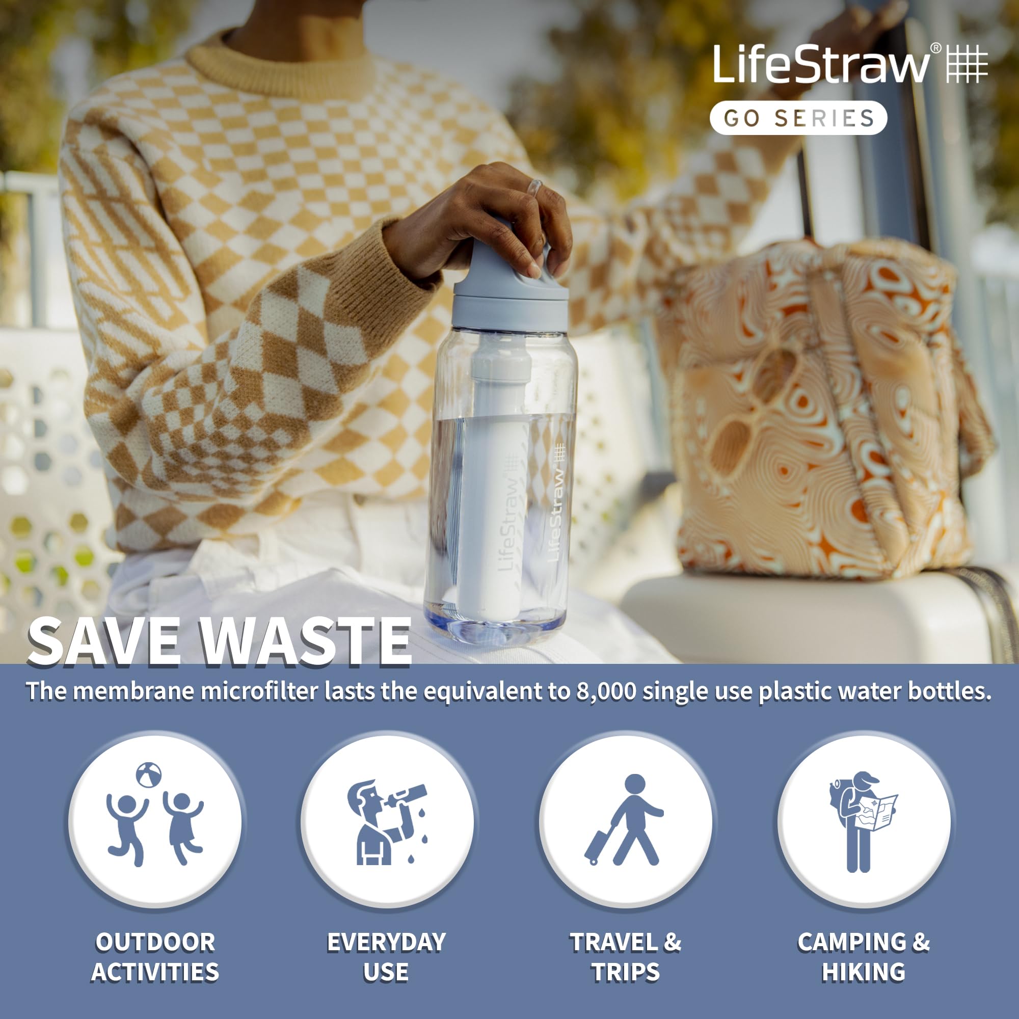 LifeStraw Go Series is the ultimate sidekick for safer, better-tasting water for travel and everyday use. The BPA-free bottle filters out nasties, so you can fill up from airport bathrooms, a tap in Mexico, or a gas station while road-tripping. The advanced 2-stage filter improves taste and protects against bacteria, parasites, microplastics, chlorine, silt, sand, and cloudiness. The BPA-free bottle is made from 50% post -consumer recycled plastic. Do good on the go and avoid single-use plastic bottles. For every purchase, a child in need receives to safe drinking water for a year.