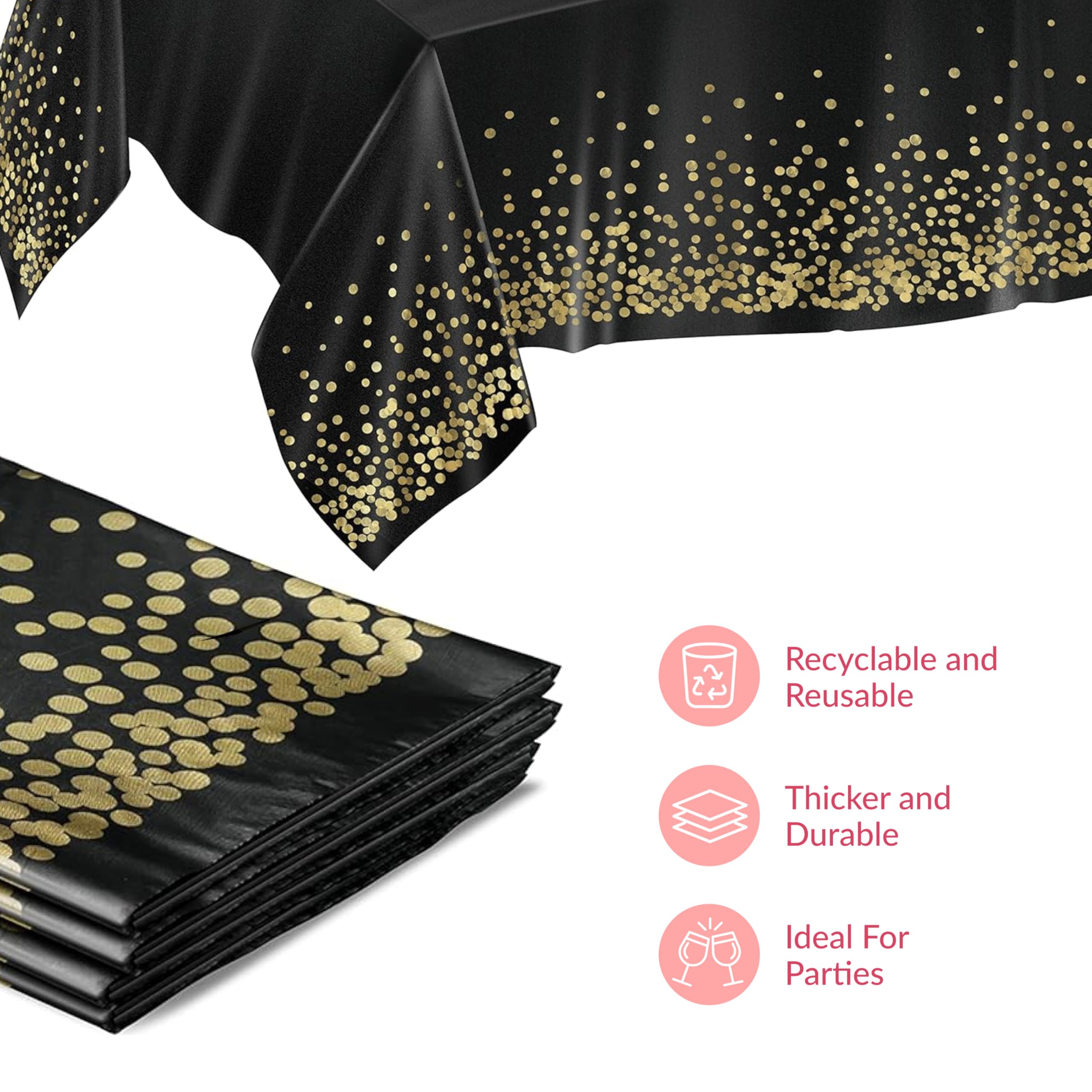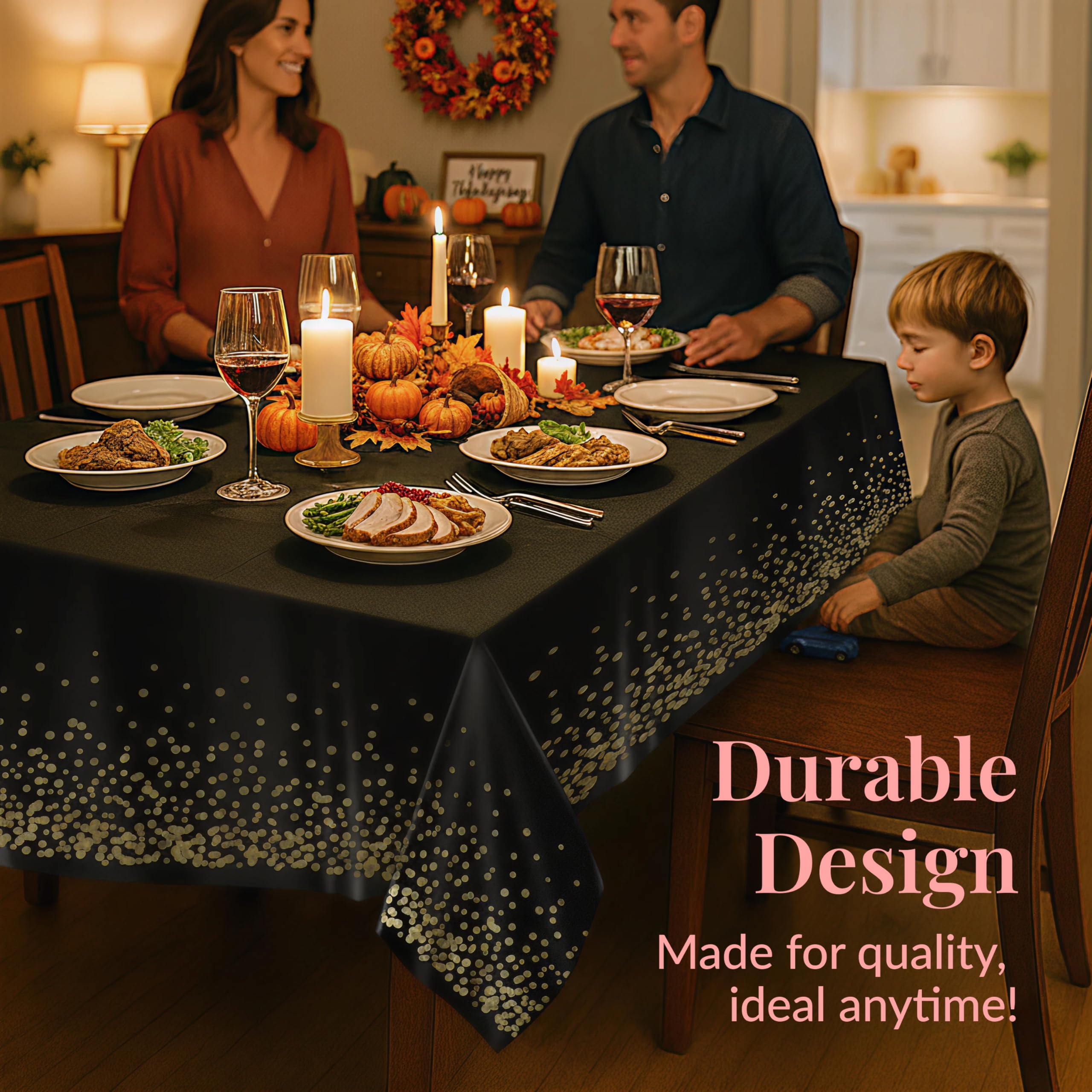 Elegant Party Finish: These festive black and gold party decorations elevate birthdays, banquets, and receptions; each black table cloth adds sophistication and charm to any celebration setup