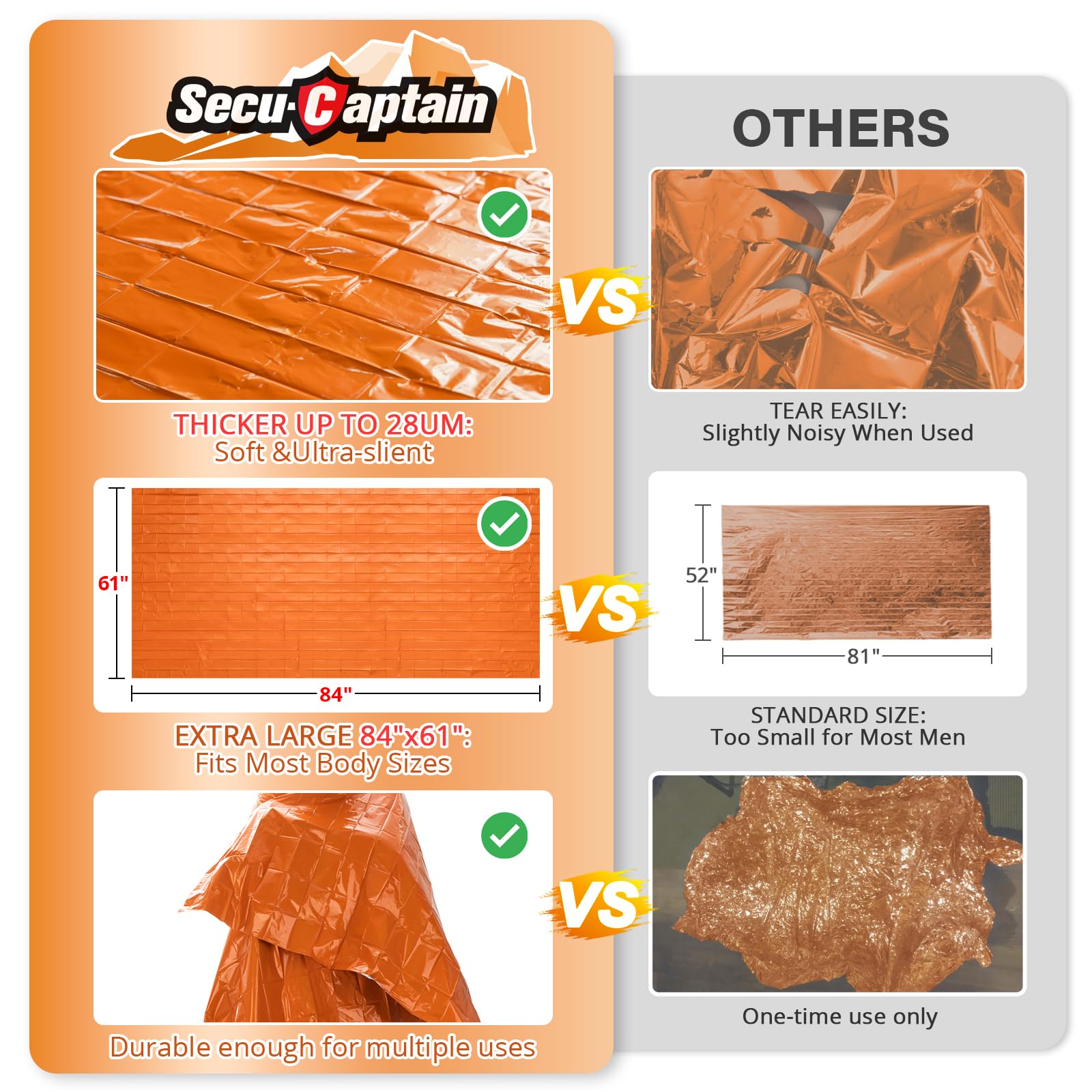 THICKER 28-MICRON MYLAR: Premium high-strength aluminized Mylar, twice as thick as standard blankets, reflects 90% of body heat, preventing hypothermia. Unlike noisy standard blankets, this 28-micron lower-noise, robust Mylar ensures superior insulation, vital for survival kits