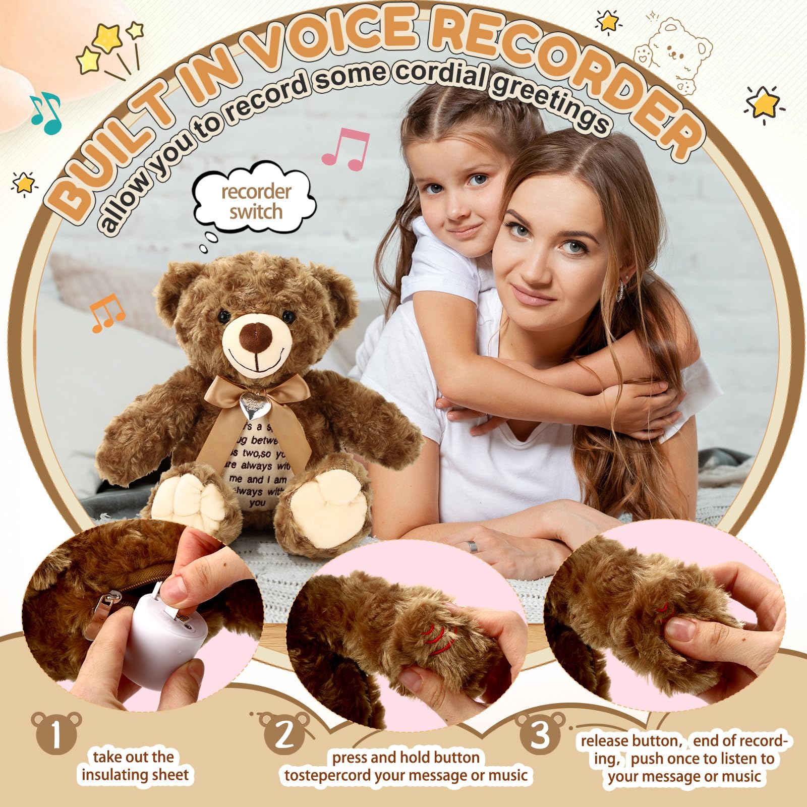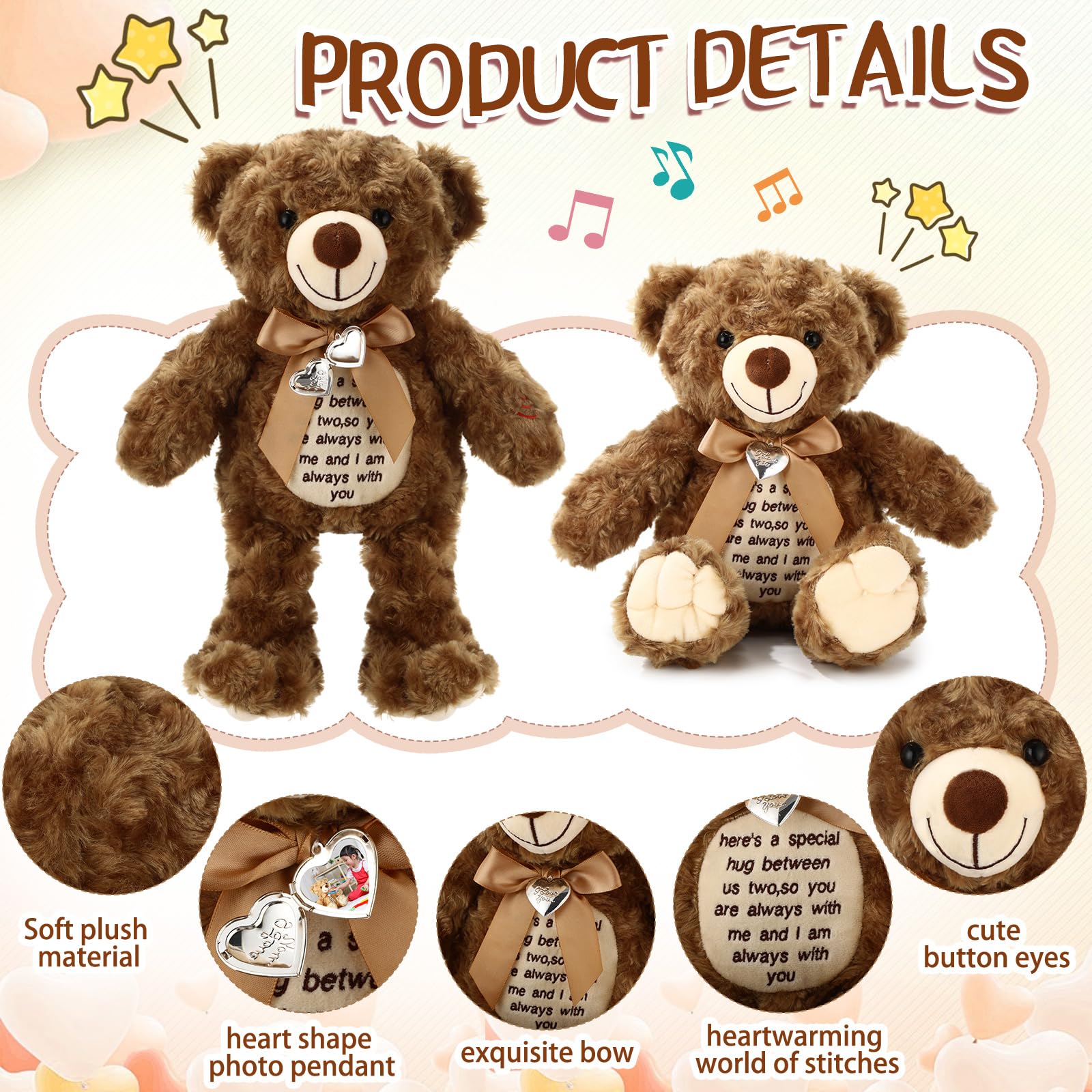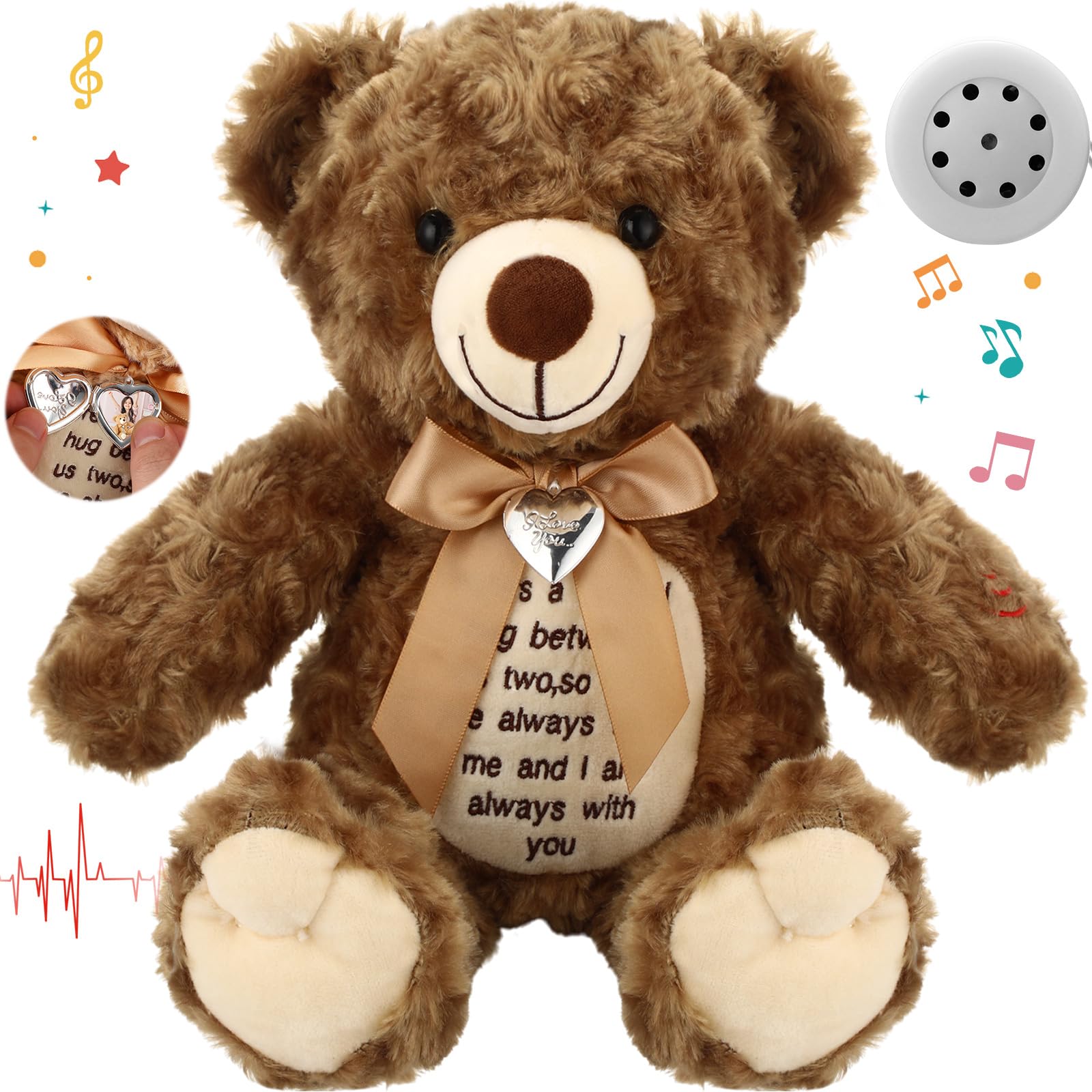 Bring Care and Encouragement: this voice stuffed animal bear has a delicate designed neckline graced with charming bows; Adding to the cuteness, a photo pendant is attached for a personalized touch; It is more than an adorable toy but an intimate keepsake for cherishing memories; Uplifting words of inspiration are sewed in front of the bear, making it not just a bear but a friend that lends warmth