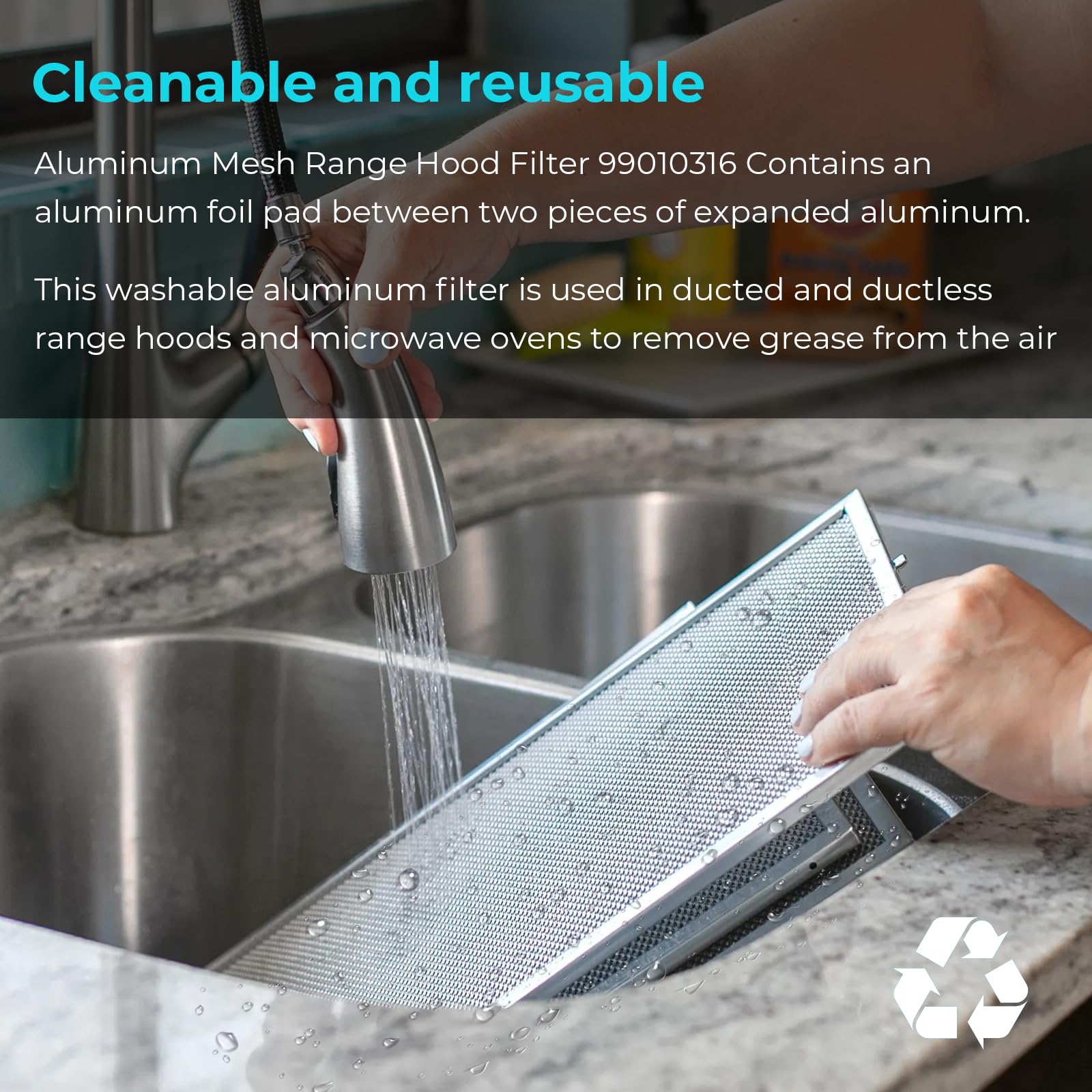 Broan Range Hood Filter: 99010316 replacement filters are made of high-quality and durable aluminium to ensure long-lasting performance. Can be immersed in hot water for easy cleaning. Washable aluminum filters that can be cleaned as needed, preventing grease build-up and reduced airflow. It can also extend the life of the product while maintaining the optimal performance of the aluminum filter. Rigorously tested by the manufacturer (OEM compliant)