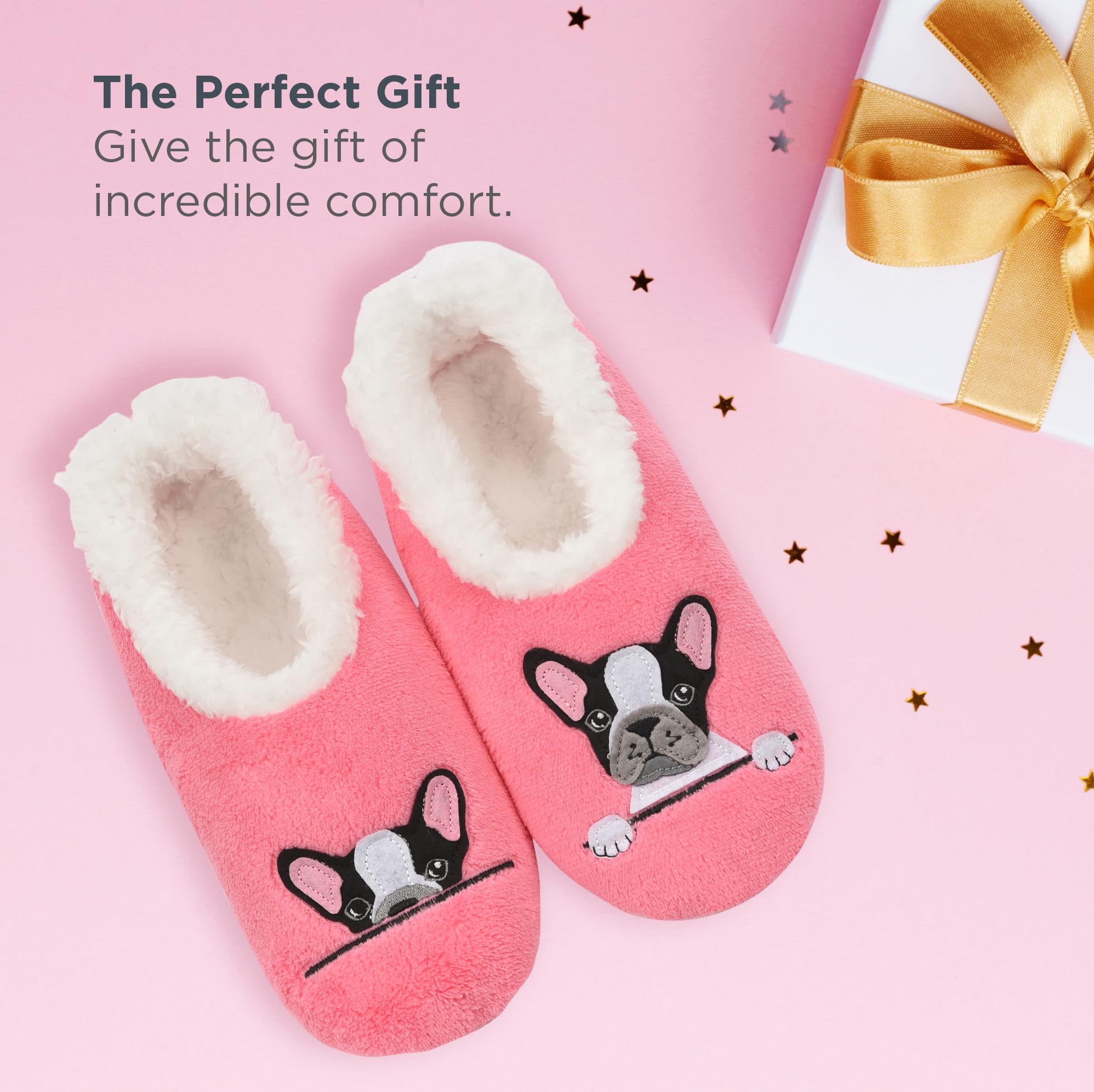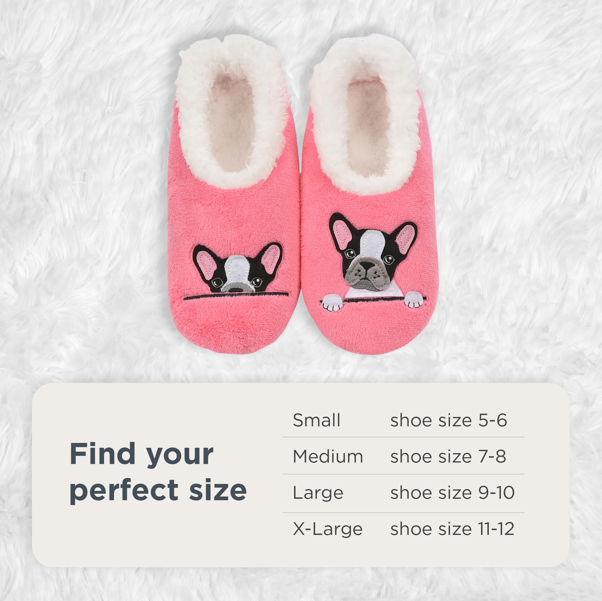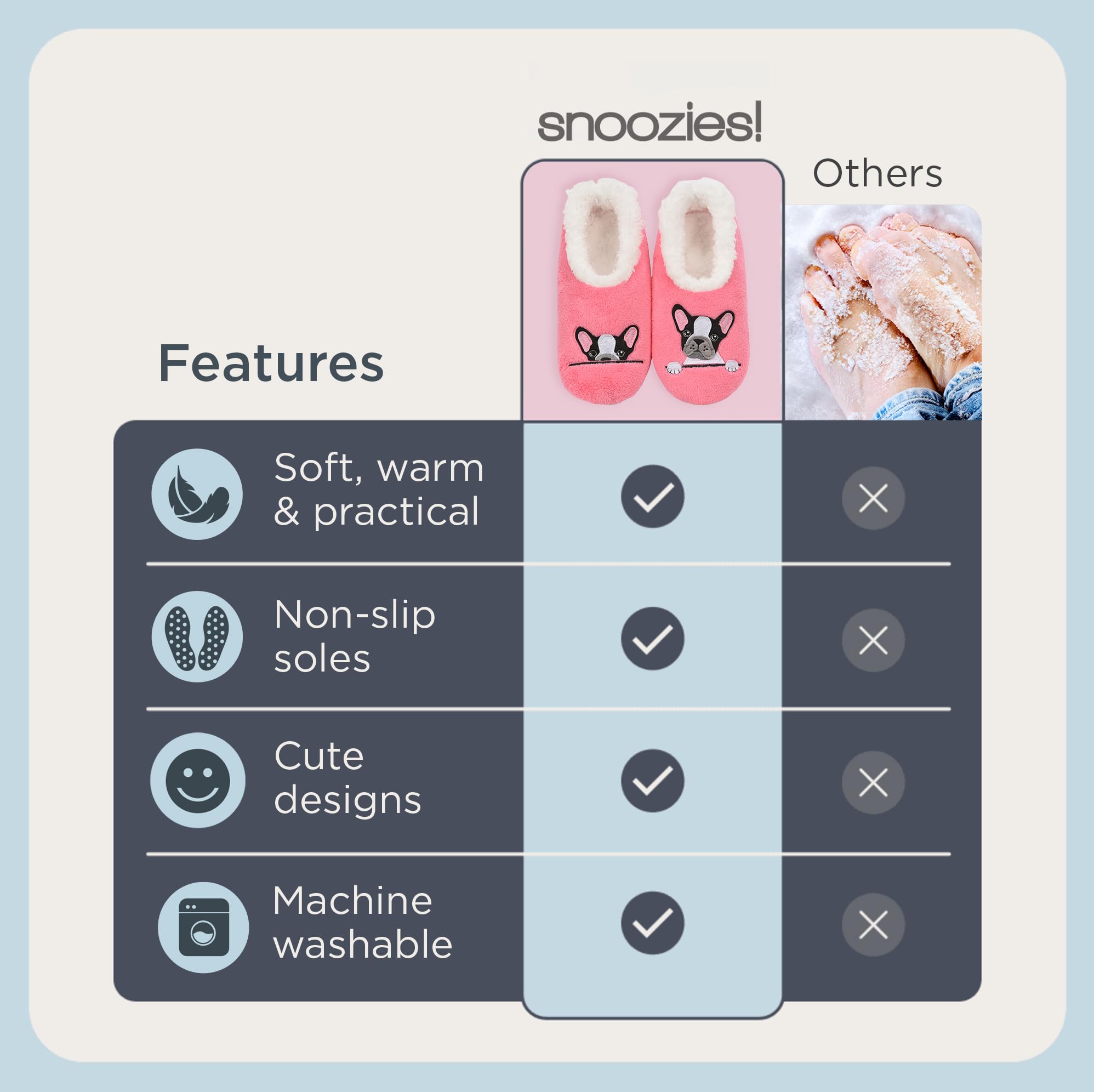 Description Snoozies are not socks and they're not womens slippers - sort of a crossover between the two and that's why we call them foot coverings. Our Snoozie Cats and Dogs pairables slipper socks are are made with a brushed fleece exterior in colorful and fun printed patterns and then lined with a soft Sherpa fleece inside. Snoozies are soft, comfy, warm and just simply adorable - the newest foot coverings for your feet! Each pair has a non skid sole so you can feel safe wearing them on wood or tile floors. These slipper socks keep feet warm even on the coldest of days! They work in warm climates too where air conditioning keeps floors cold. They are are fully machine washable and won't shrink! Womens US Shoe Sizes: β Small (Sizes 5-6) β Medium (Sizes 7-8) β Large (Sizes 9-10) β X-Large (Sizes 11-12)