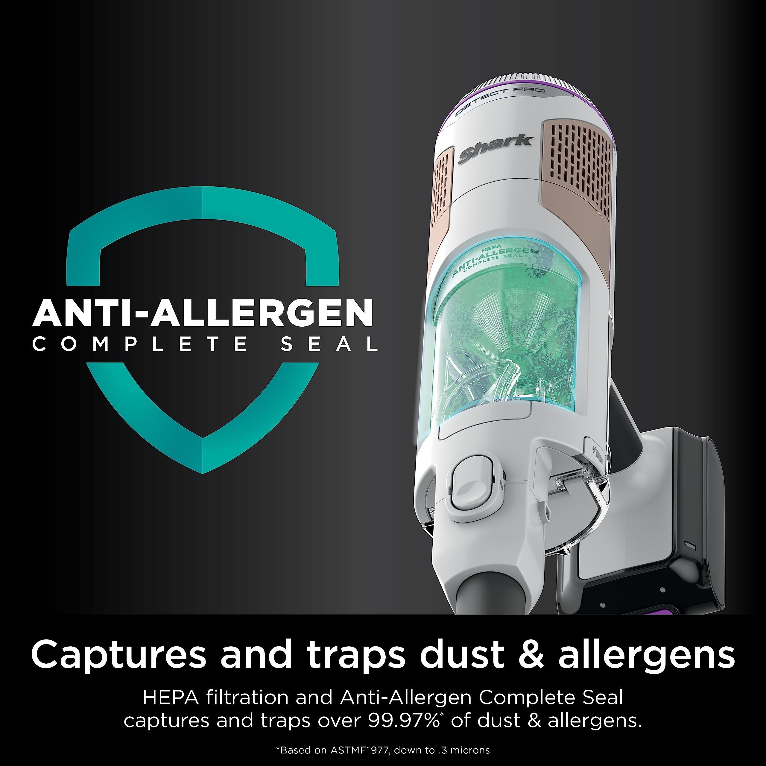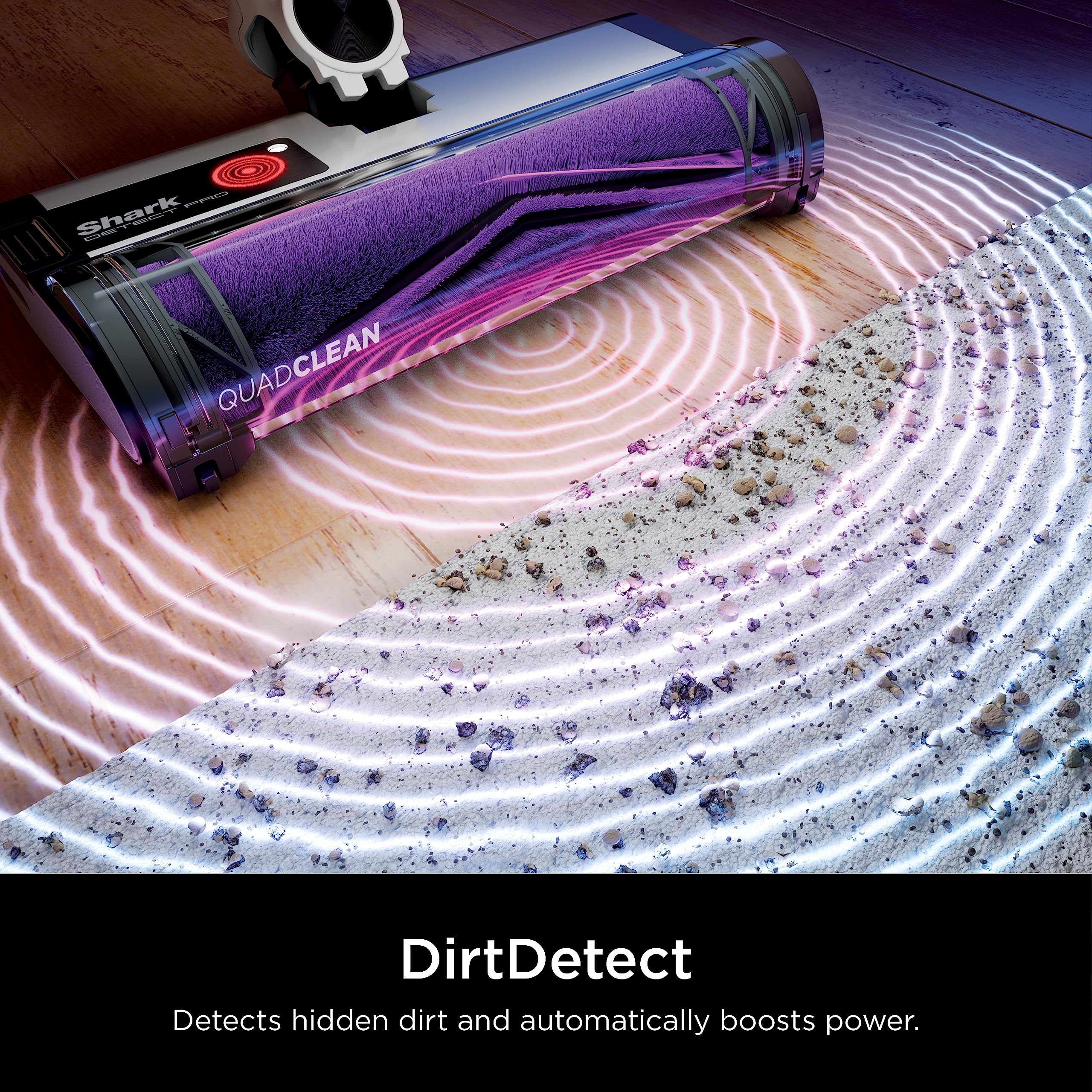 The Shark Cordless Detect Pro features 4 detect technologies that detect & react to to dirt to boost power and increase cleaning up to 50% when carpet and dirt is detected (*Eco vs. Detect Boost (with both Carpet and Dirt), based on ASTM F608). DirtDetect senses hidden dirt & automatically boosts power, EdgeDetect senses edges & corners and doubles suction**, Floor Detect detects floor types & adjusts performance, and LightDetect illuminates dark areas to spot hidden debris.