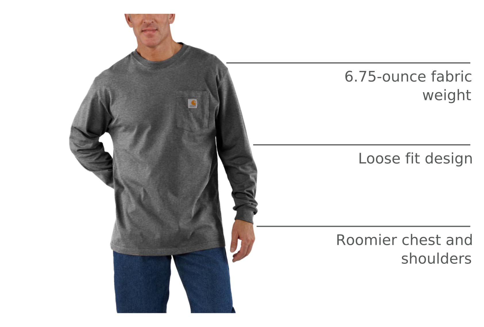 Description Product Description Heavyweight, durable and casual. Holds up when you put it through the ringer day after day. From the Manufacturer Made of 6.75-ounce, 100% cotton jersey our long sleeve pocket t-shirt makes for perfect workwear layered or worn alone. It features a crew neck with a generous left chest pocket and side-seamed construction to minimize twisting. Ash fiber content is 99%/1% polyester. Heather gray fiber content is 90% cotton/10% polyester.