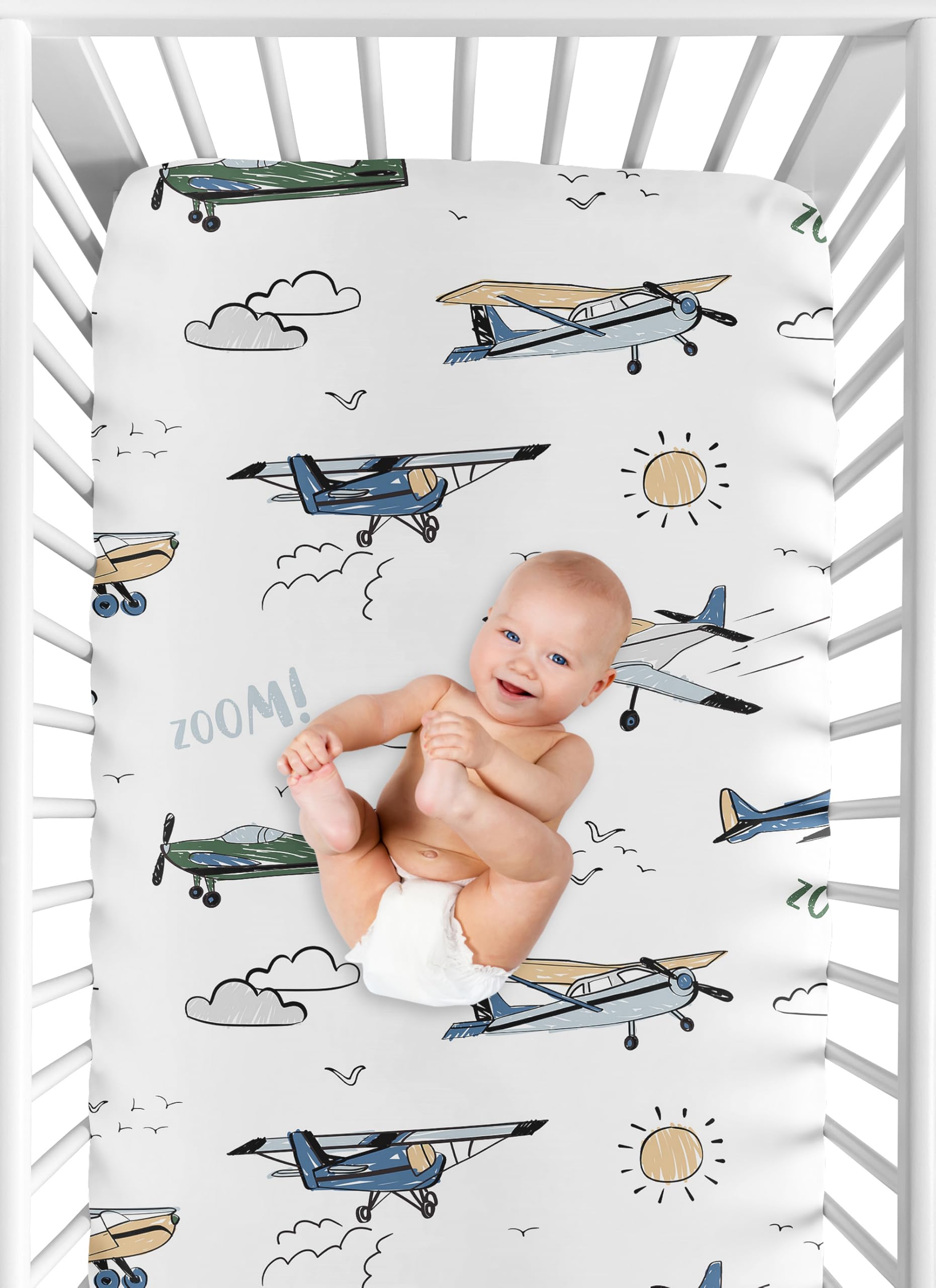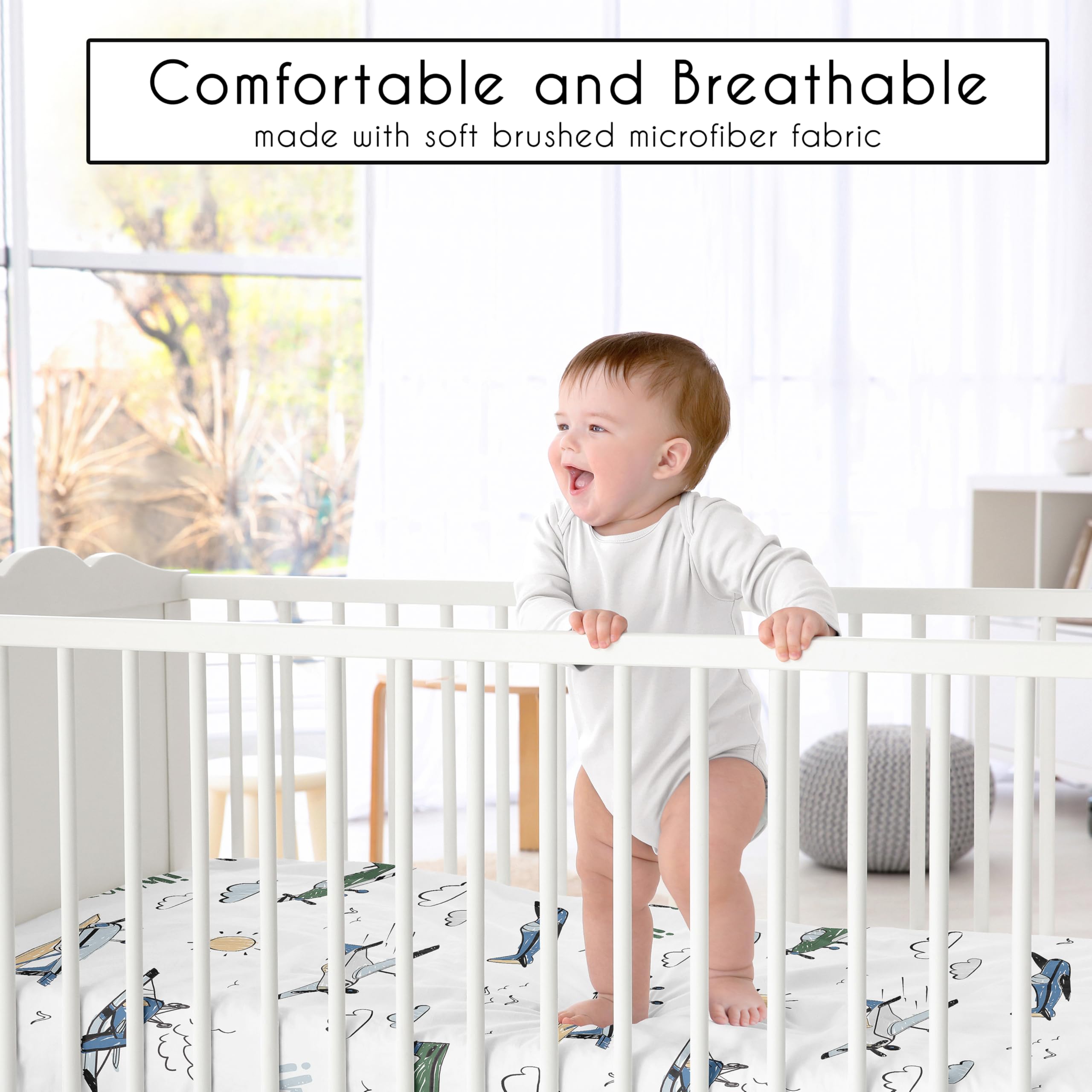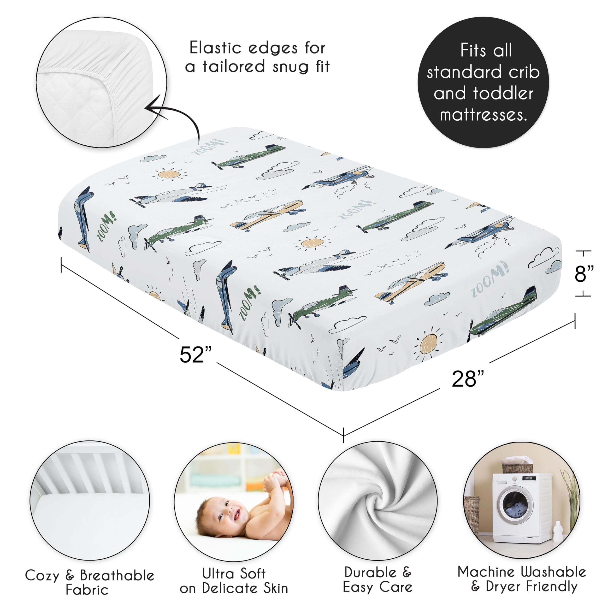 SNUG FIT: Includes (1) Fitted Crib Sheet 52in. x 28in. x 8in. Our newborn standard crib sheets fit snugly, with premium elastic sewn around the entire bottom edge for a secure fit on most standard sized cribs and toddler beds, to reduce shifting & bunching. This brushed microfiber crib sheet features an exclusive design of a blue, green, yellow, grey & white aviation, transportation, sky, aviator, vintage airplanes print and is gentle on delicate skin to foster a soothing sleep environment.