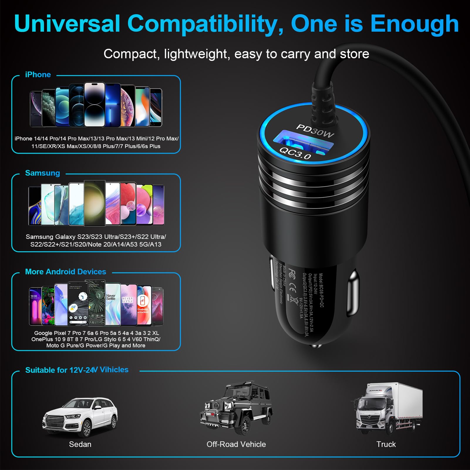 Android Car Charger Fast Charging: Input: DC12V/24V, Output: 48W (Max). PD30W + QC 3.0 18W Dual Port Quick Charging car charger with built-in 30W type c super fast charging cable and standard QC 3.0 USB-A port allows this usb c car charger fast charging two mobile devices simultaneously at high speed without sacrifice charging speed, fast charge samsung galaxy android phone S24 S23 Ultra/S22/S20/Note 20 from 0% to 80% within 30 minutes, 4X faster than the old car charger with c charger cable