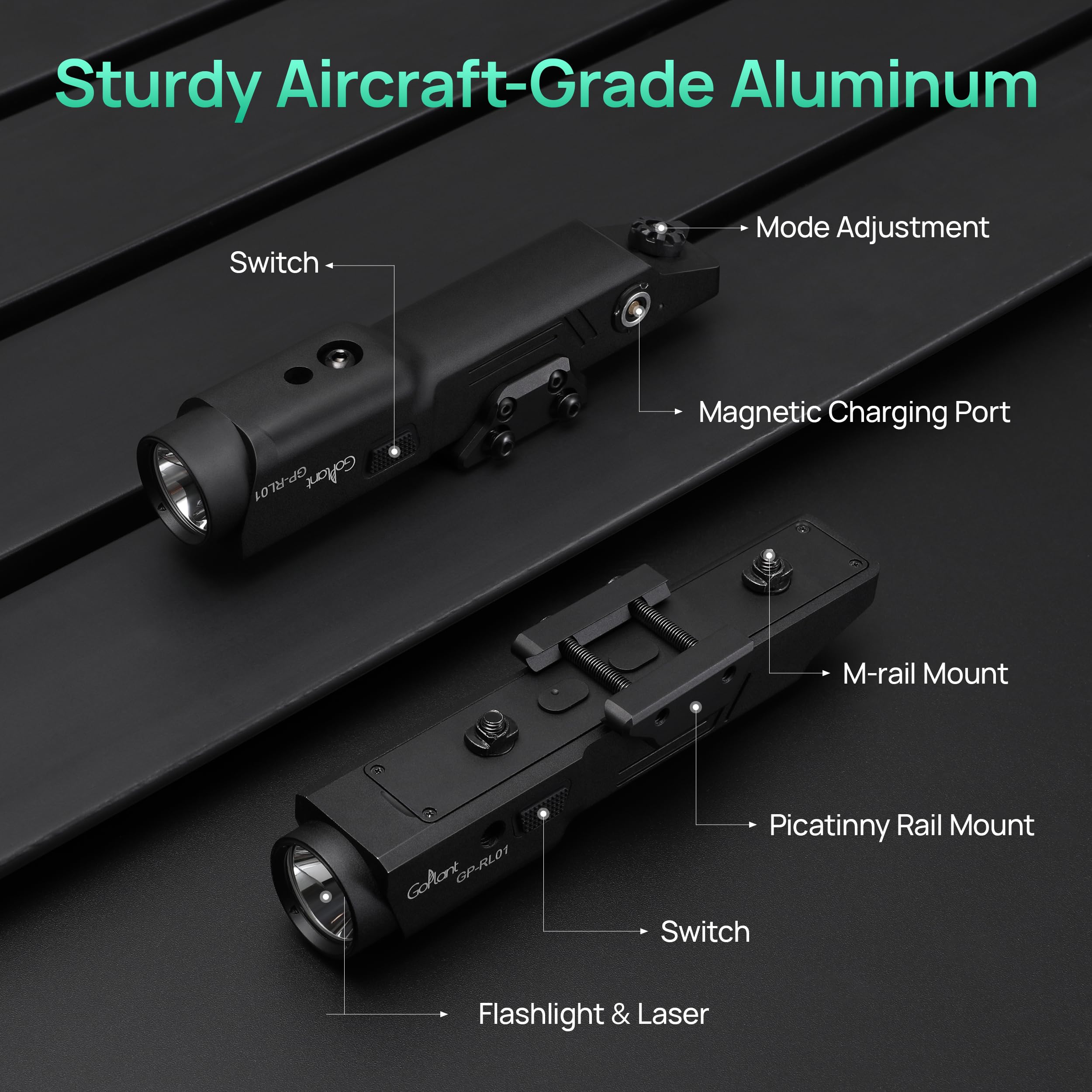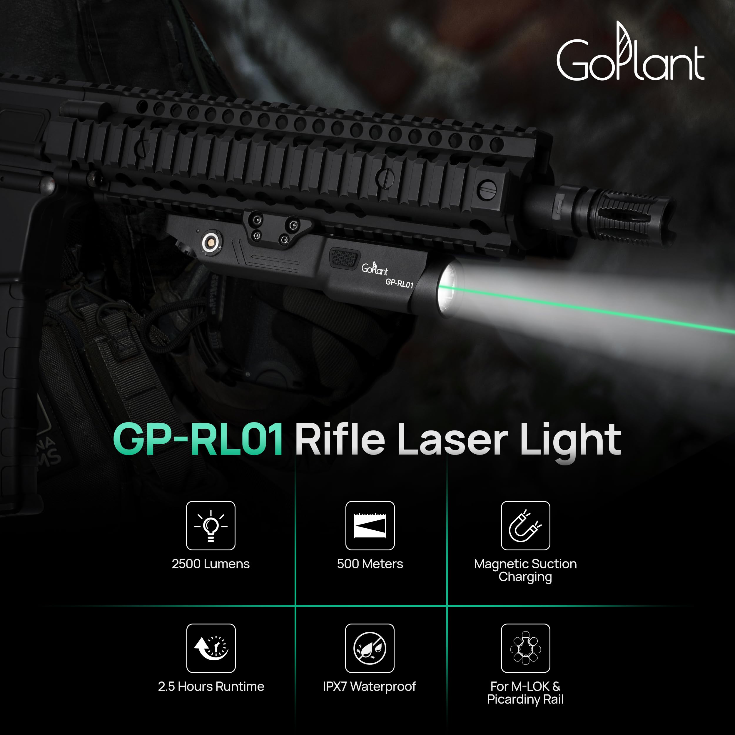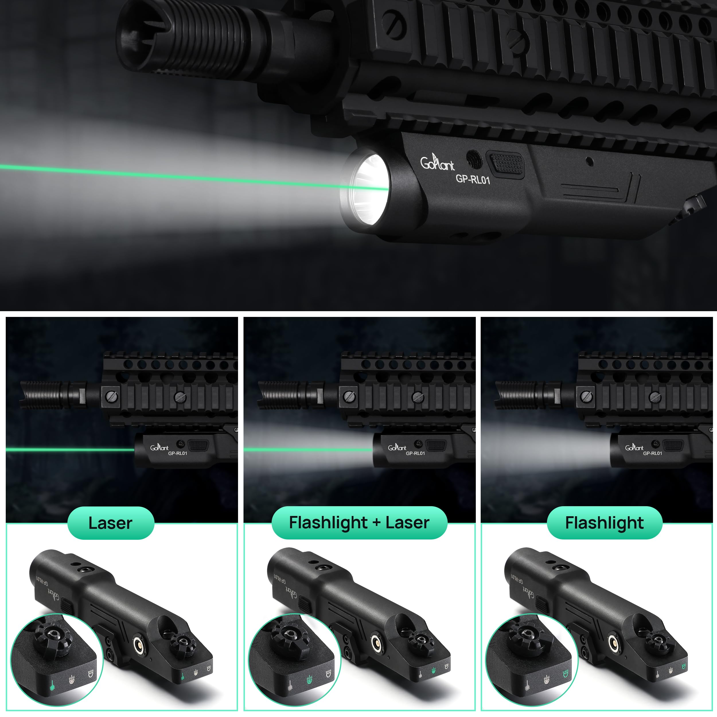 【THREE LIGHT COMBO MODES】 GOPLANT 2500 lumen GP-RL01 picatinny & M-lock rail flashlight with 3 selectable settings: laser only, flashlight+laser combo,flashlight only. You can precisely aim your target easily day or night. Class IIIA laser, less than 5mW for rifle.