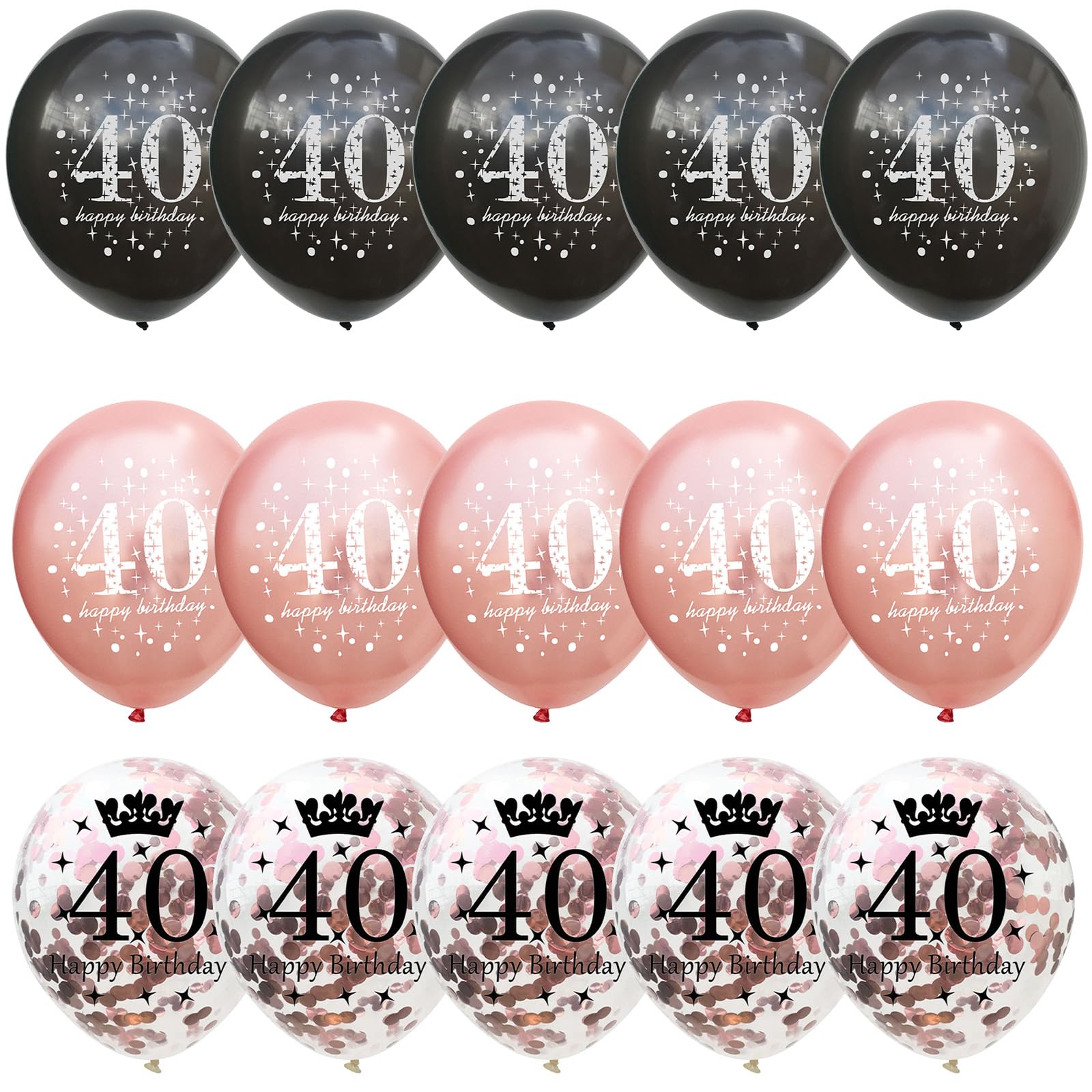 🎂 40th Birthday Balloons - You will get total 15 pieces 12 inch rose gold black happy 40th birthday latex balloons, inclulde 5 pcs rose gold print balloons, 5 pcs black print balloons, 5 pcs rose gold confetti print balloons, come with a balloon ribbon. Perfect for her women 40th birthday party decorations supplies.