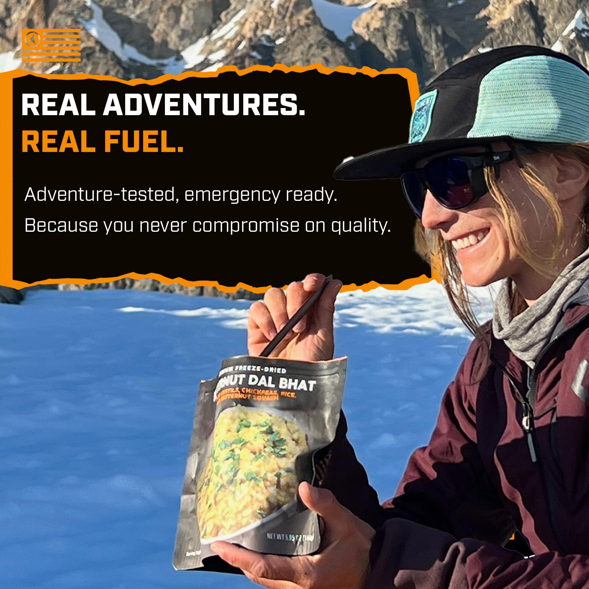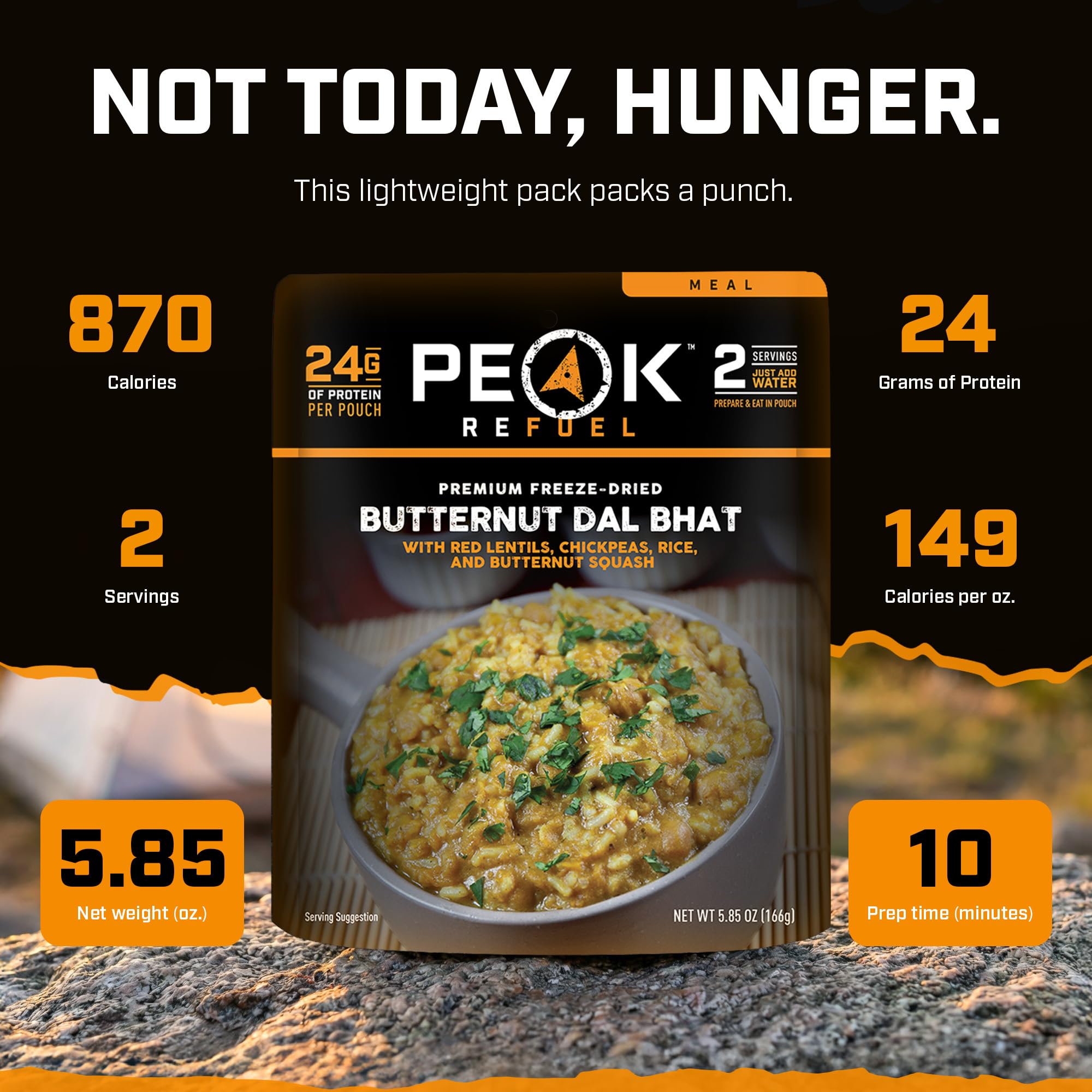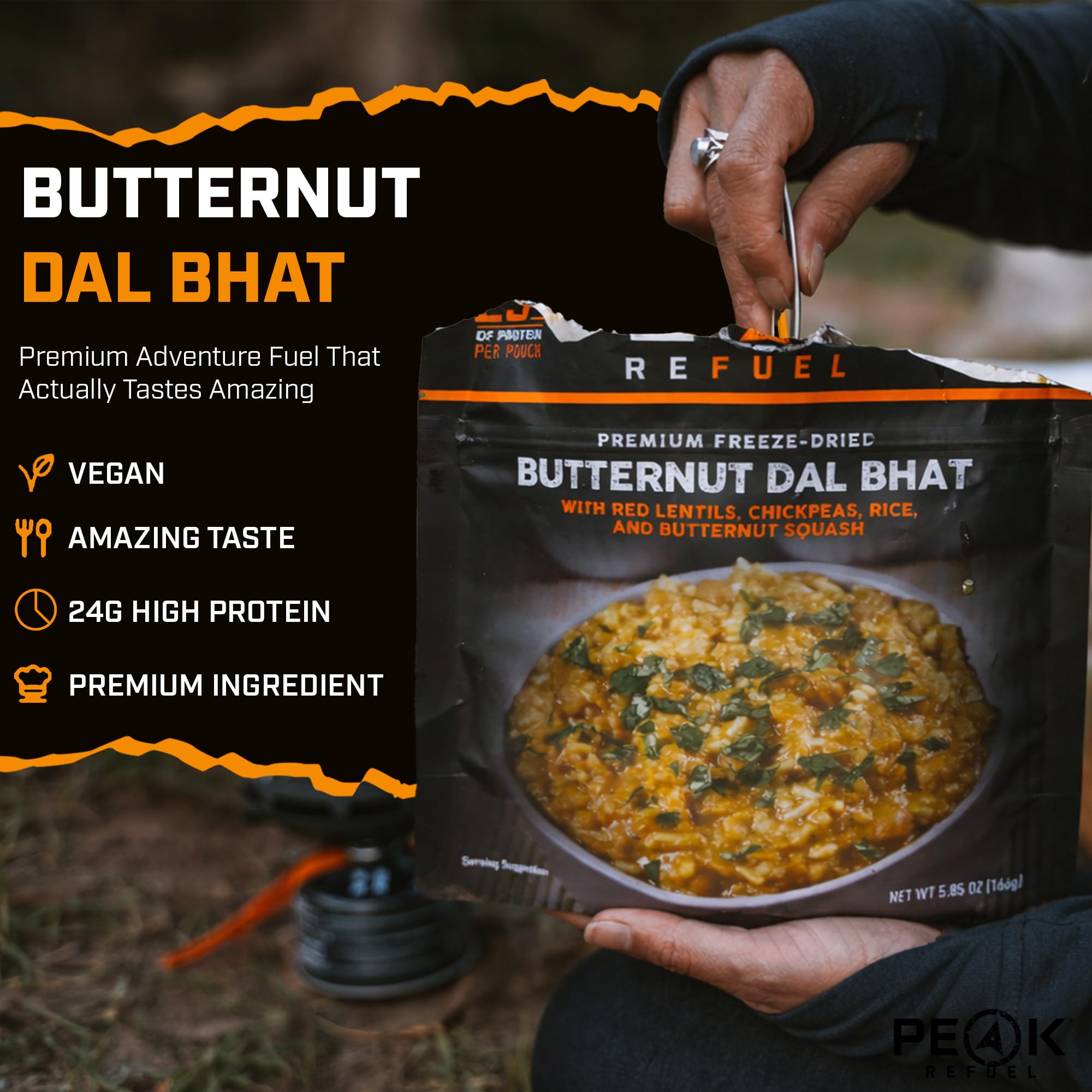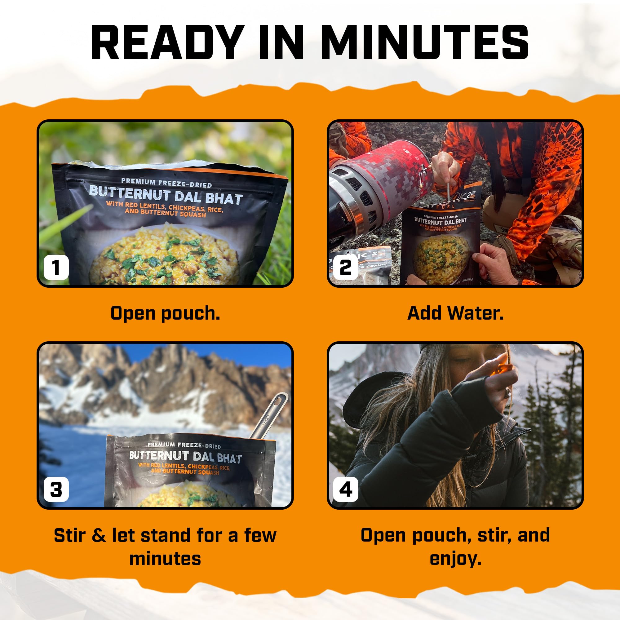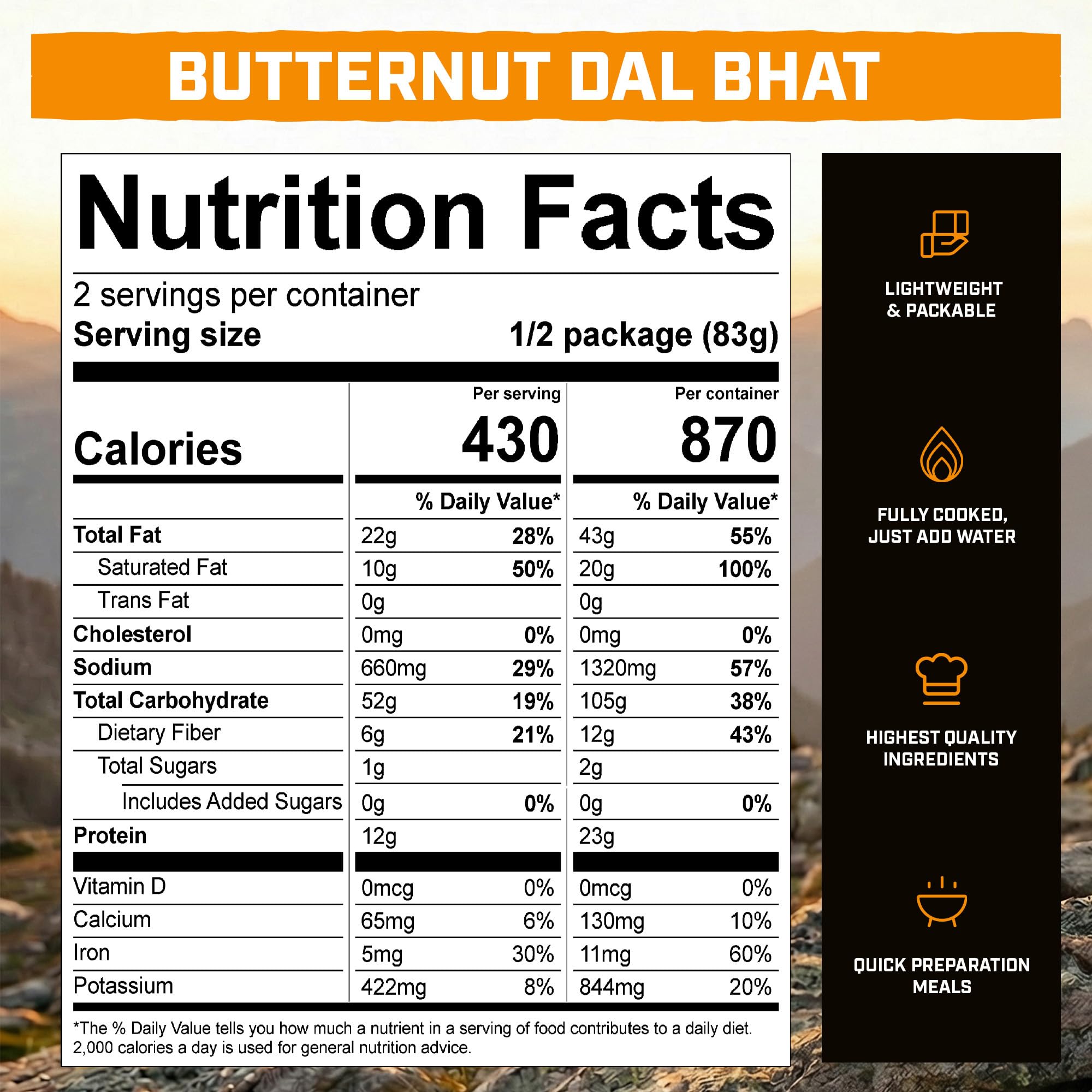 Amazing TasteNo longer do you need to compromise taste for convenience! Our Butternut Dal Bhat contains high quality ingredients to ensure an appetizing and nutritious meal while on the trail. What you eat matters and we have gone to great lengths creating a meal with non-GMO ingredients so you can experience a flavorful just add water backpacking meal whether on the mountain or at your favorite campsite.