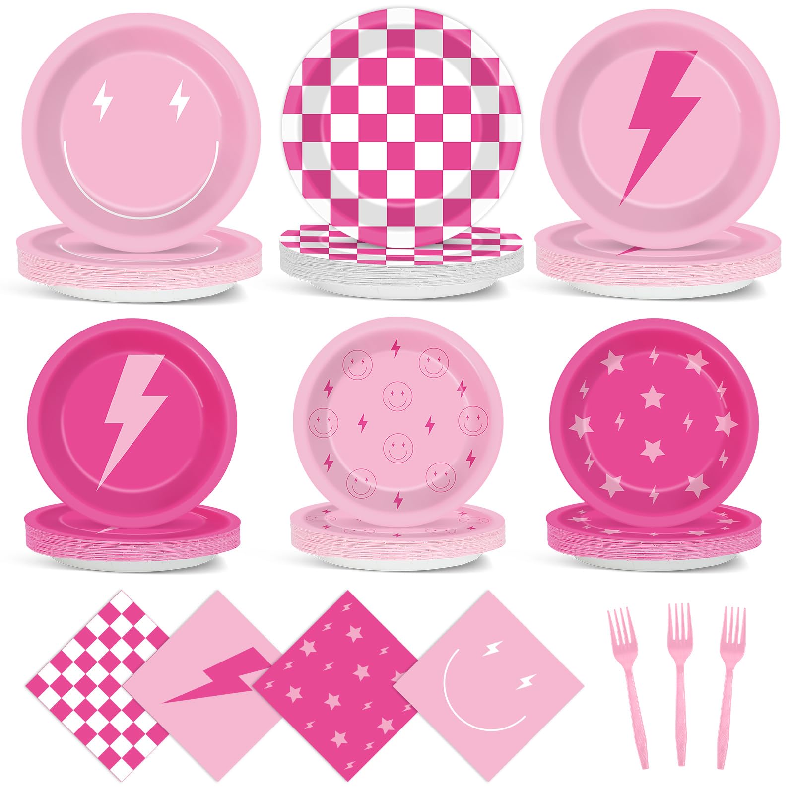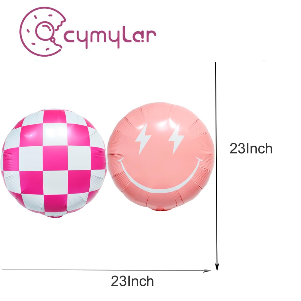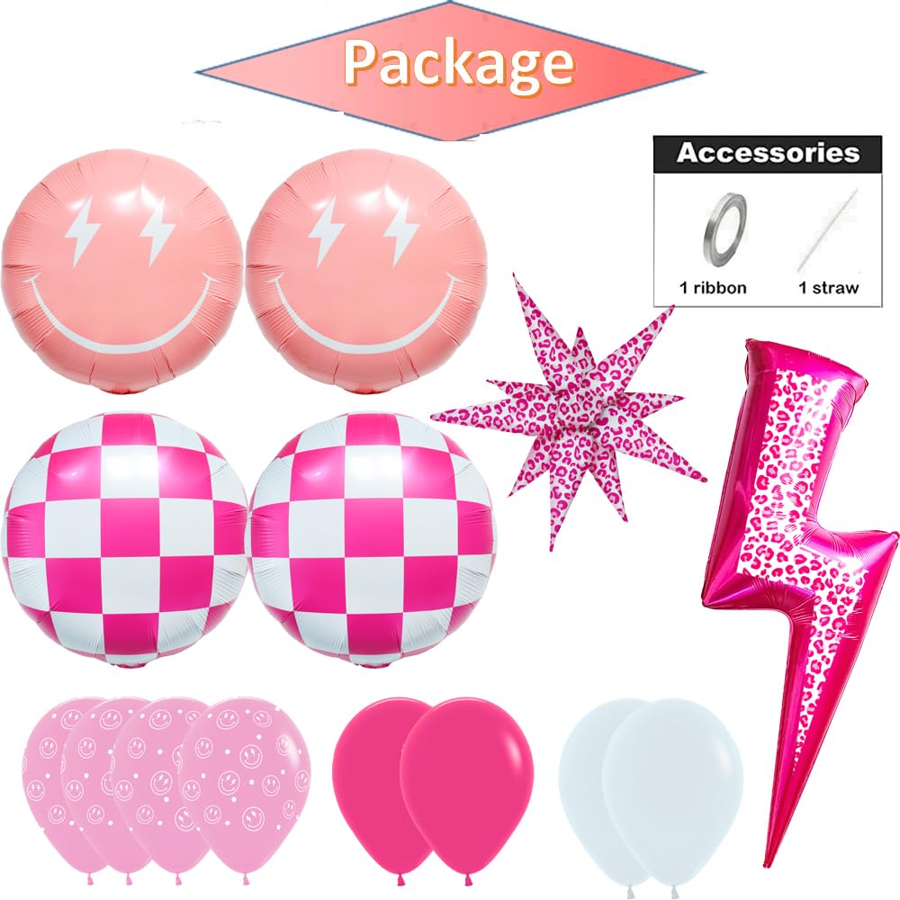 1: Package: Each Package Comes With 2pcs Pink Smile Balloons, 2pcs White Pink Checker Balloon,1pcs Lighting Bolt Balloons,1pcs Starburst Balloon,8pcs Latex balloons,One 10M Ribbion And One 20CM White Plastic Straw,The Straw Can Be Used To Inflate The Balloons With Your Mouth And Also Deflate The Balloons.