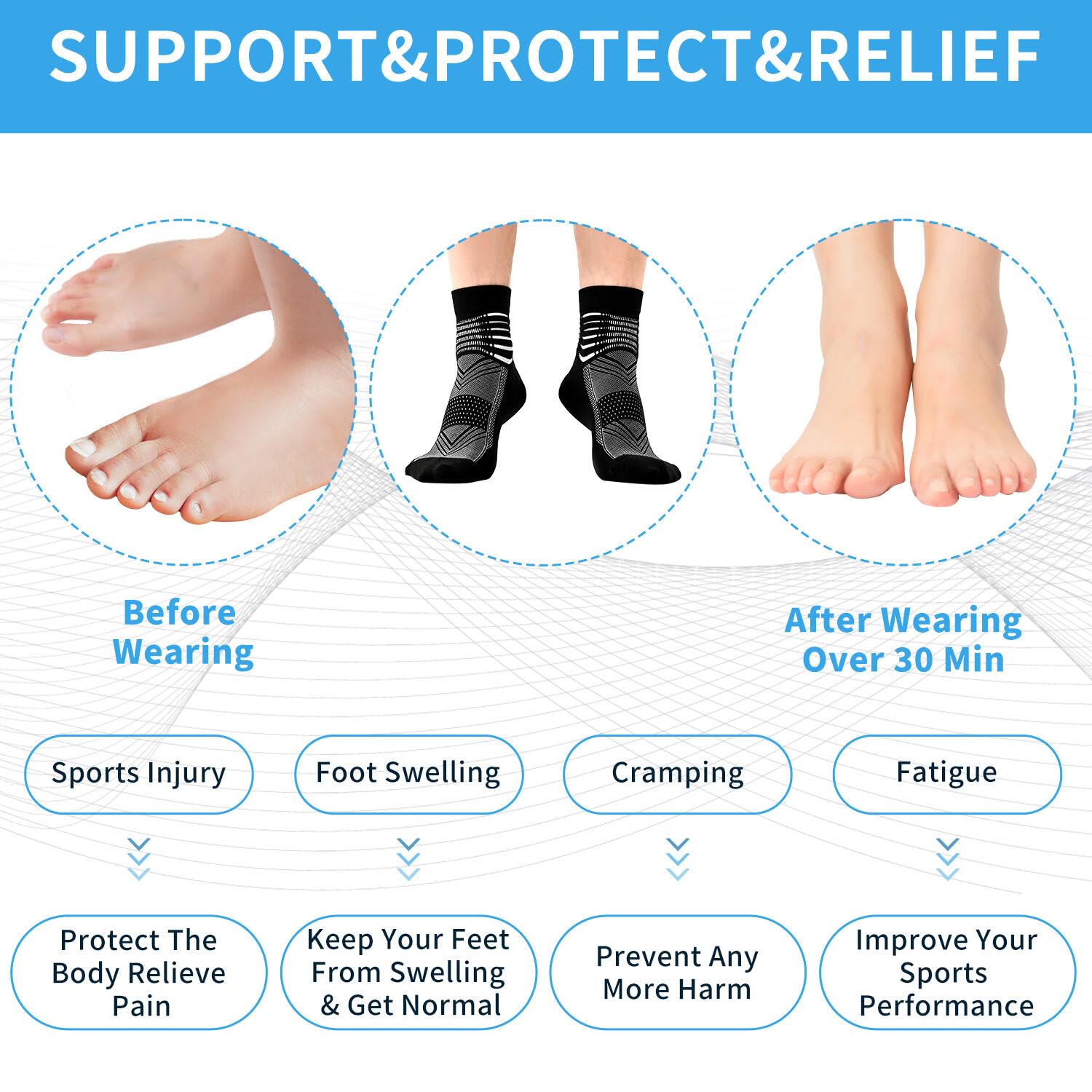 [Arch Support]Our Compression Socks' arch is reinforced with stretched elastics to provide extra compression and protection, improving circulation and significantly reducing pressure on the muscle. This helps injuries recover faster and keeps your leg warm.