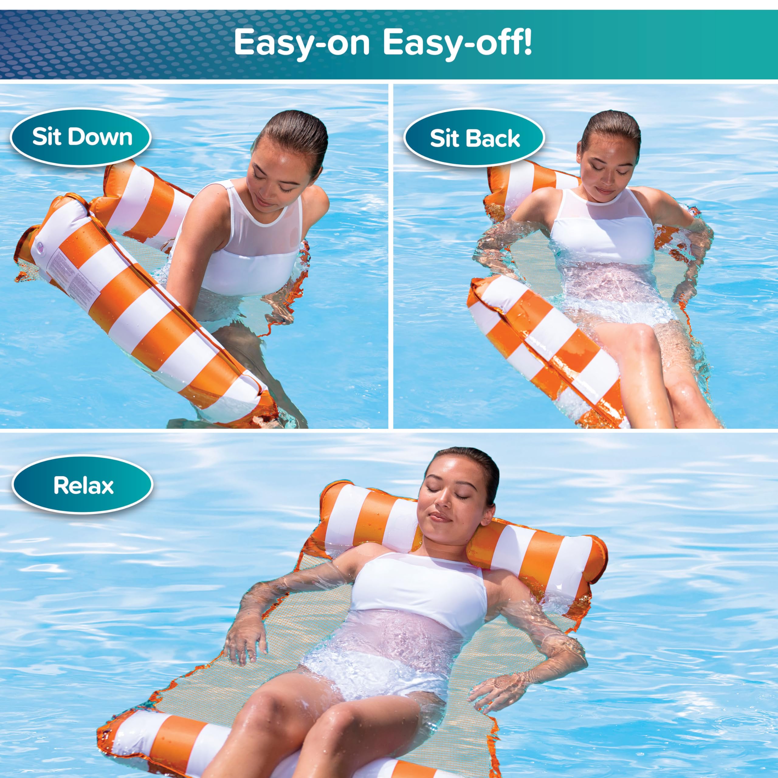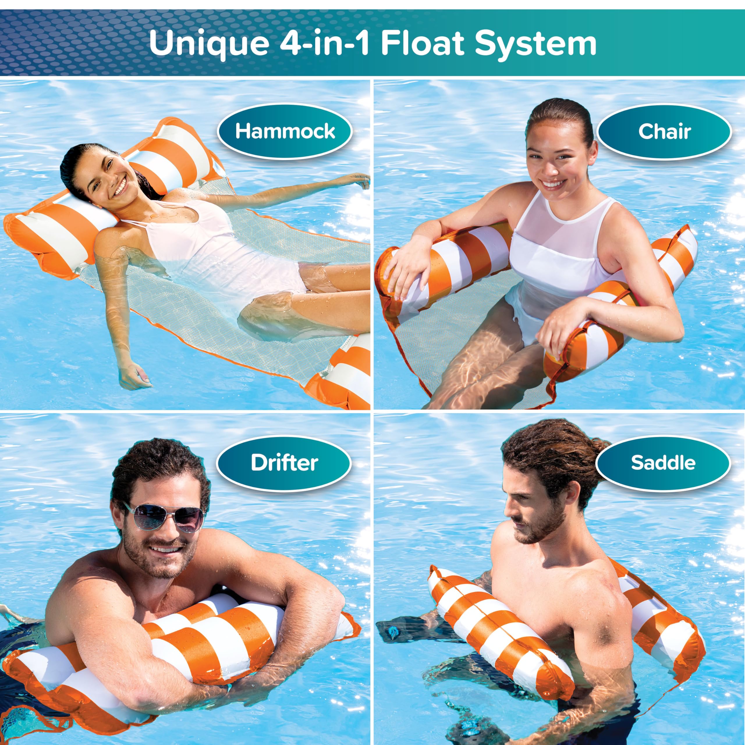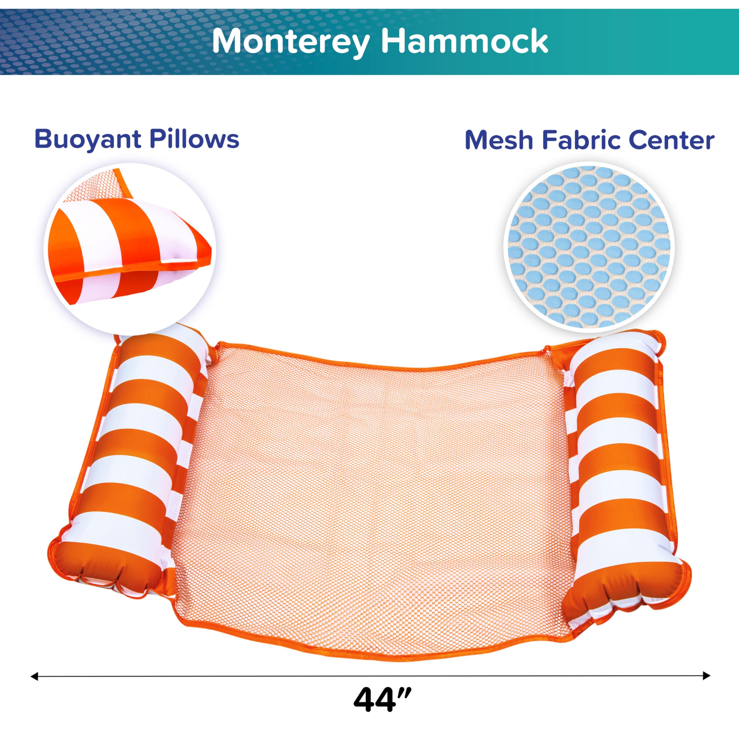 Color: Orange/White Stripe Relax or workout. The Monterey boasts a 4-in-1 inflatable float system: hammock, lounge chair, exercise saddle, and Drifter. The Multi-purpose lounge quickly converts for relaxation, socializing, and even exercise in the pool. Lounge features comfortable cool weave fabric and folds easily for portability. Easily inflate and deflate with duo lock inflation system. The Monterey inflatable float system is a great addition to the summer pool this season and delivers fun so you can socialize, relax and even exercise. -Versatile: Monterey 4-in-1 Hammock offers 4 unique positions! Hammock, lounge chair, drifter and exercise saddle. Great for free-motion water (aerobics) exercise. -Recline-Relax-Dream: Supportive mesh lining keeps you cool as you relax on the water’s surface. -#1 Customer Comment: “Easiest pool float to get on and get off of while in the water.” -Perfect Size: 44” x 28” (112 cm x 71 cm) -Ages 15 and up; Weight Capacity 250 lbs. WARNING: This is not a life-saving device. NEVER leave children unattended while device is in use. Use only under competent supervision. Good safety practices should be followed at all times. Do not over-inflate or use high-pressure air to inflate. Fabric colors may fade if frequently used in high chlorine-salt-bromine chemically treated pool water or ocean-water. More importantly, commercial pools are much higher in chlorine, salt and bromine levels than your average home residential pool. Product color and graphics may vary from those pictured.