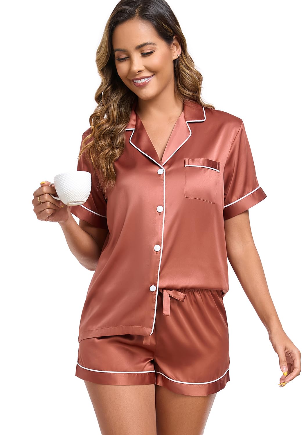 COMFORTABLE FABRIC: Made of high quality silk-like satin fabric, this pajama set is soft and lightweight, perfect for sleeping, lounging, or daily casual wear.