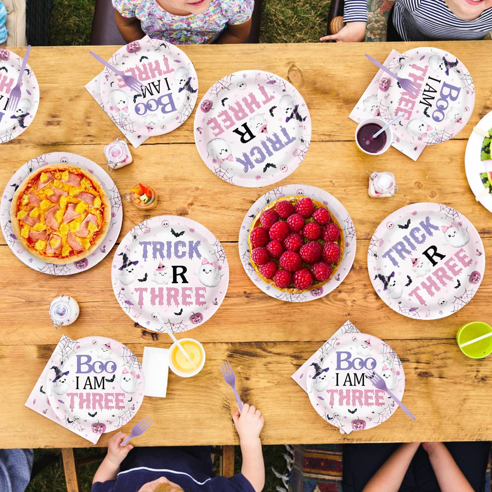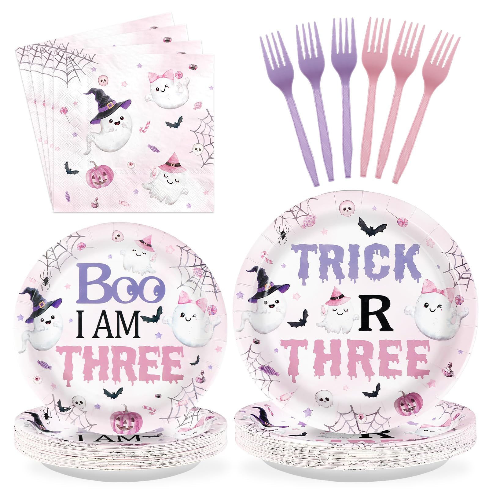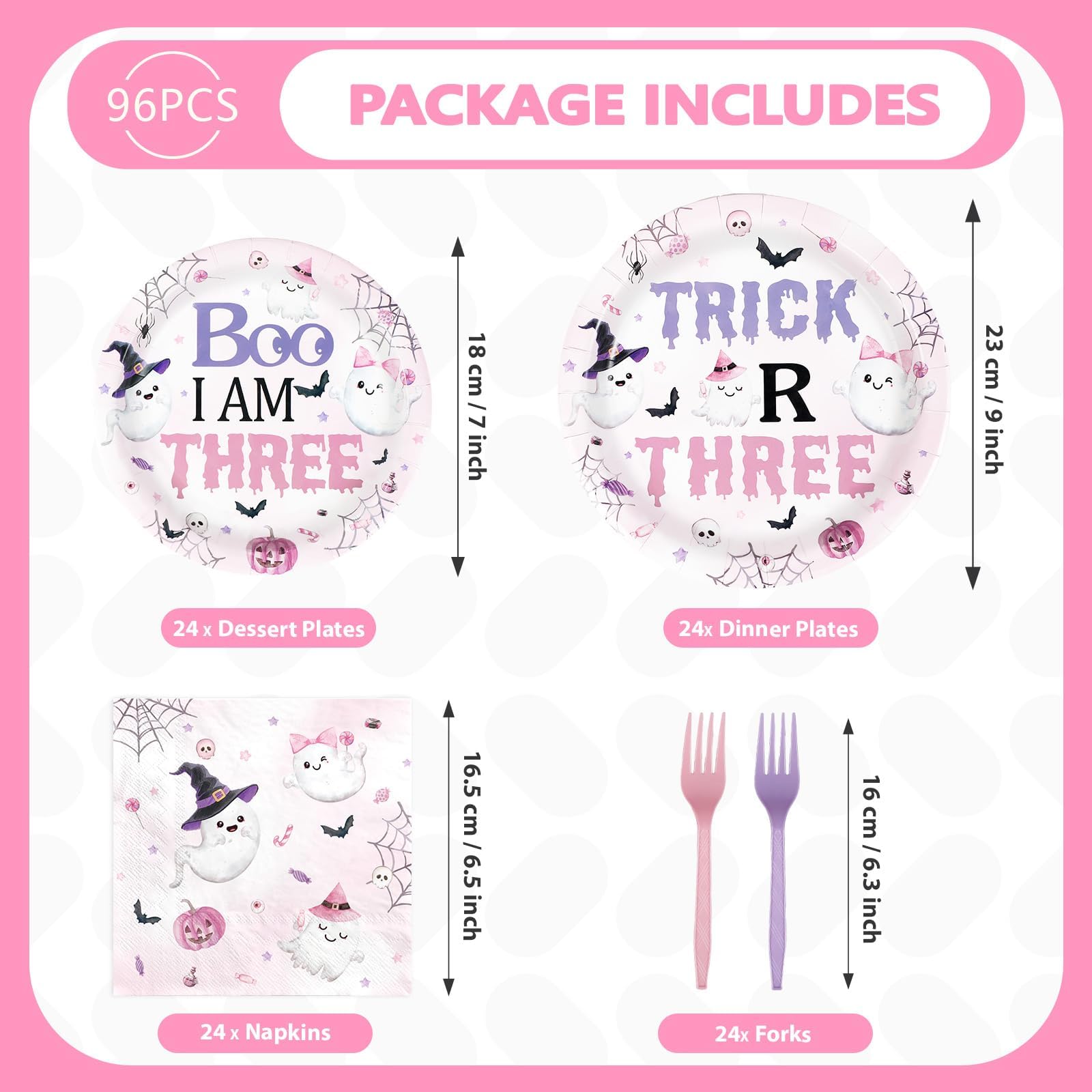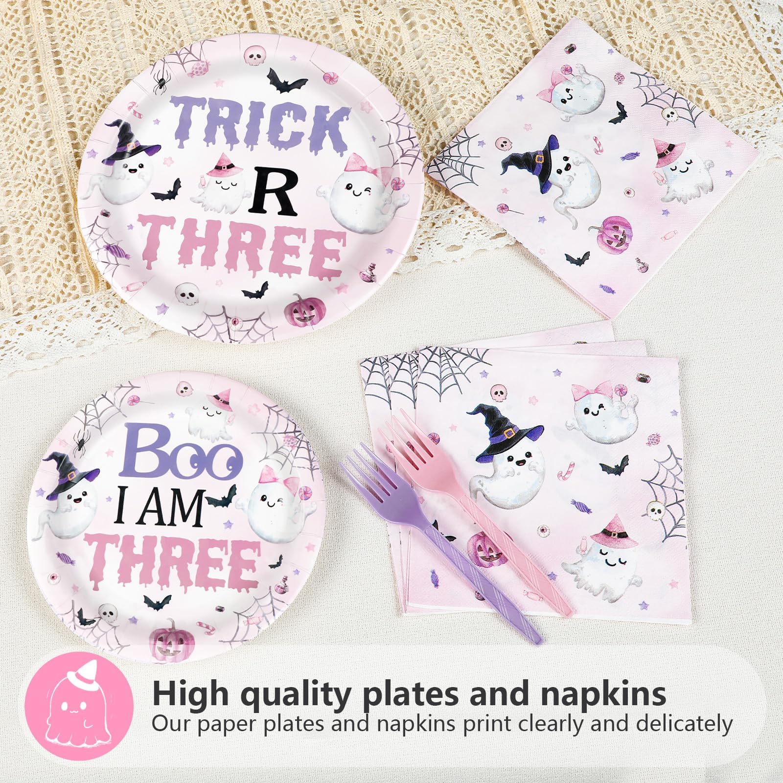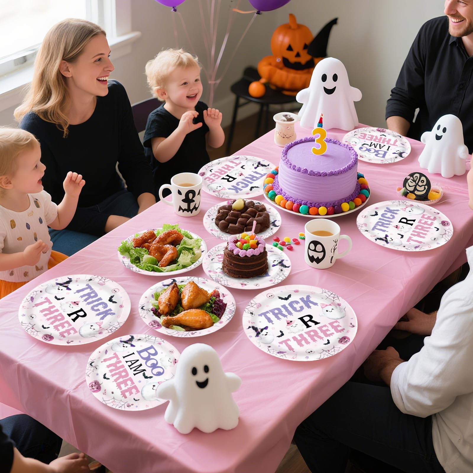 Grencian 96Pcs Halloween Pink Purple Ghost Party Supplies Trick Or Three Birthday Plates and Napkins Tableware Sets Boo I am Three Ghost Pumpkin for Girls Halloween Birthday Baby Shower Serves 24