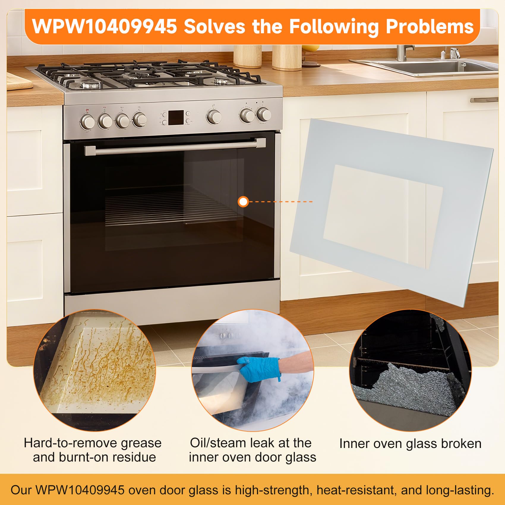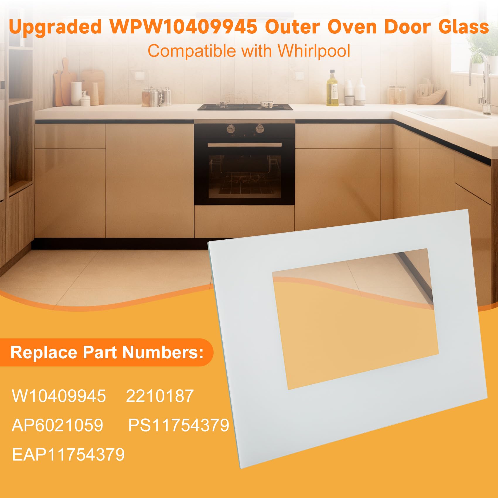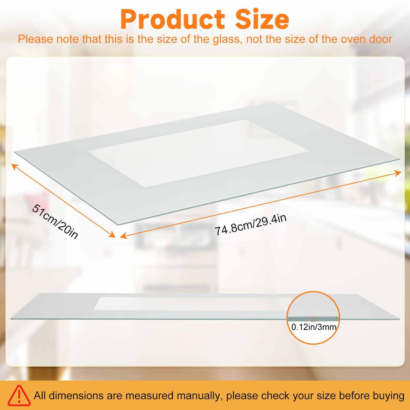 Upgraded WPW10409945 Range Oven Outer Door Glass: WPW10409945 range oven door glass size is 29.4 "(L) x 20" (W), thickness is 3mm. This oven door glass is designed to perfectly fit Whirlpool & Maytag Series/Stove/Oven. Before purchasing, please measure or verify the size and model of your oven glass door to ensure it matches the WPW10409945 oven glass.