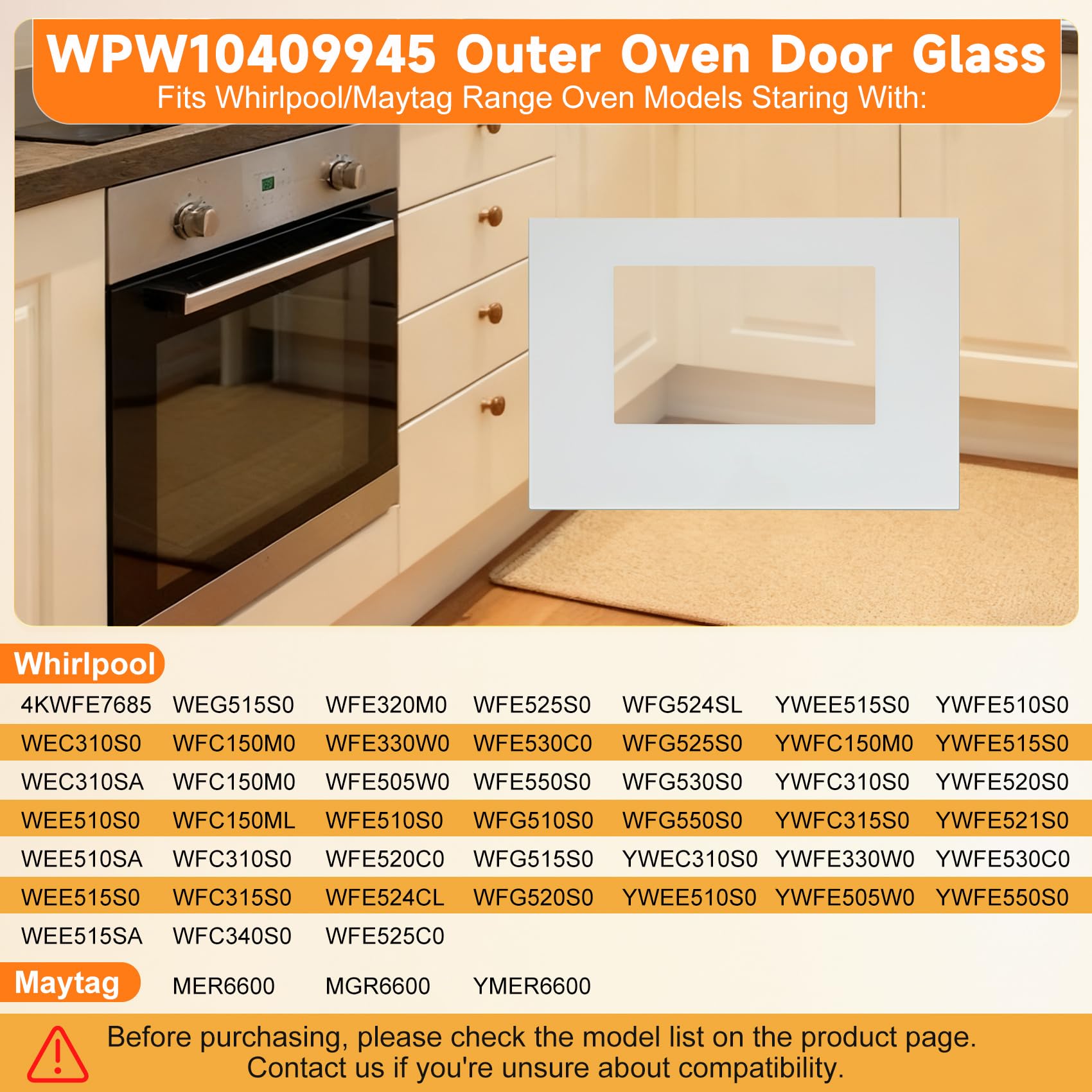 Compatible Model: WPW10409945 outer oven door glass is compatible with Whirlpool & Maytag Series/Stove/Oven glass. It fits the following models, including: 4KWFE7685ES0 WEC310S0LB3 WEE510SAGB0 WEG515S0FW0 WFC310S0EB4 WFG515S0EB0 YWEE515S0LB1 YWFC150M0EW2 YWFE505W0JW4 MER6600FB0 MGR6600FW2 etc. To search for other compatible models, please scroll down to the details page and use the "Ctrl+F" shortcut key.