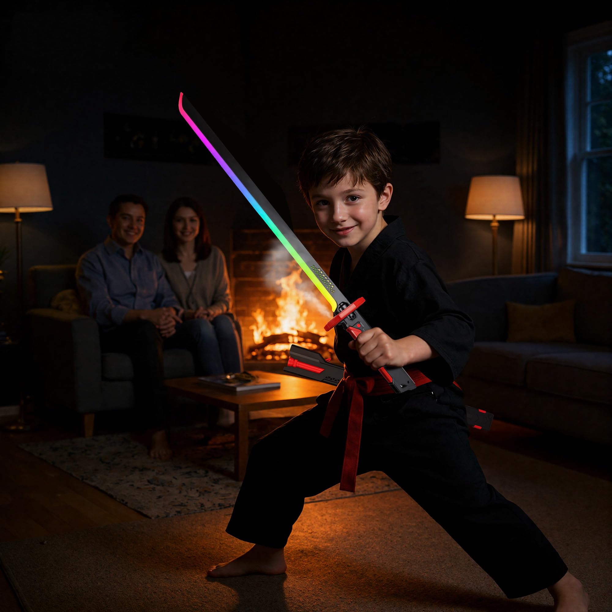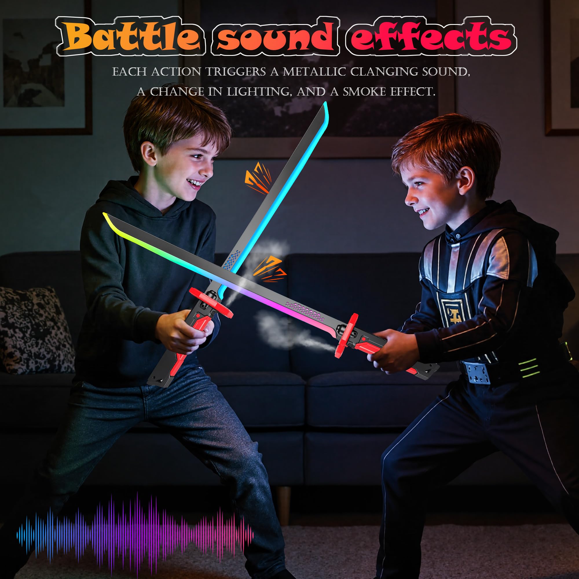 【Impact Sensing】The glowing katana built-in sensors synchronize sound and light. Impacts trigger metallic clash sound effects and LED color changes for a fully immersive experience