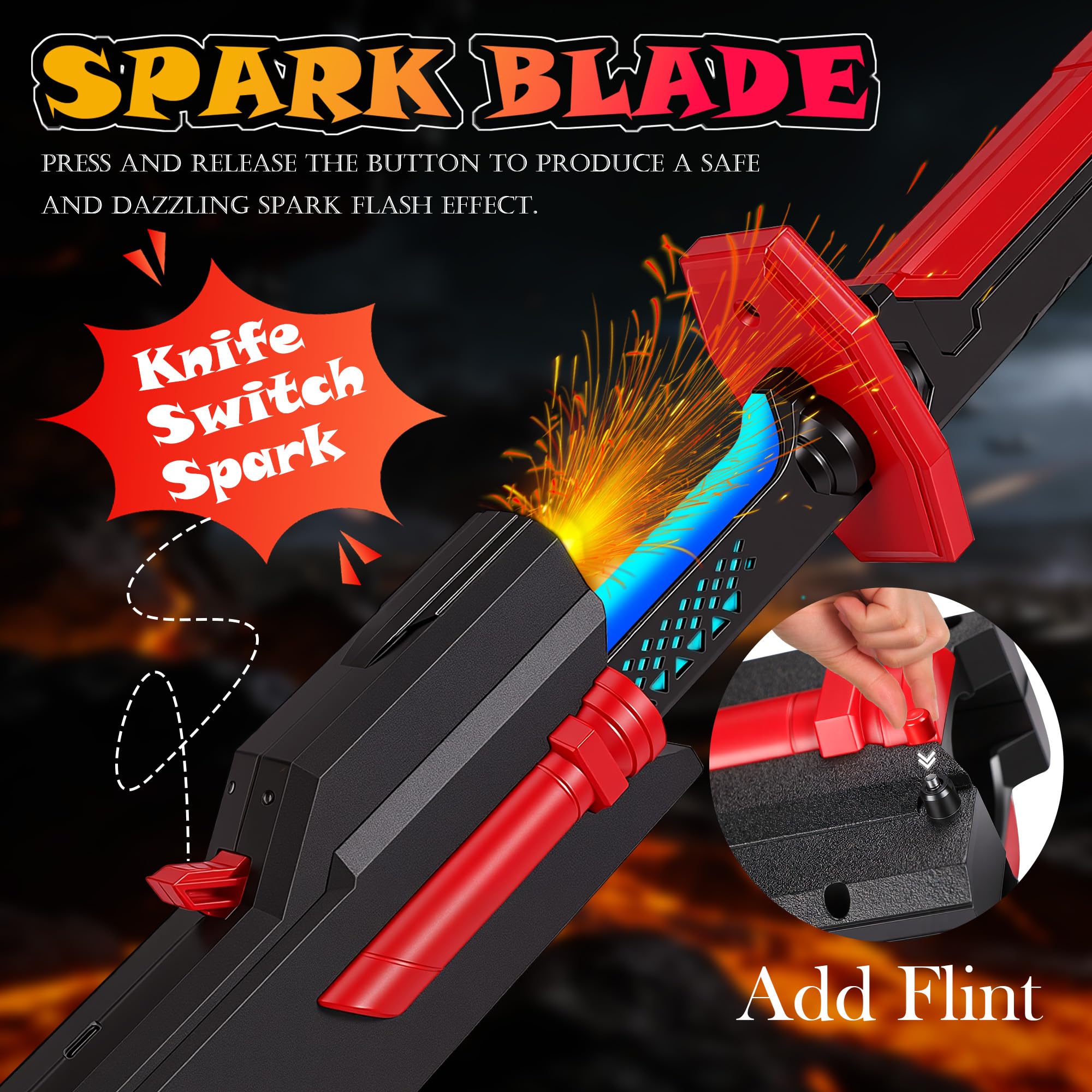 【Spark Effect】A spring-loaded mechanism instantly extends the blade and generates sparks. Sparkblade swords toy equipped with 5 flints for prolonged sparking effects