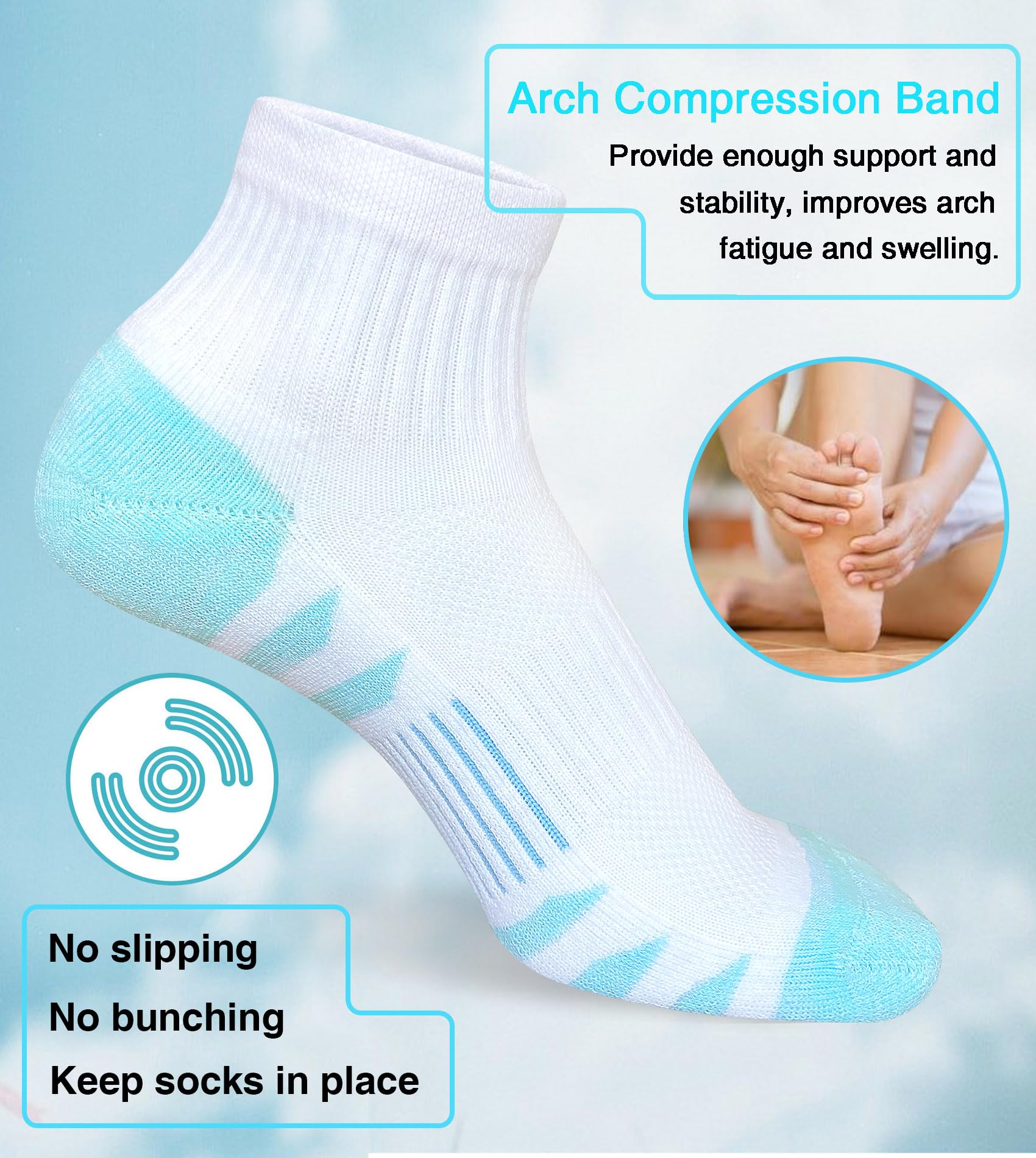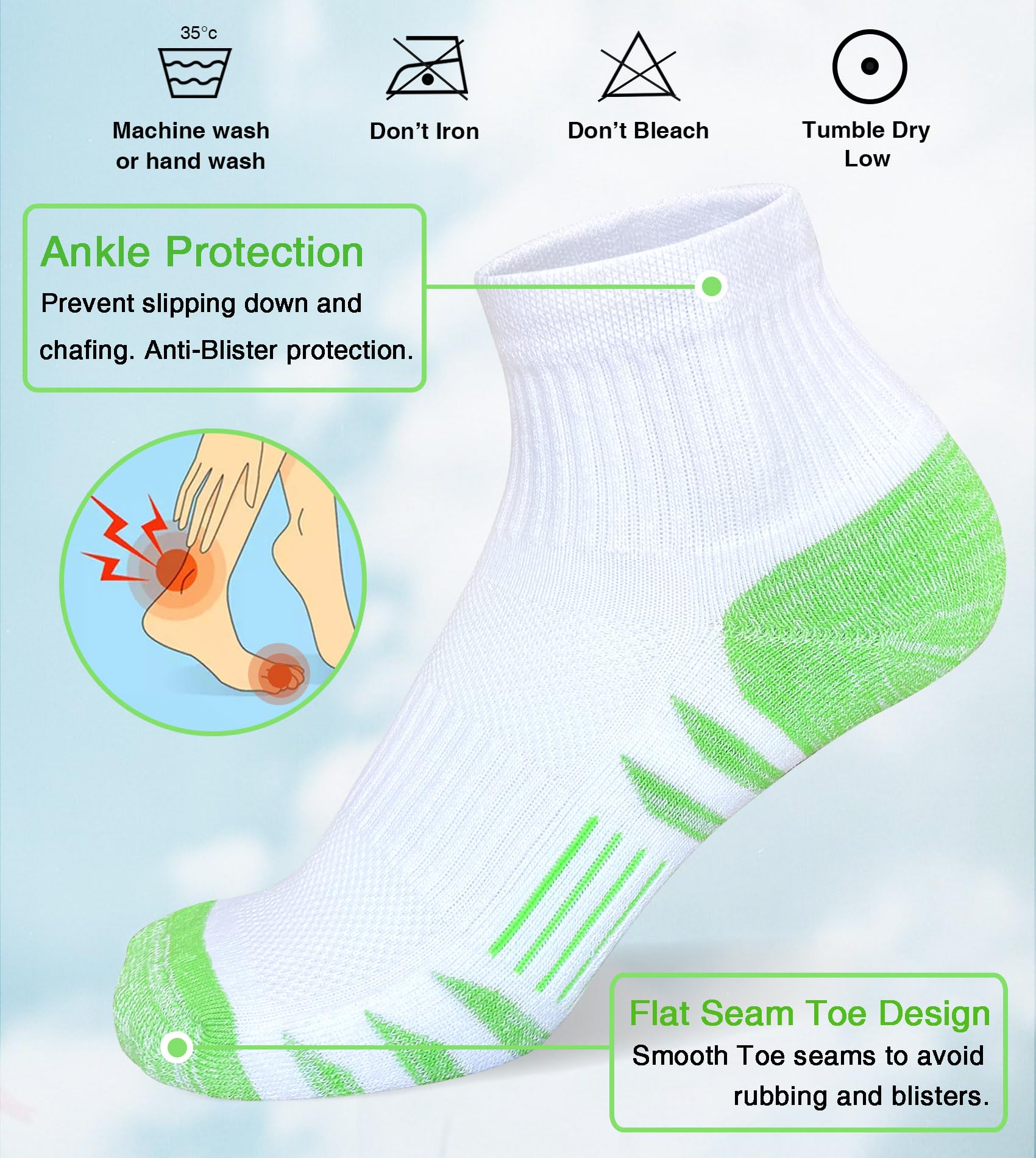 Description Womens Performance Athletic Running Hiking Socks Anti-Blister Protection Heel Tab: prevent slipping down and chafing. Moisture Wicking: Absorb sweat to keep your feet dry. Cushioned Sole: Absorb impact and reduce friction. Breathable Mesh: Help keep your feet dry and cool. Arch Support: Provide enough support and stability. Package: 5 Pairs of socks per pack. Washing Suggestion: Machine wash or hand wash. Water temperature should not exceed 40°C or 105F. Do not bleach, iron or dry clean, tumble dry low & Air Dry .