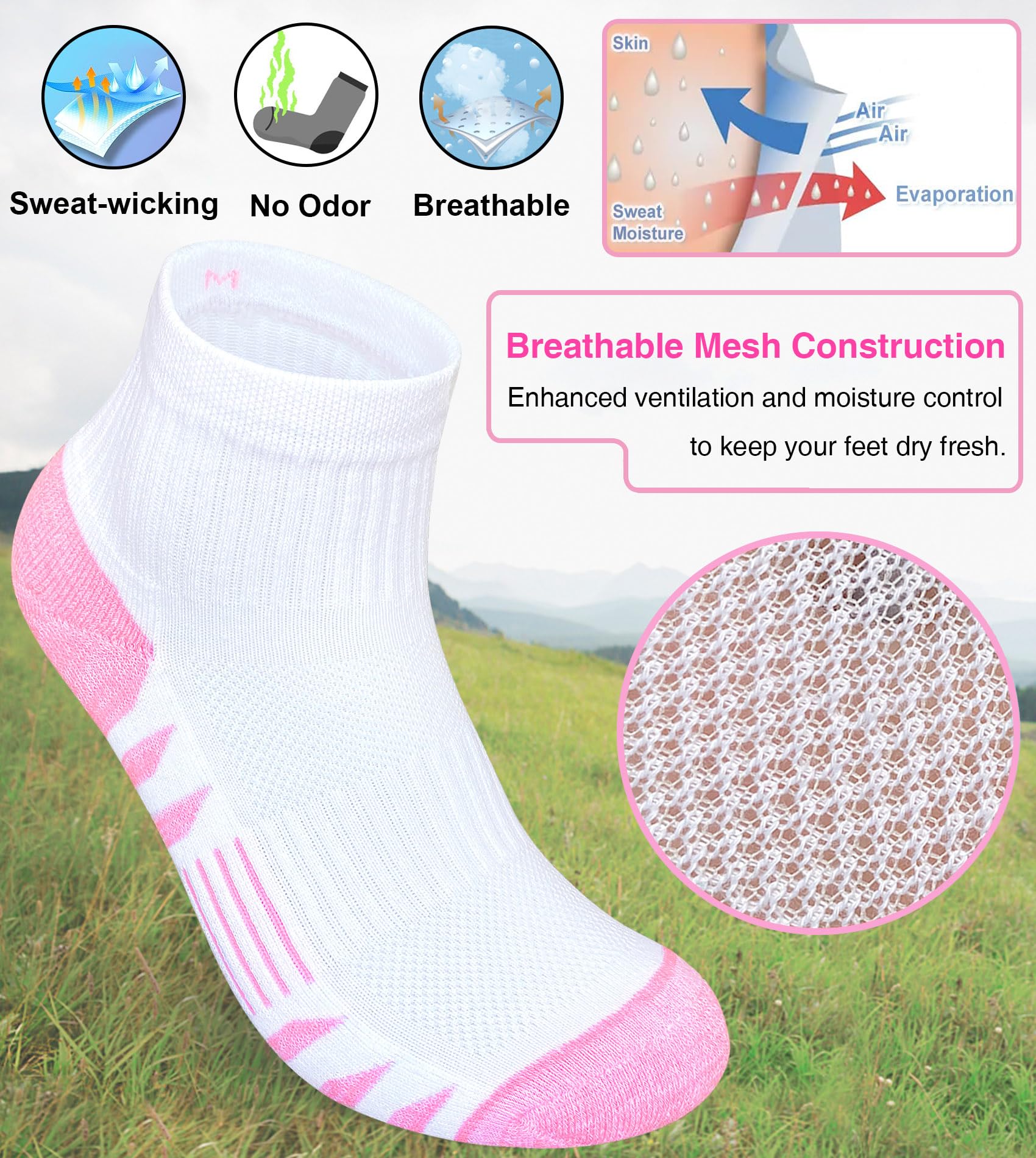 【Moisture Wicking and Anti-odor】Made of high quality combed cotton and moisture control fibers for extra softness and comfort while retaining sweat-wicking properties. Breathable mesh helps to ventilate release the heat, keep feet dry and fresh whole day