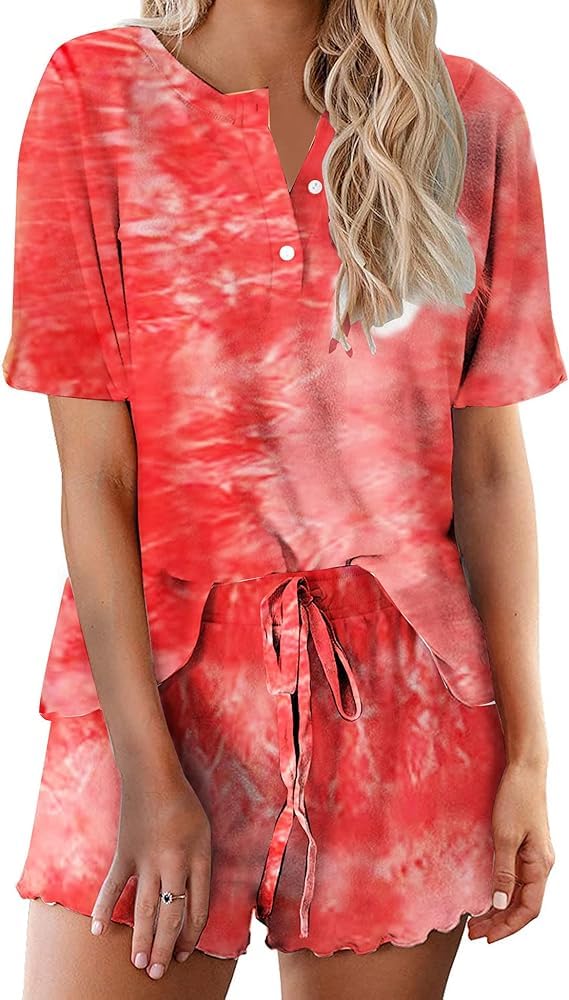 [Women Two Piece Pajama Set]: Soft and comfy loungewear nightwear fits for all seasons. Sleep in the daily casual Short Sleeve PJs is not only ultra-comfortable but also stylish. Jersey material feels as smooth & light as air breathing on your skin. Classic crewneck with buttons, elastic drawstring waistband is easy to dress up or down; New chic tie dye patterned, suitbale for working/ relaxing at home, lounging out or dreaming under the sunshine