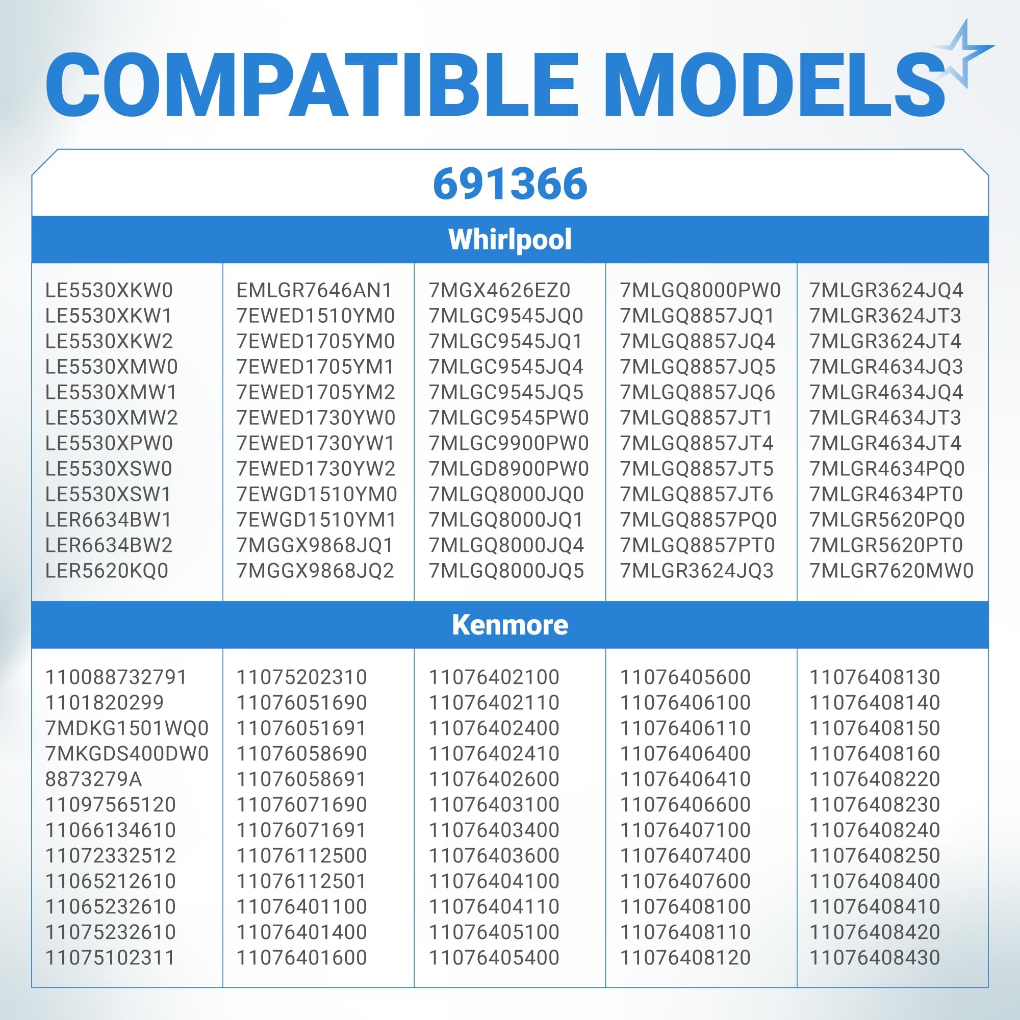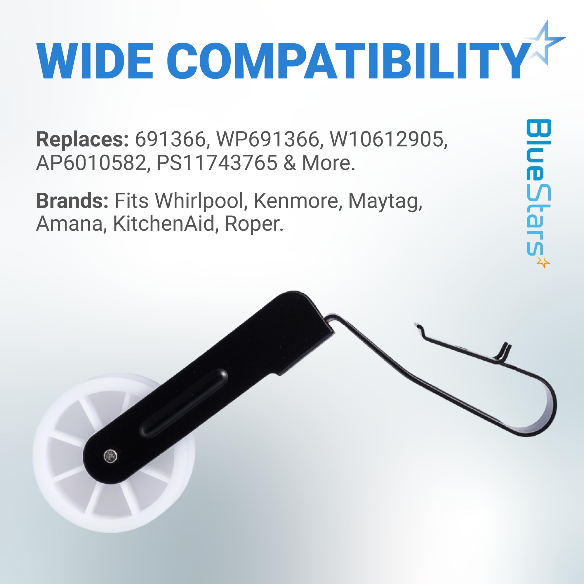 EASY TO INSTALL: Compatible with most top name brands (Kenmore, Whirlpool, KitchenAid, Roper, Estate, Crosley, Inglis, Maytag, Amana, Admiral, Magic Chef), and replaces part numbers: PS11743765, AP6010582, 20061033, 20064638, 239477, 26000691366, 337116, 337407, 337510, 3388345, 338946, 3394332, 339465, 347034, 347226, 347277, 4319391, 688166, 691366, 8207, 99989677, W10612905, WP691366VP, WP691366