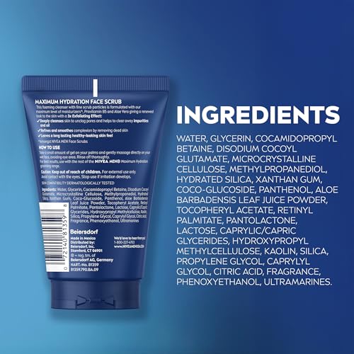 NIVEA MEN Maximum Hydration Face Scrub deeply cleanses to unclog pores. This foaming face cleanser with fine scrub particles is formulated with our maximum level of moisturizers*, Provitamin B5 and Aloe Vera, giving a renewed look to the skin. The facial scrub has a 3X exfoliating effect that (1) deeply cleanses skin to unclog pores and helps clear away impurities and oil (2) refines and smooths complexion by removing dead skin and (3) leaves long-lasting, healthy-feeling skin. This face scrub for men is dermatologically tested for skin compatibility. An exfoliating face wash is a key part of a skincare routine, and NIVEA MEN facial scrub for men pairs well with NIVEA MEN Maximum Hydration Face Lotion with Broad Spectrum SPF 15 Sunscreen as part of a daily skincare regimen. To use, gently massage a small amount of exfoliating face scrub directly on wet face, avoiding the eye area, and rinse thoroughly. NIVEA MEN is a trusted leader in skin care products, with more than 110 years of expertise. *Among NIVEA MEN face scrubs