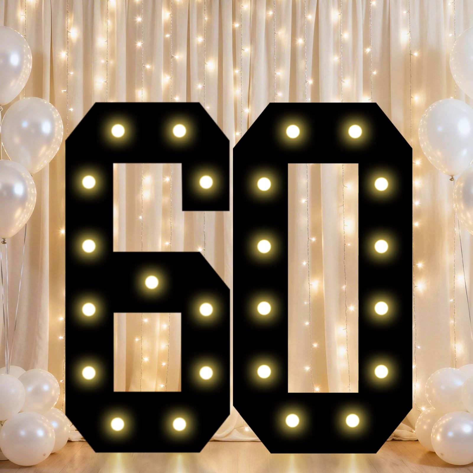 Giant Black 2.4 Feet Marquee Numbers with LED Lights: Mosaic numbers designed with warm white LED string lights. Giant LED numbers can be powered by 3 AA batteries (Not Included), convenient for all kinds of party decoration