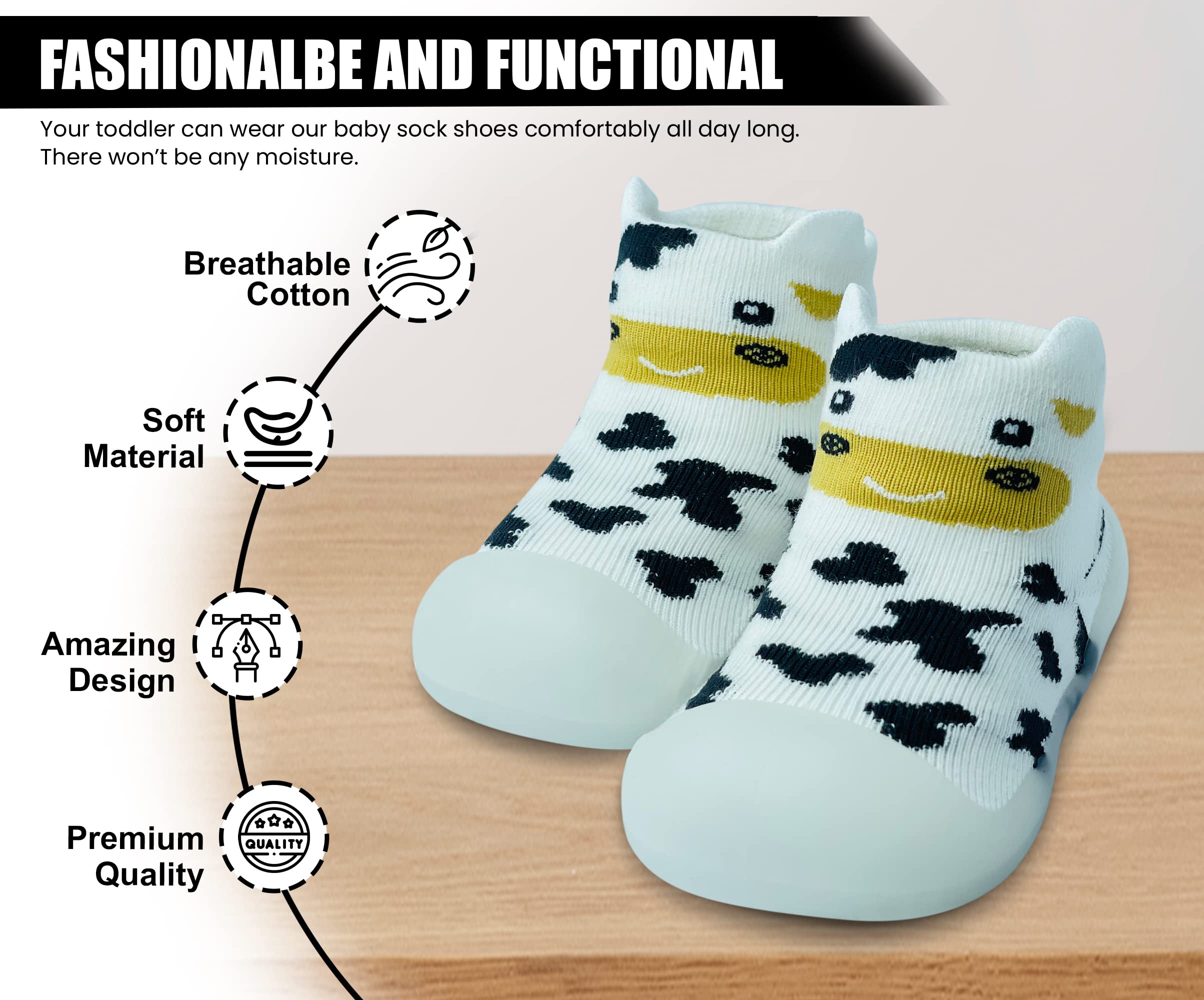BREATHABLE DESIGN - The upper part of the baby walking shoes, knitted with high quality cotton material, allows your child's feet to breathe. Your toddler can wear our baby sock shoes comfortably all day long. There won’t be any moisture. Our baby sneakers keep warm in winter and cool in summer. It can be used comfortably in all seasons.
