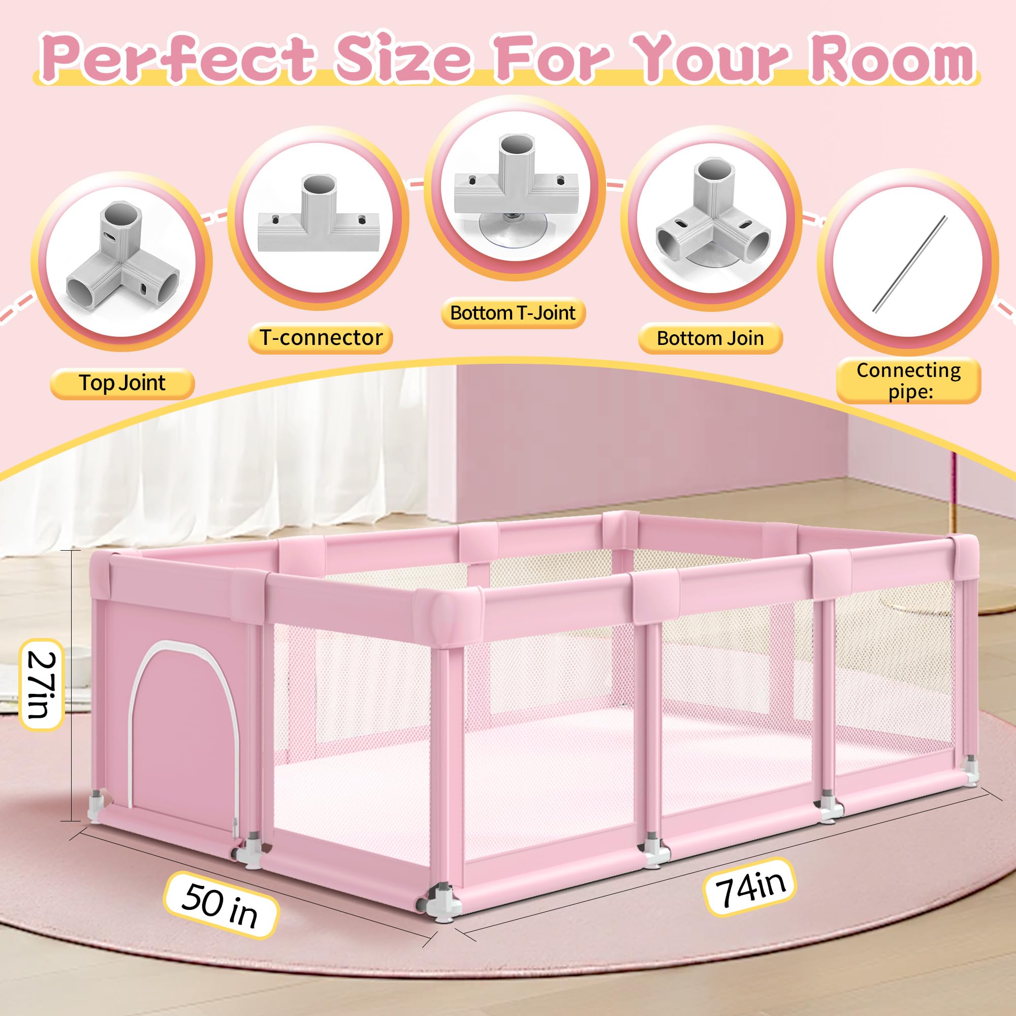 Baby's Favorite Play Space - Our baby's fence with dimensions of 74*50*27 inches (Larger than the 50*50*27 fence), provides safe and big space for babies to play and enough height for toddlers to train stand and walk. Give your children an exclusive amusement park.