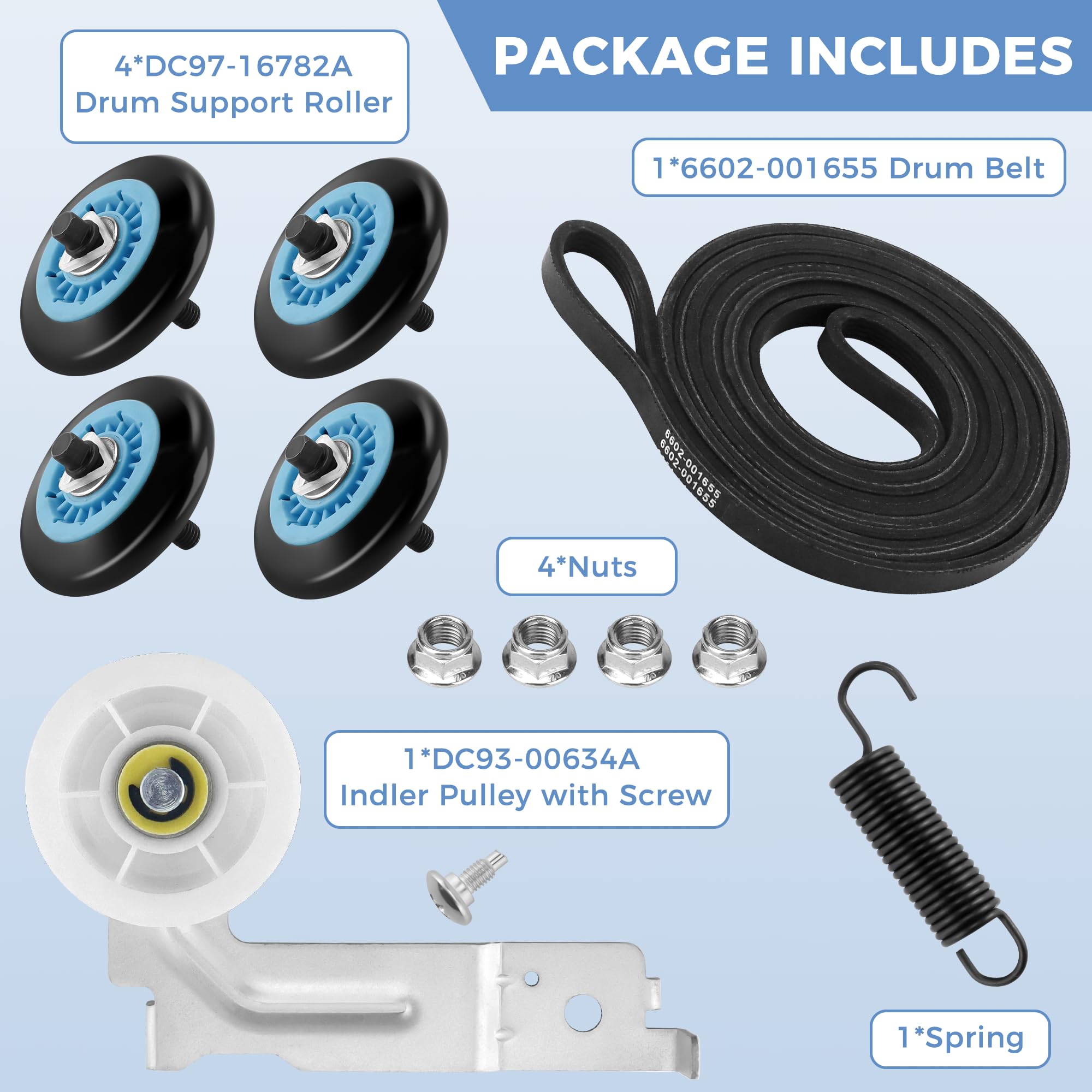 DC97-16782A Kit Includes- 4 × DC97-16782A upgraded dryer drum roller (includes roller wheel and roller axle), 1 × 6602-001655 dryer drum drive belt ( 0.3in Width,92 in Long ), 1 x DC93-00634A dryer idler pulley assembly (1 screw and 1 Spring include). extensive compitible for samsung dryers