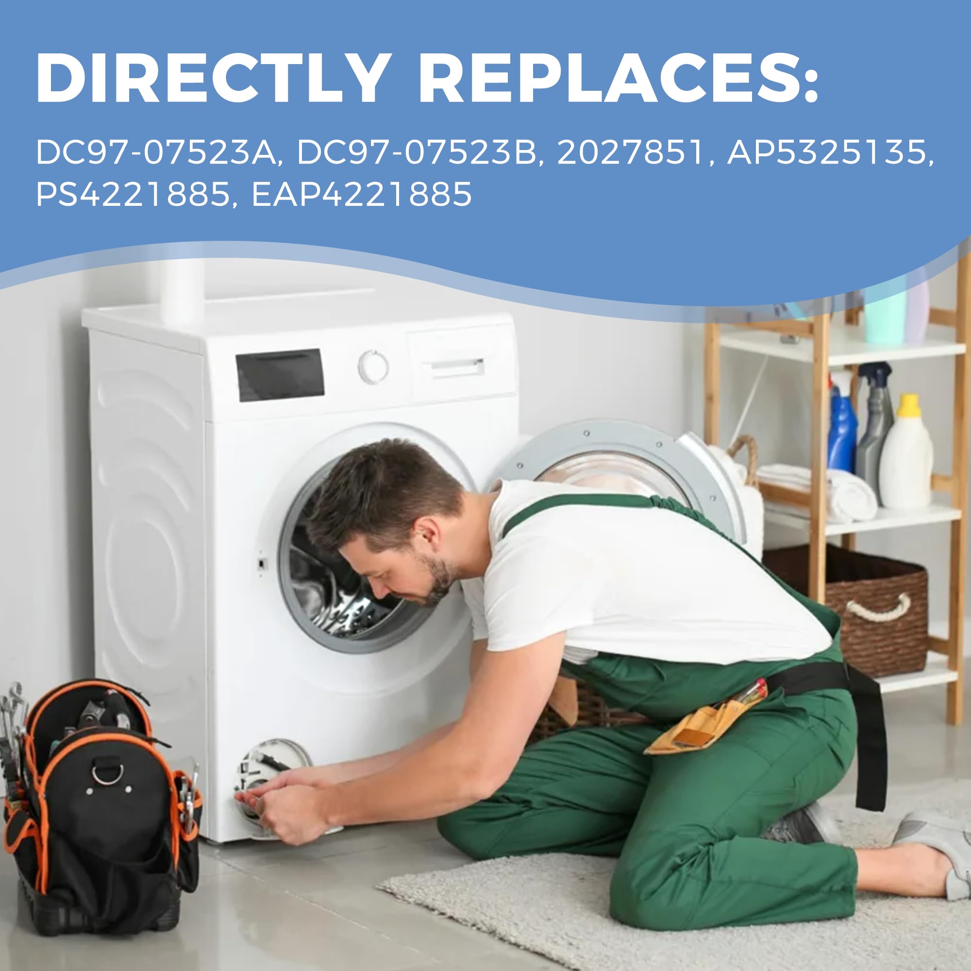 Extensive Fit- 1. dc97-16782a Drum Roller Replaces dc97-07523a, dc97-07523b, 2027851, ap5325135, ps4221885, eap4221885. 2. 6602-001655 Dryer Drum Drive Belt Replaces 5ph2337, 6602-001314, 1935594, ap4373659, ps2407938, eap2407938. 3. dc93-00634a Dryer Idler Pulley Assembly Replaces dc96-00882b, dc96-00882c, dc97-07509b, 4455850, ap6038887, ps11771601, eap1177160. and Compatible for Almost all Samsung dryer. Our dryer repair kits are your best choice!