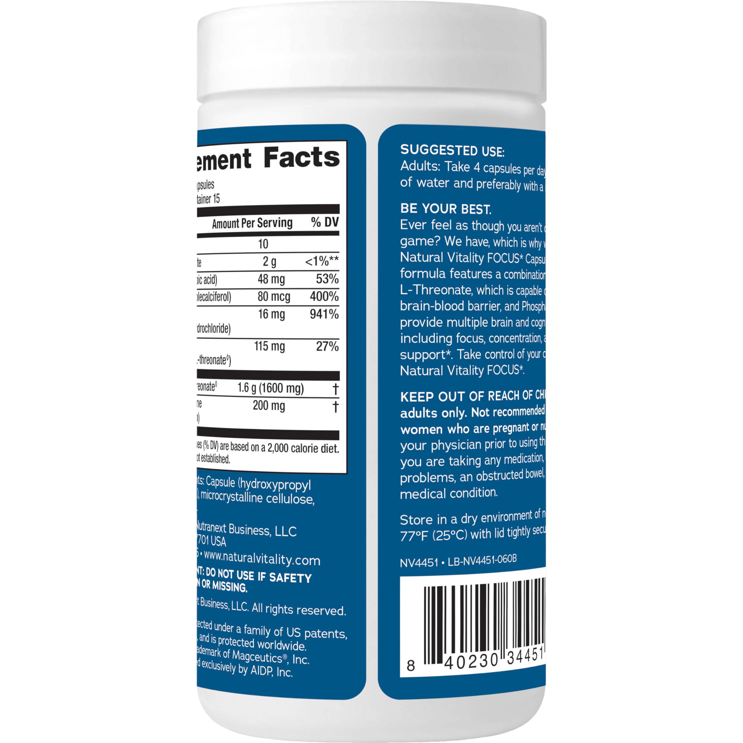 Natural Vitality FOCUS Supplement is formulated with 1600 mg of magnesium L-threonate. In addition, this dietary supplement features phosphatidylserine to provide support. Natural Vitality FOCUS capsules are vegetarian, gluten-free and Non-GMO. As a daily supplement, adults can take four capsules daily, preferably with a meal.