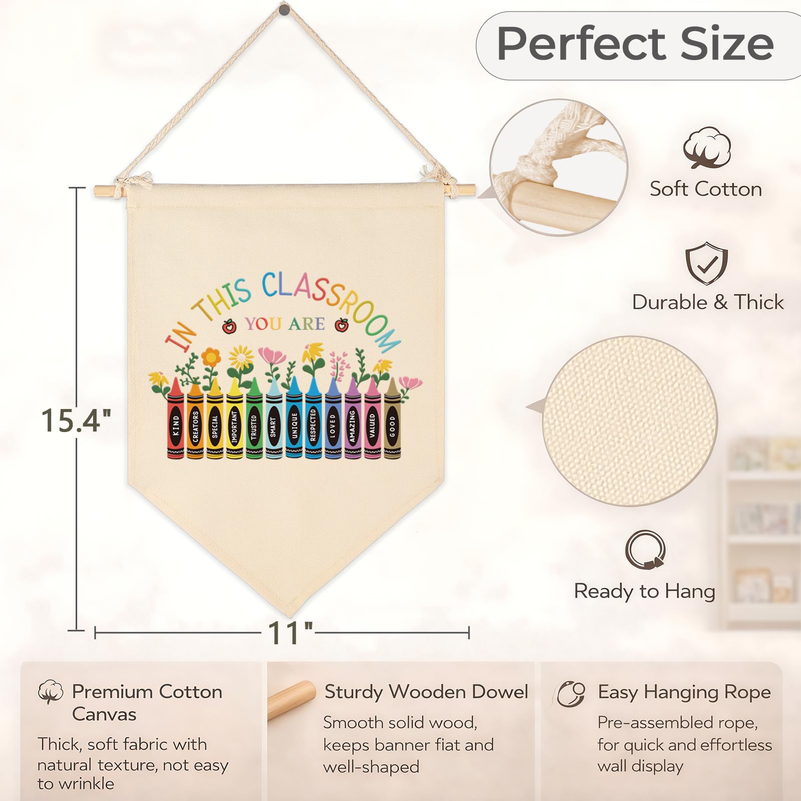 Create a space where every student feels they belong with our In This Classroom You Are Canvas Hanging Flag. Measuring 15.4 x 11 inches, this beautifully designed piece of wall art is a staple for modern educational environments—from cheerful kindergarten rooms to professional school counseling offices. By highlighting essential values such as being "Trusted," "Smart," and "Loved," this banner serves as a daily visual reminder of a student's worth and potential. Made from premium, heavy-duty cotton canvas and supported by a sturdy 11-inch wooden dowel, this high-quality banner is built to be a lasting centerpiece in any school setting. Whether you are welcoming a new class or looking for a thoughtful gift for a fellow educator, this ready-to-hang pennant flag provides the perfect blend of aesthetic joy and professional encouragement.