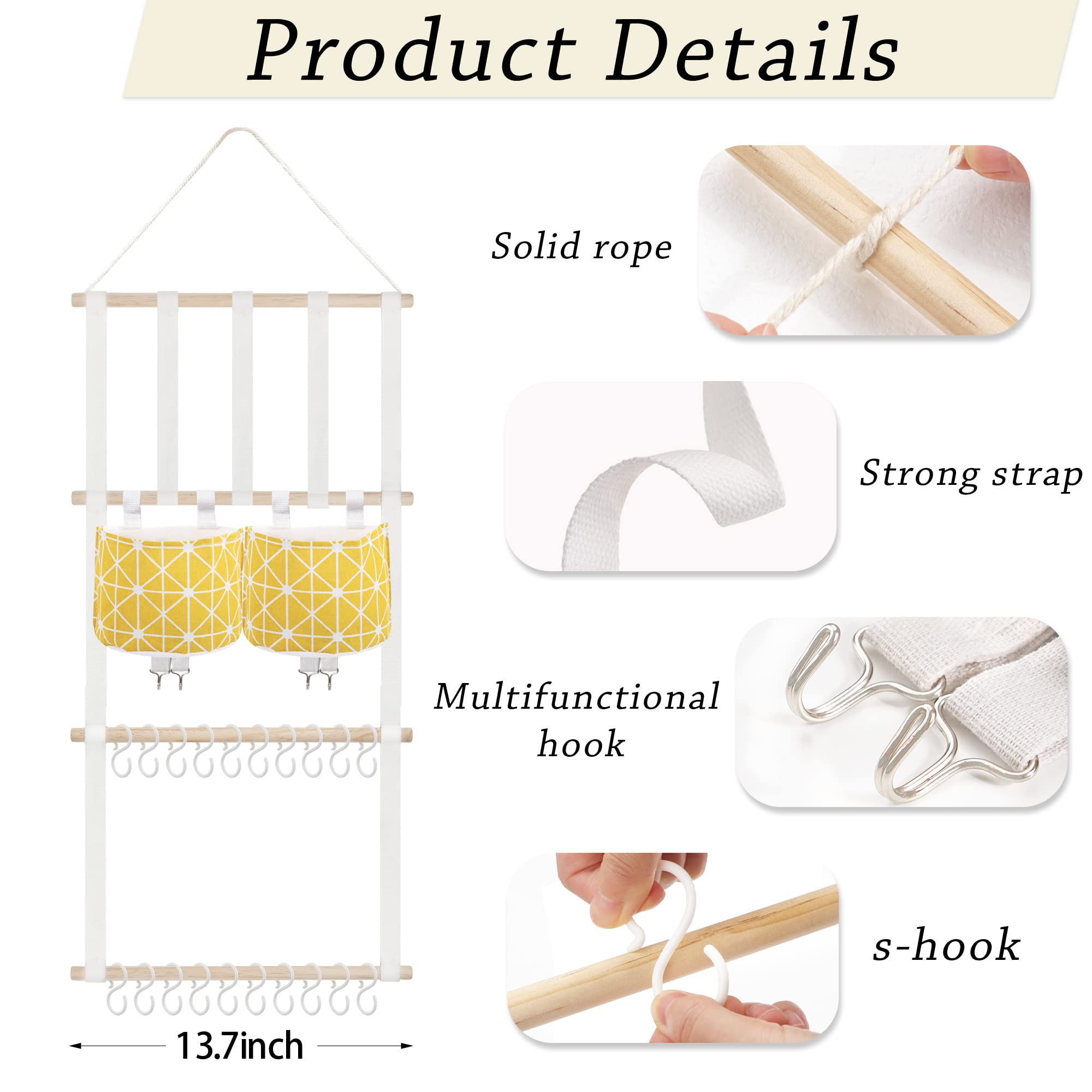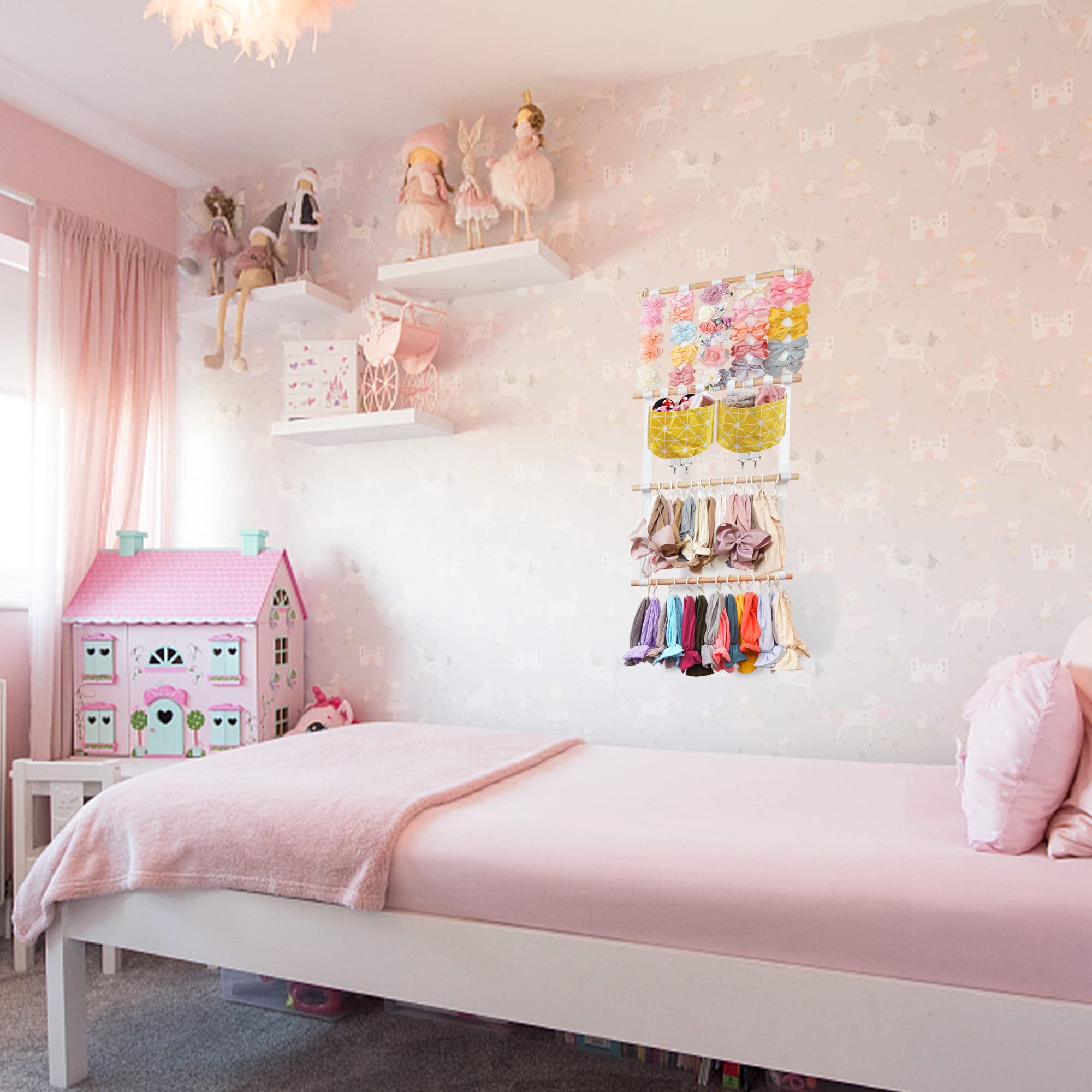 【High Quality Materials】- The plastic S-hook of the bow hanger for girls hair bows is very suitable for storing baby headbands and is not easy to fall off. The storage pocket is made of high-quality cotton canvas and has good load-bearing capacity. The wooden stick is very smooth and sturdy, not easily deformed or cracked, making it more durable.