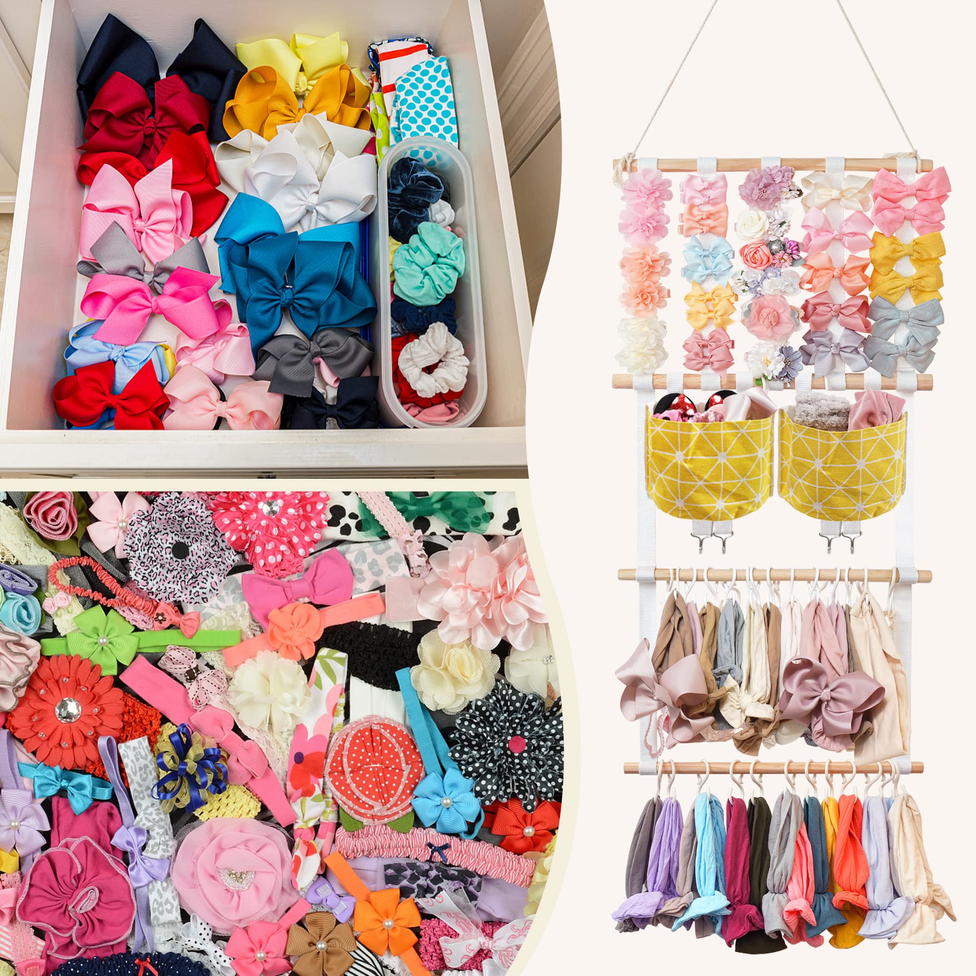 【 Practical Pockets Storage 】- The newly designed baby bow organizer has added 2 super practical pockets, which can better store small items such as baby clips, small hair ties, tiny baby toys, keys, etc. It can also store small items that cannot be hung, practical and beautiful.