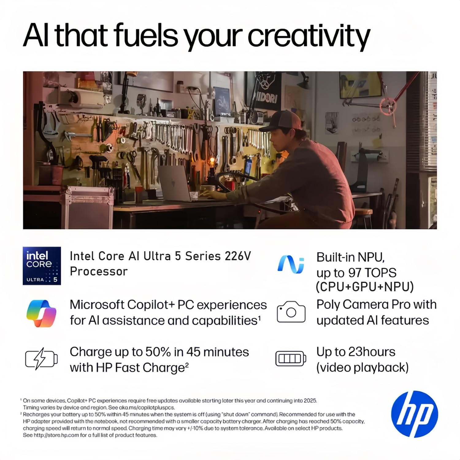 All-Day Battery & AI-Enhanced Productivity: Work or play for up to 23 hours on a single charge. Leverage Copilot+ PC features and the HP AI Companion app for AI-powered tools like Paint Cocreator (text-to-image generation) and Live Captions (real-time subtitles) to boost creativity and efficiency