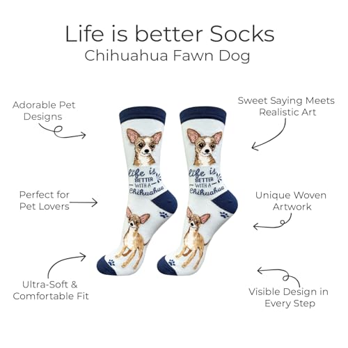 Description Introducing our collection of adorable and vibrant pet lover socks designed exclusively for pet lovers! These funny socks are the epitome of cuteness and novelty, guaranteed to bring a smile to your face. Big image of dog head woven on both sides on the socks and full body image woven on the bottom of the socks with a cute saying that says life is better with Dog. These socks are made in South Korea, These funny socks are made from 200 needle count machines which give life-like detail of your favorite pet. Step up your sock game with our adorable and hilarious Dog Socks, designed especially for pet lovers! These novelty socks are the perfect addition to your collection, featuring cute and silly designs that are bound to make you smile. Made with high-quality materials, these fun socks offer both comfort and style. They add a playful and fashionable touch to your everyday outfits, whether you're dressing up or keeping it casual. Whether you're a dog mom, a dog dad, or simply a dog lover, these socks are a must-have. With their delightful designs and comfortable fit, these socks are a fashionable treat for pet lovers and make great novelty gifts and dog mom gifts.