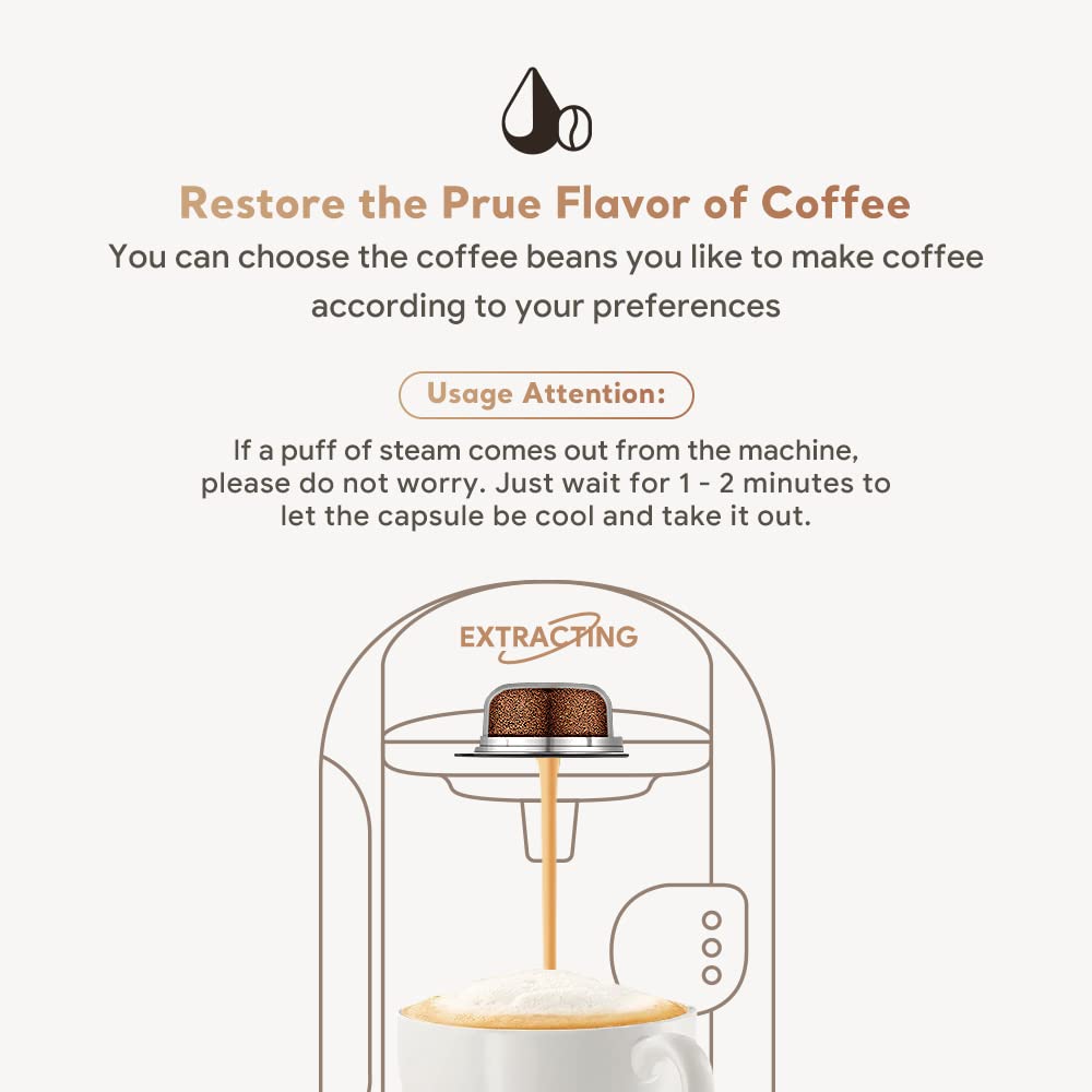☕【EASY TO USE】Add your favorite fine coffee powder into the capsule, squeeze it lightly and unscrew the lid, put it in the machine and enjoy your coffee after a few minutes. Please make sure that the ground coffee does not exceed the maximum mark and do not press it too hard.