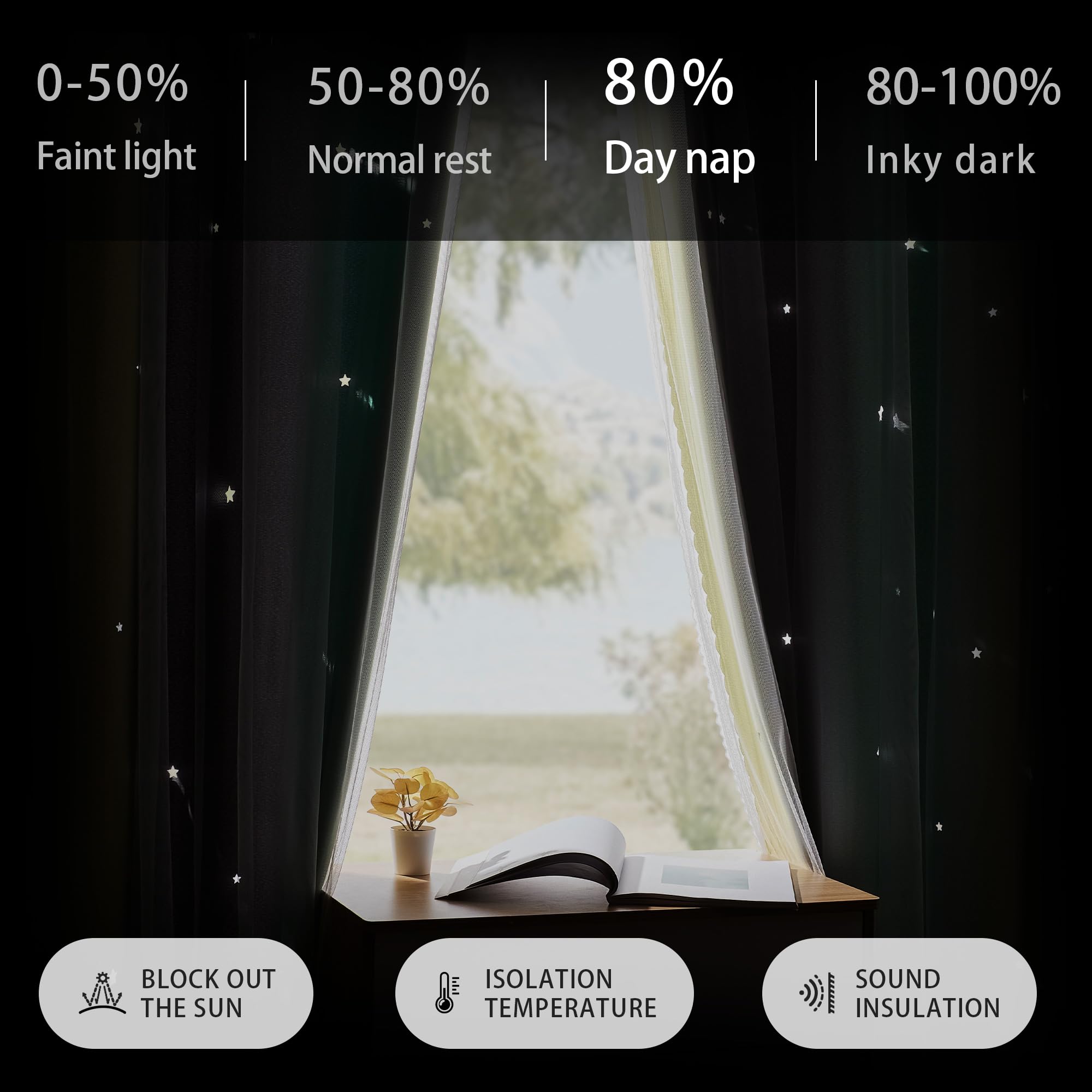 UNIQUE DESIGN: Hollow out star curtains forming a dream starry sky in your room, giving beautiful and romantic look even viewing from outside, perfect for your living room bedroom study kids bedroom. Imagine the fantastic feeling of the stars falling on your bed, floor, all over the room.