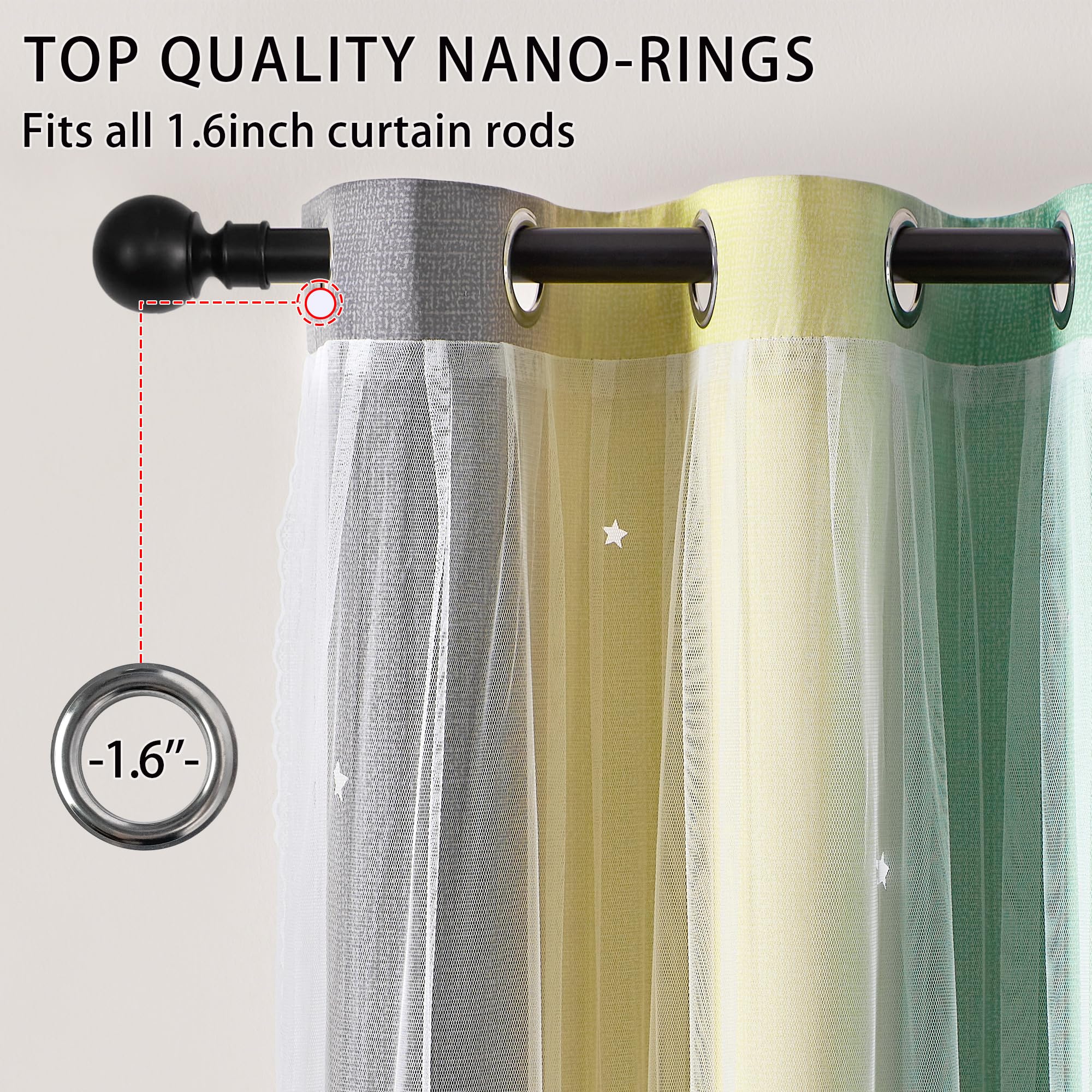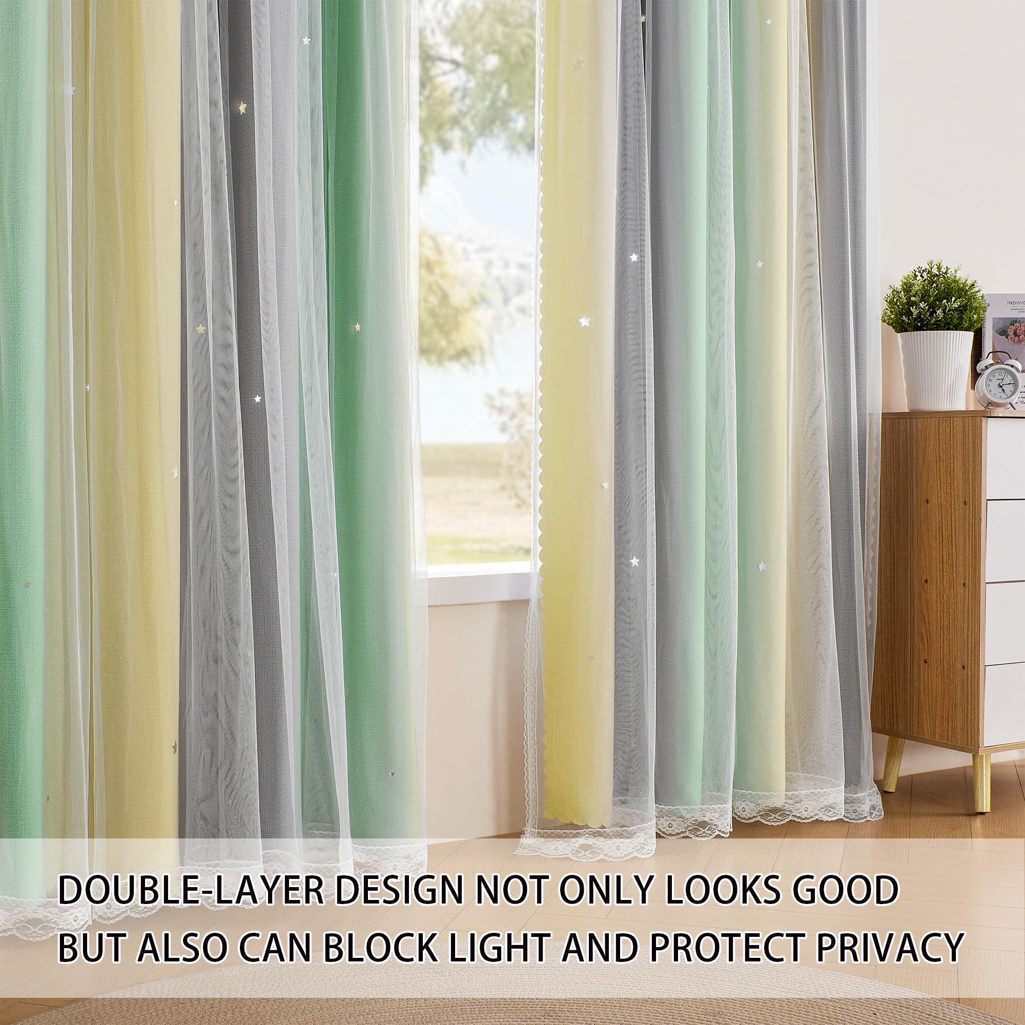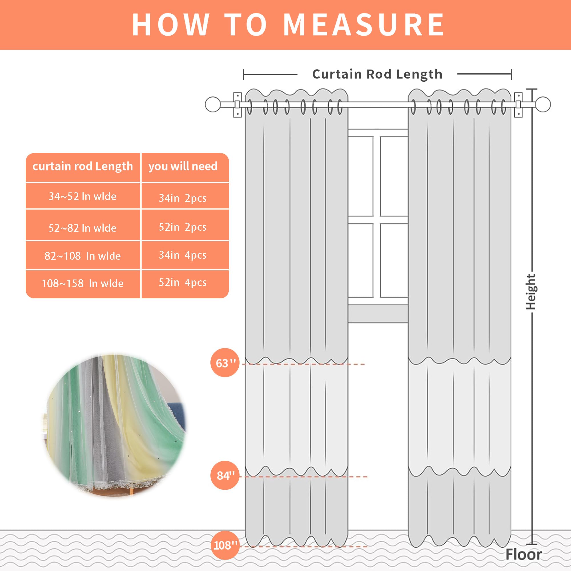 PACKAGE INFORMATION: The package include 2 panels curtain come with 2 tiebacks. Each panel has both the 1 layer of tulle attached 1 layer of colorful star curtain. Grommets top(1.6 inch inner diameter), each curtain measures 52 inches wide, more length for you choose.