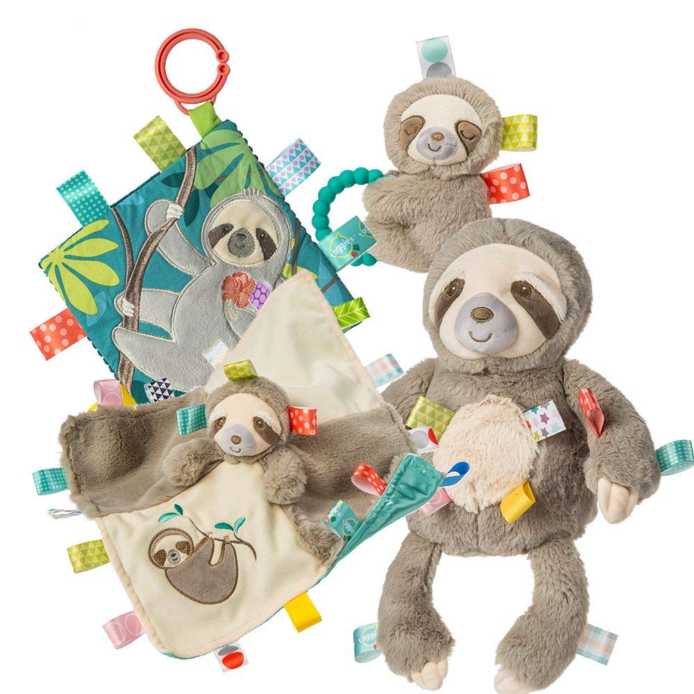 Part rattle, part teether equals fun and comfort for little ones. Soft Molasses Sloth gives baby soft fabric to hold onto, squeeze and shake. The attached baby-safe silicone teether is fun to hold and chew. Sloth has sleepy embroidered eyes for total softness and is adorned with interactive and soothing satin loop tags that babies love to explore. Taggies was born when a mom noticed her child's fascination with satin tags, and blossomed into a world of treasured products. Exploring Taggies textured tags can provide tactile stimulation that babies crave for development and have an amazing calming effect on little ones. Taggies Signature Collection is recognized as the premium line of wonderfully soft and soothing Taggies toys made by Mary Meyer.