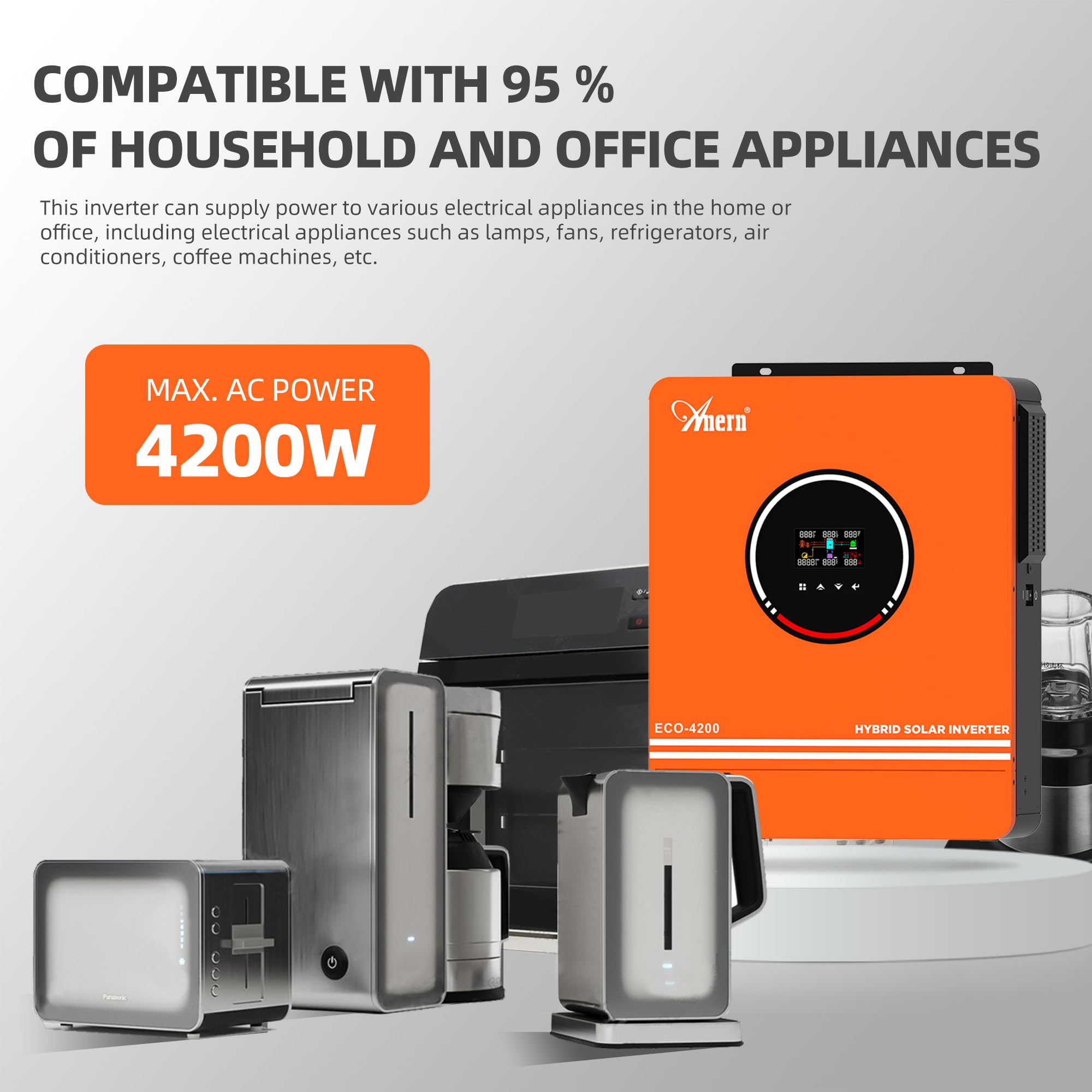 【PURE SINE WAVE INVERTER】4200W Off-Grid Solar Inverter, 24V, Built-in 120A MPPT Charge Controller, Pure Sine Wave Inverter, Single-phase Output 230VAC. This new 4.2kw All-In-One inverter combines the functions of an inverter, solar charger, and battery charger, offering uninterrupted power support in a single package. The inverter supports operation without a battery.