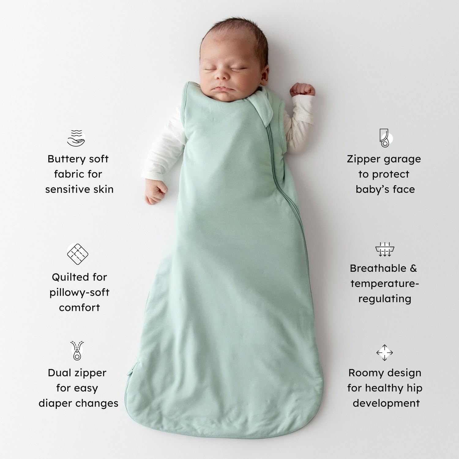 Easy and simple to use; Feature a double zipper that zips from neck down or bottom up making night time diaper changes easy and fuss free; Top zipper has an enclosure over it to reduce risk of choking or scratches on the face