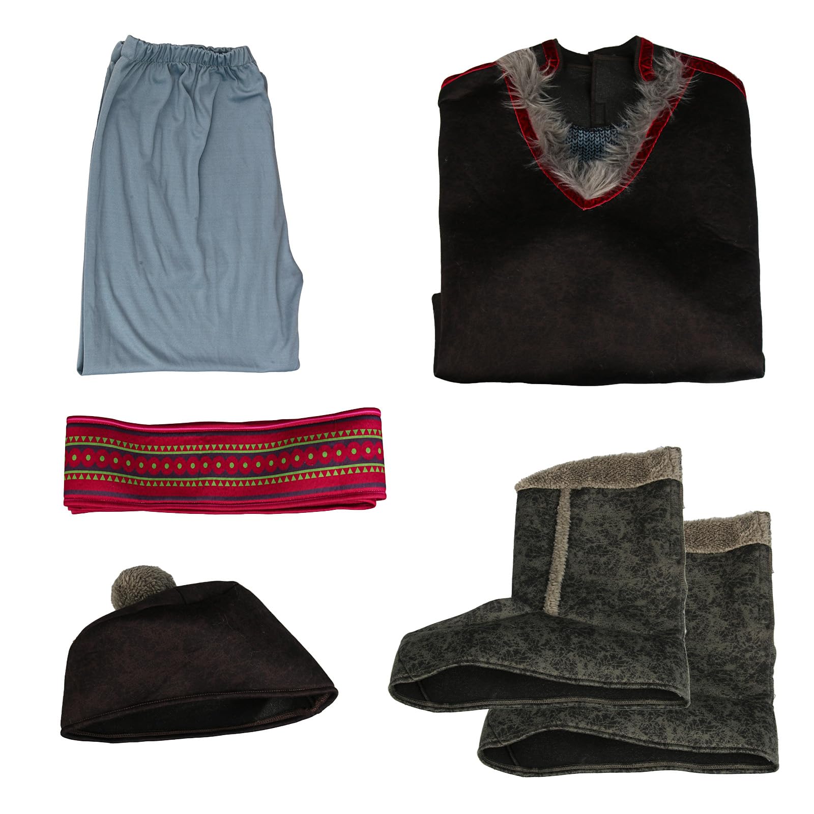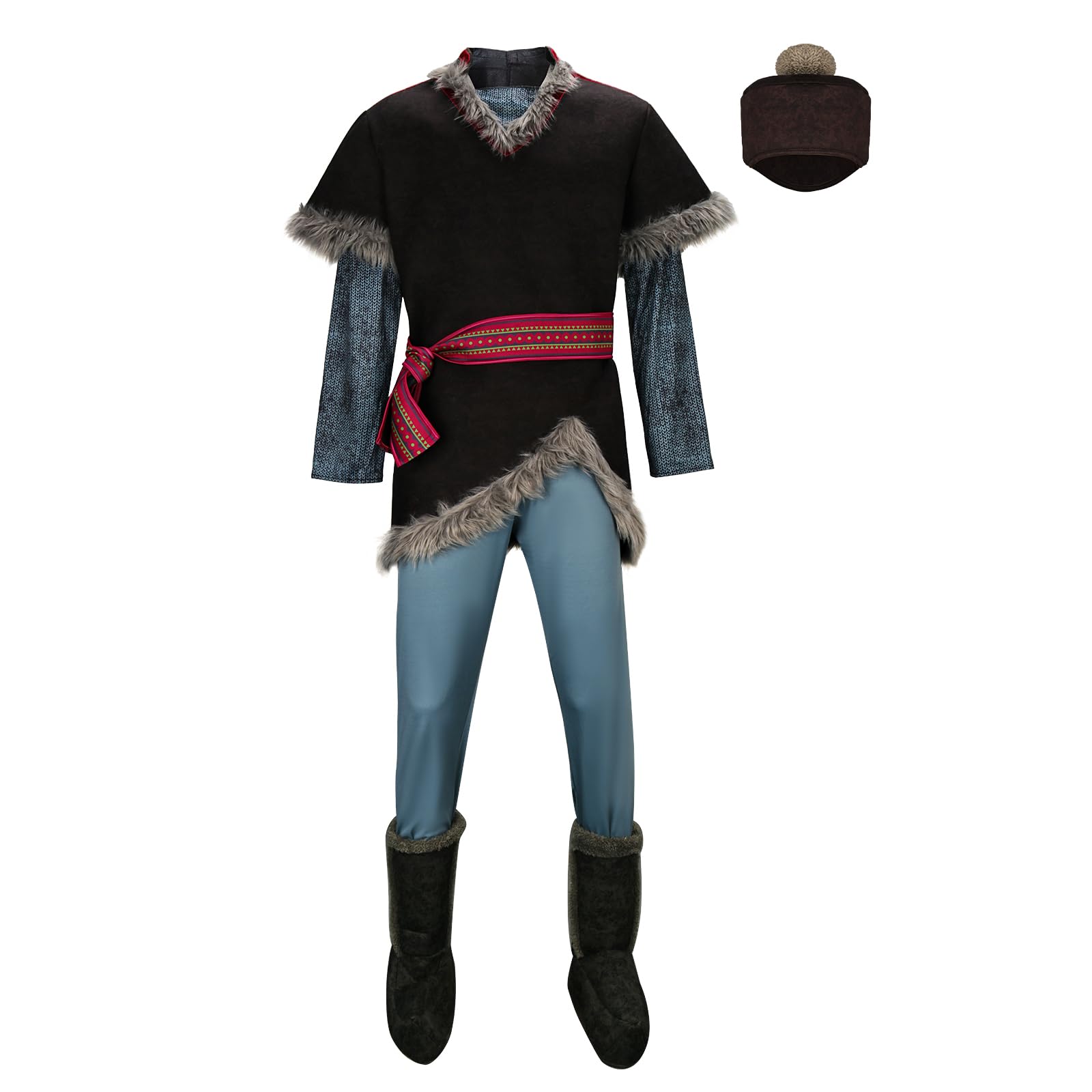 Package includes: 1 x long sleeve tunic top, 1 x belt, 1 x hat, a pair of pants, a pair of boot covers.