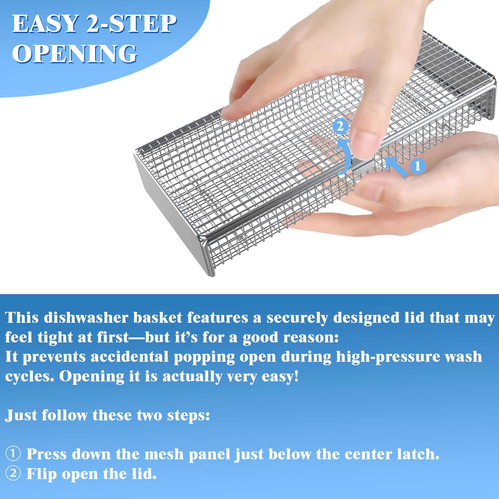 One-Touch Press & Universal Fit β Simple, Safe & Compatible Opens effortlessly with a gentle pressβnail-friendly and finger-safe, even for those with manicures. The basket measures 11.0" Γ 4.7"Γ 1.9" and fits most standard dishwashers. The raised base improves drainage while this dishwasher utensil basket integrates seamlessly with your dish rack.