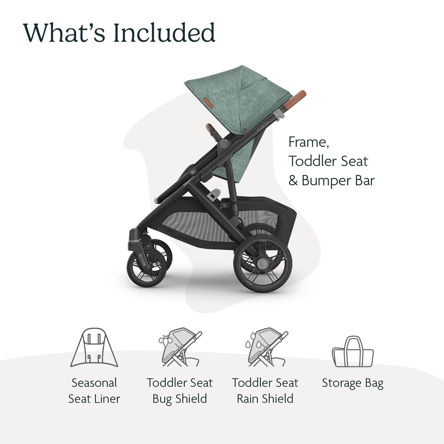 With its intuitive design and over 30 ways to customize your ride, the reimagined Vista V3 Stroller was designed to effortlessly fit every growing family, from first child to last. Starting as a single stroller, it easily transforms to accommodate up to three children, offering the epitome of portability and convenience. The Vista V3 provides the most premium ride through every season. - Effortlessly folds in one simple step & stands when folded for compact storage - Extendable, water-repellent UPF 50+ canopy and easy-to-peek window for added air flow - Extra-large, easy-access basket with 30 lb. weight limit to easily store all your essentials while strolling - Premium fabrics and full-grain REACH certified leather details - The Bassinet, Mesa, and Aria Infant Car Seats attach directly to stroller without adapters to create a from-birth solution Toddler Seat / Frame - Effortlessly folds in one simple step & stands when folded for compact storage - Extendable, water-repellent UPF 50+ canopy and easy-to-peek window for added air flow - Extra-large, easy-access basket with 30 lb. weight limit to easily store all your essentials while strolling - Premium fabrics and full-grain REACH certified leather details - Never flat tires for durability and smooth strolling through various terrain - Reflective trims on wheels and basket to enhance visibility while strolling - Ability to transport up to three children with RumbleSeat and PiggyBack accessories - One-handed multi-position recline for those resting strolls - Extendable water-repellant canopy with UPF 50+ protection, zip-out fabric, and mesh panels with covering for added protection for any weather - One-hand, adjustable handlebar to better accommodate different heights - Front wheel locks with visual indicators for parents peace of mind - Adjustable footrest positions feet and legs comfortably as they grow - GREENGAURD Gold certified to suppose healthier air quality & low chemical emissions