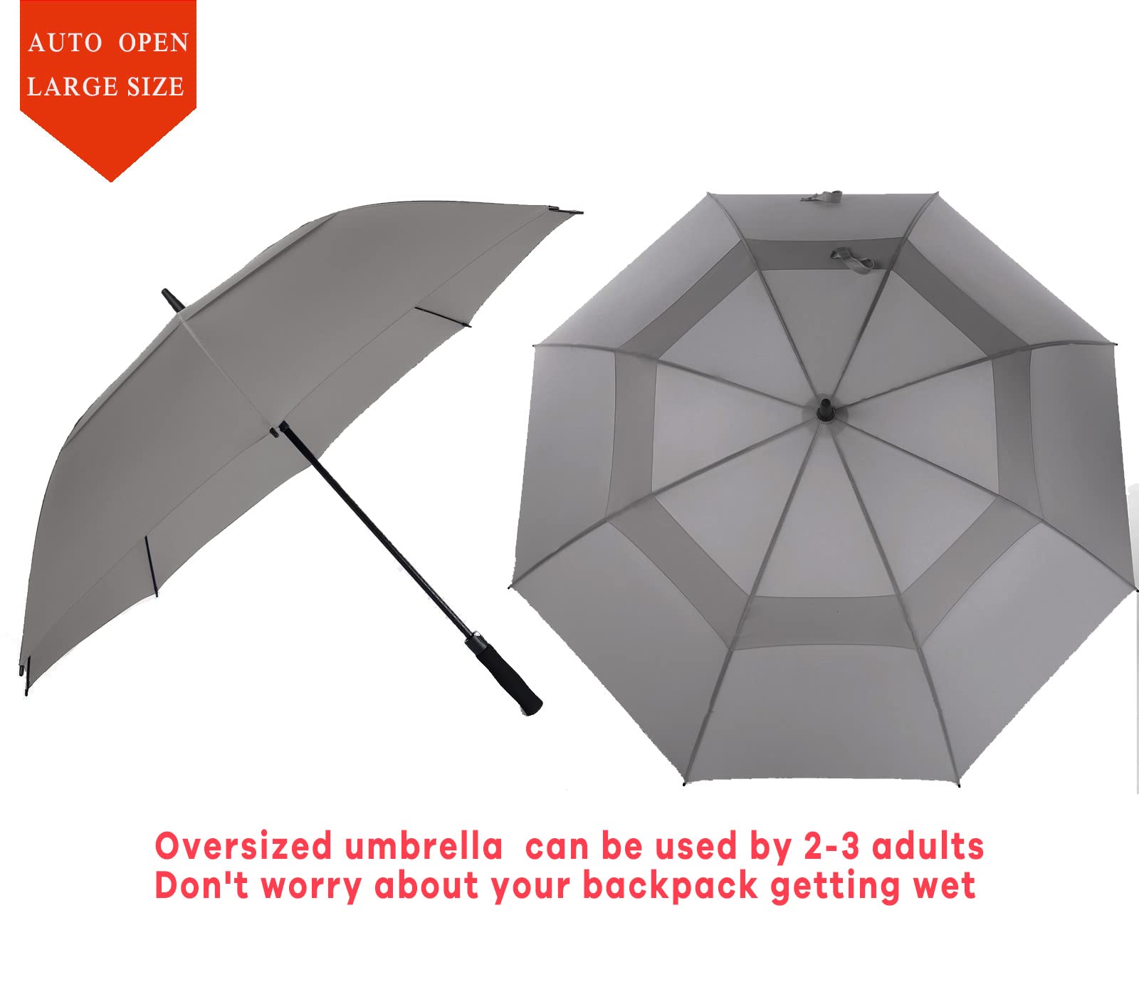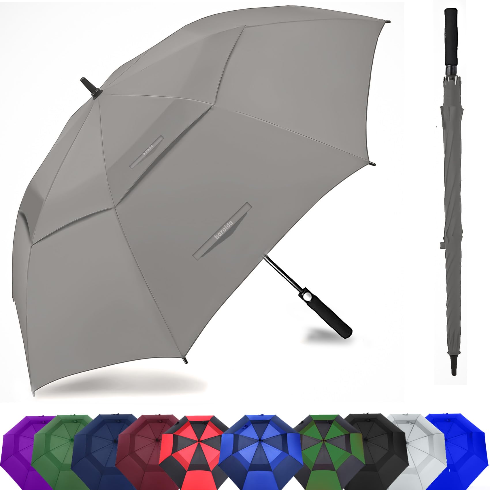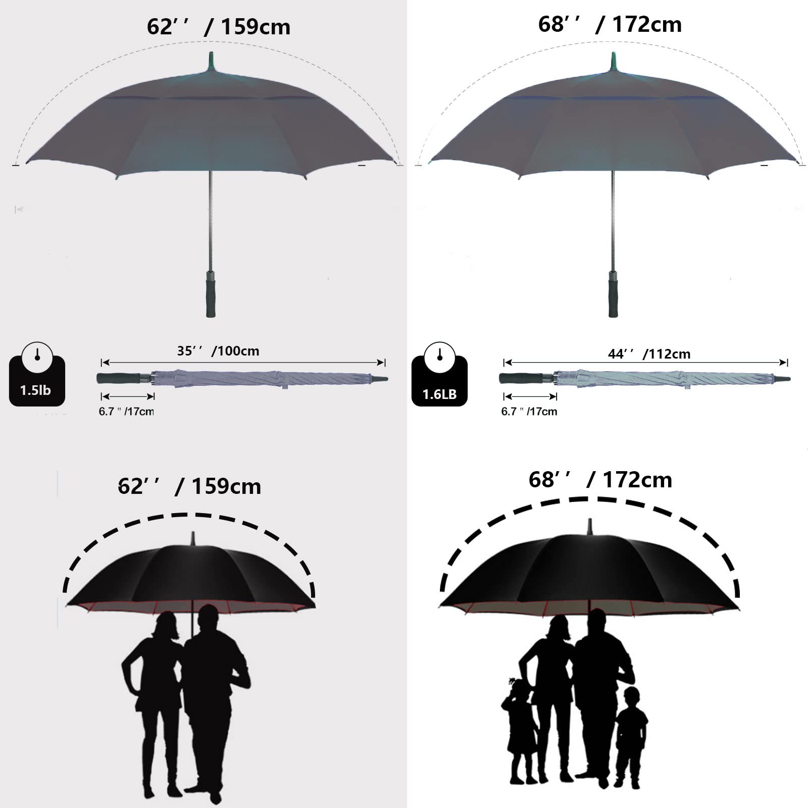 ☂54"/62″/68″INCH EXTRA-LARGE GOLF UMBRELLA: 54" fit 1~2 people(lightweight); 62" fit 2~3 people(large); 68" fit 3~4 people(huge); The BARAIDA large Golf Umbrella will protect you from anything that mother nature can throw at you; rain, hail or shine or wind. The canopy uses waterproof 210T pongee fabric. This silk derived material is lightweight, and water resistant with SPF 50+ protection.