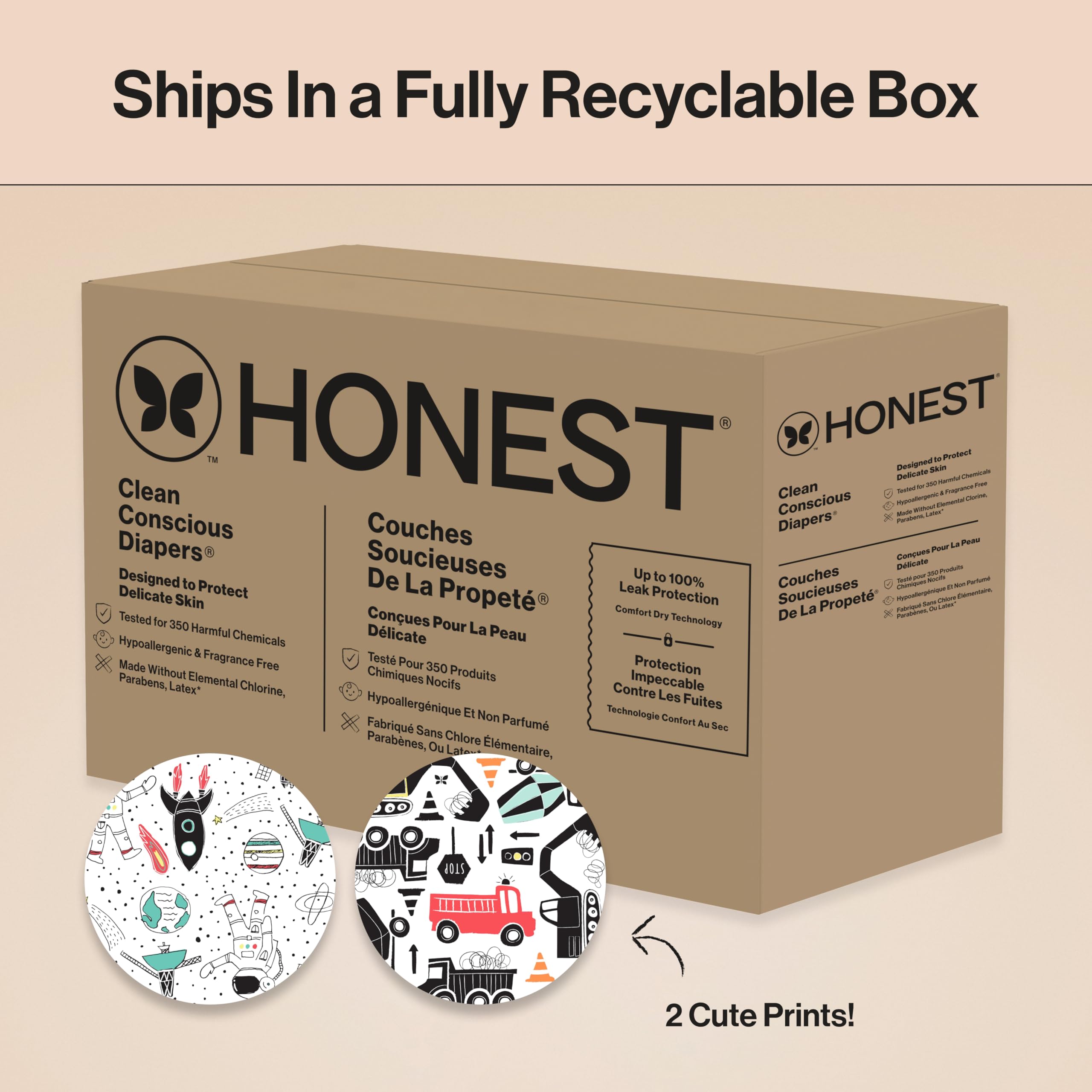 Designed to protect delicate skin, Honest Clean Conscious Diapers keep baby comfortable and dry through all the wiggles and wobbles! Our softest diaper yet delivers up to 100% leak protection with Comfort Dry Technology. The hypoallergenic, plant based inner liner, flexible stretch wings, super absorbent core, and channel technology provide a comfy, secure fit for all ages and stages. Because safety is top priority, these diapers are OEKO-TEX STANDARD 100 Certified, a 3rd party that tests for 350 harmful chemicals, and made with FSC Certified Fluff Pulp and other controlled materials. And for cuteness overload, each diaper features a super cute print!
